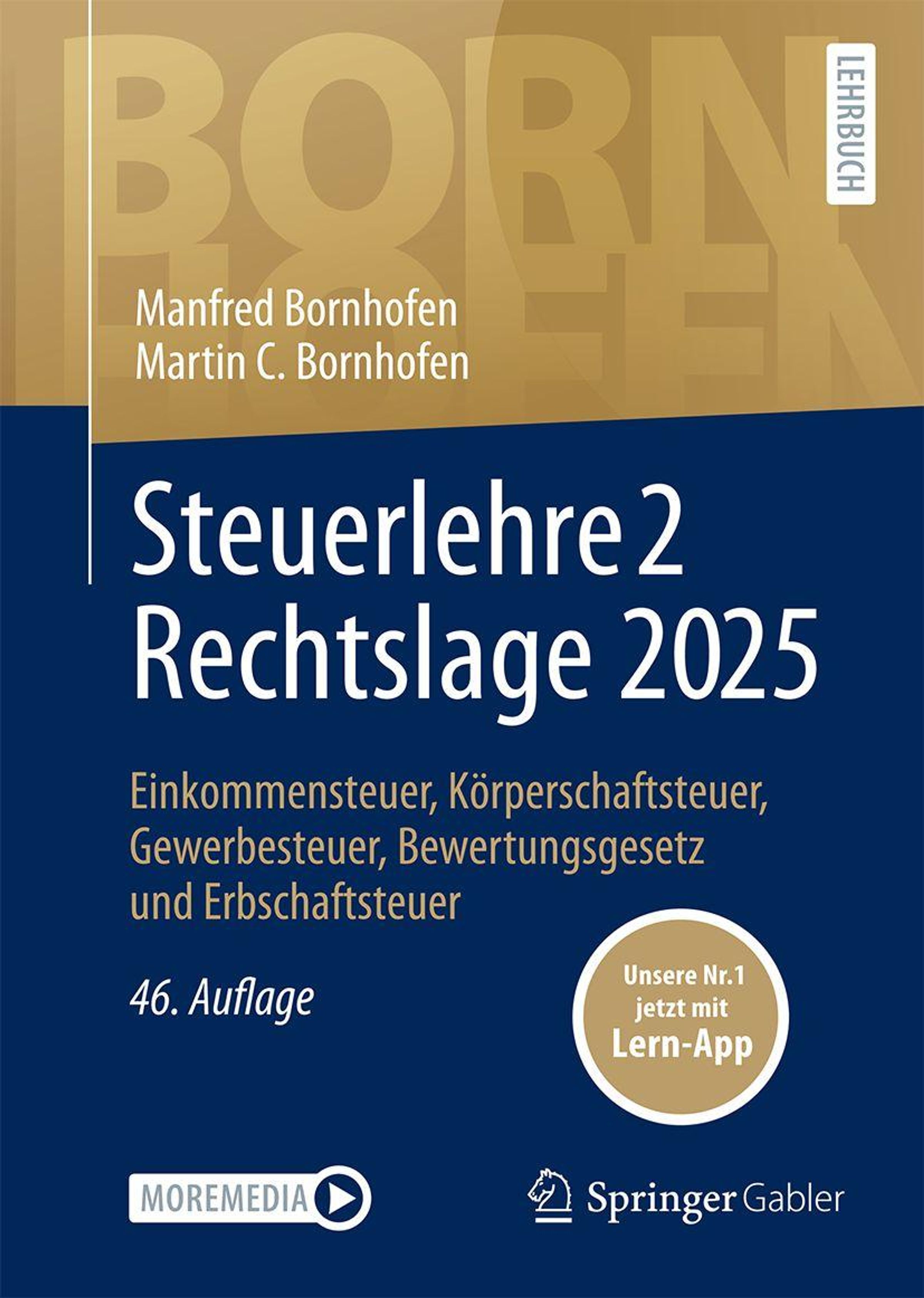 Aktuell mit der Lern-App Springer Nature Flashcards + eBook inside! Die Steuerlehre 2bietet Ihnen freien Zugang zu der Lern-App Springer Nature Flashcards. Diese App ermöglicht Ihnen interaktives Lernen und unterstützt Sie mit zusätzlichen Fragen beim Erfassen und Wiederholen der Lerninhalte. Zudem erscheint die gesamte Bornhofen Edition mit eBook inside, um Ihnen das digitale Arbeiten (z. B. durch Verlinkung mit weiterführenden Materialien) zu erleichtern -- relevante und innovative Mehrwerte für alle Lehrenden und Lernenden.