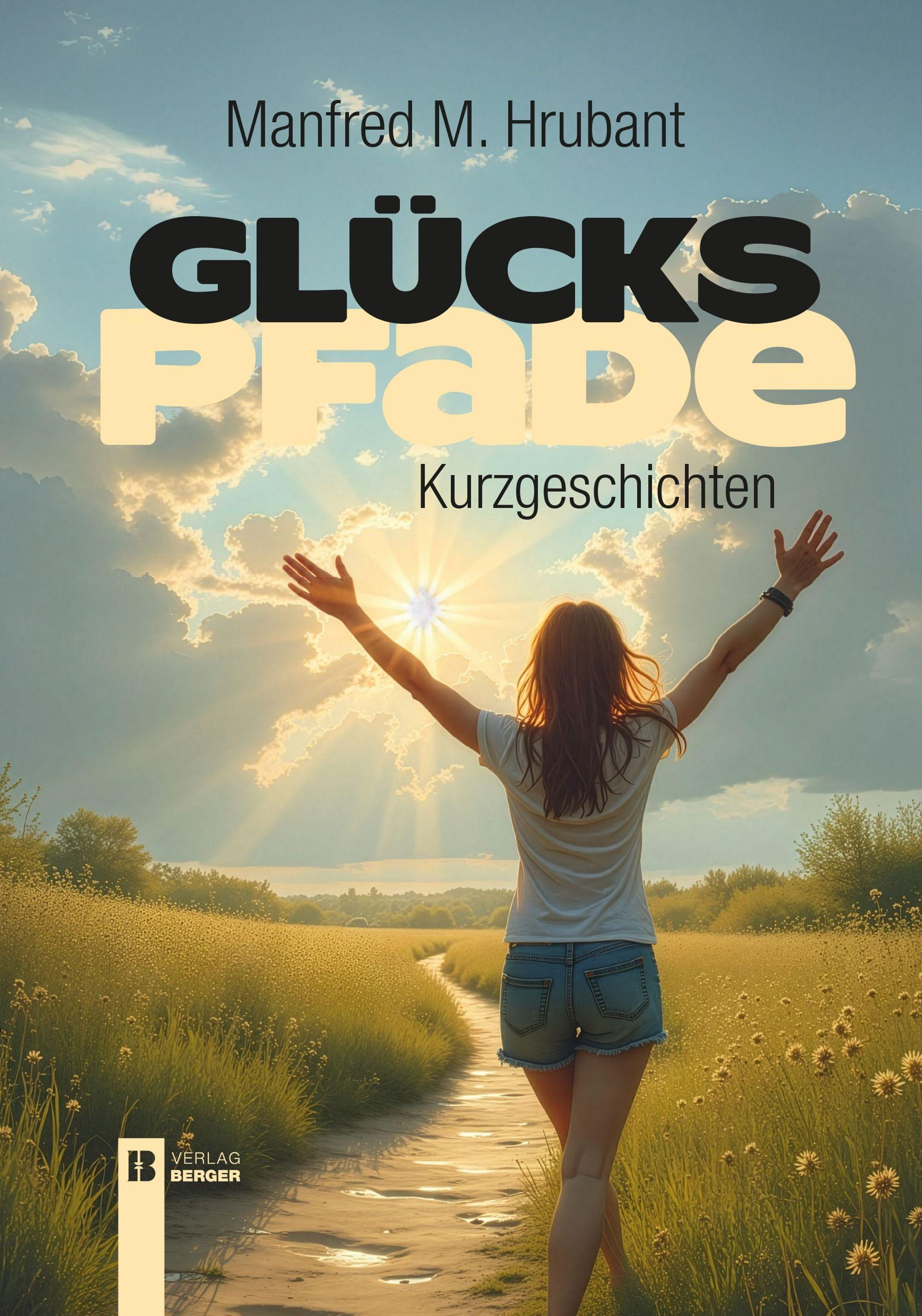 Text: "Manfred M. Hrubant, GLÜCKSPFADE, Kurzgeschichten." Eine Frau breitet die Arme aus, während sie einen Weg durch ein Feld geht., Buch