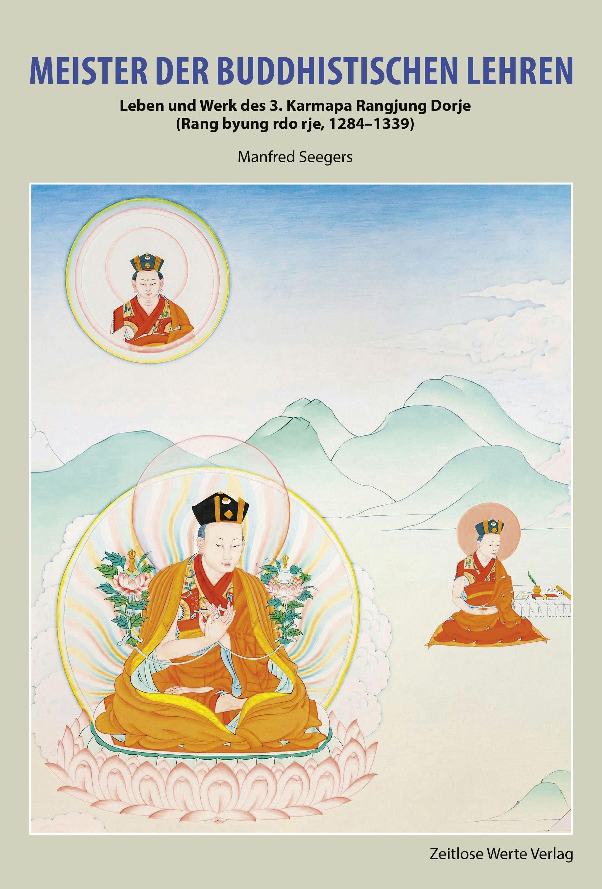 Titel: MEISTER DER BUDDHISTISCHEN LEHREN. Illustration: Karmapa in Landschaft mit Heiligenschein. Autor: Manfred Seegers., Buch