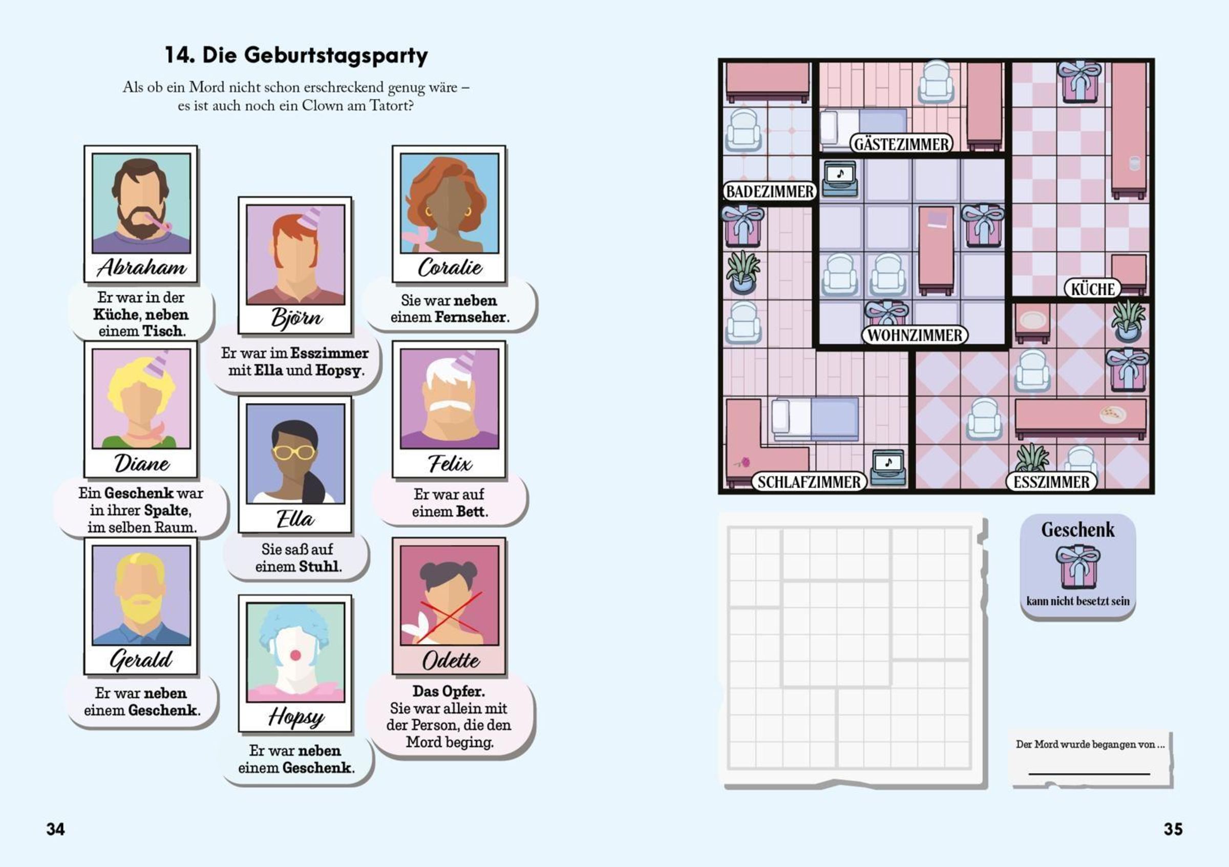 Reise zu farbenfrohen Schauplätzen, bei denen jedes Detail zur Lösung beiträgt- Räume, Möbel, Pflanzen, Tiere und manchmal zusätzliche Regeln, die für unerwartete Wendungen sorgen. Du erkundest 80 Tatorte, darunter eine Bäckerei, ein Casino, ein Schachturnier, einen Bauernhof, eine Oper ... die Vielfalt ist grenzenlos.