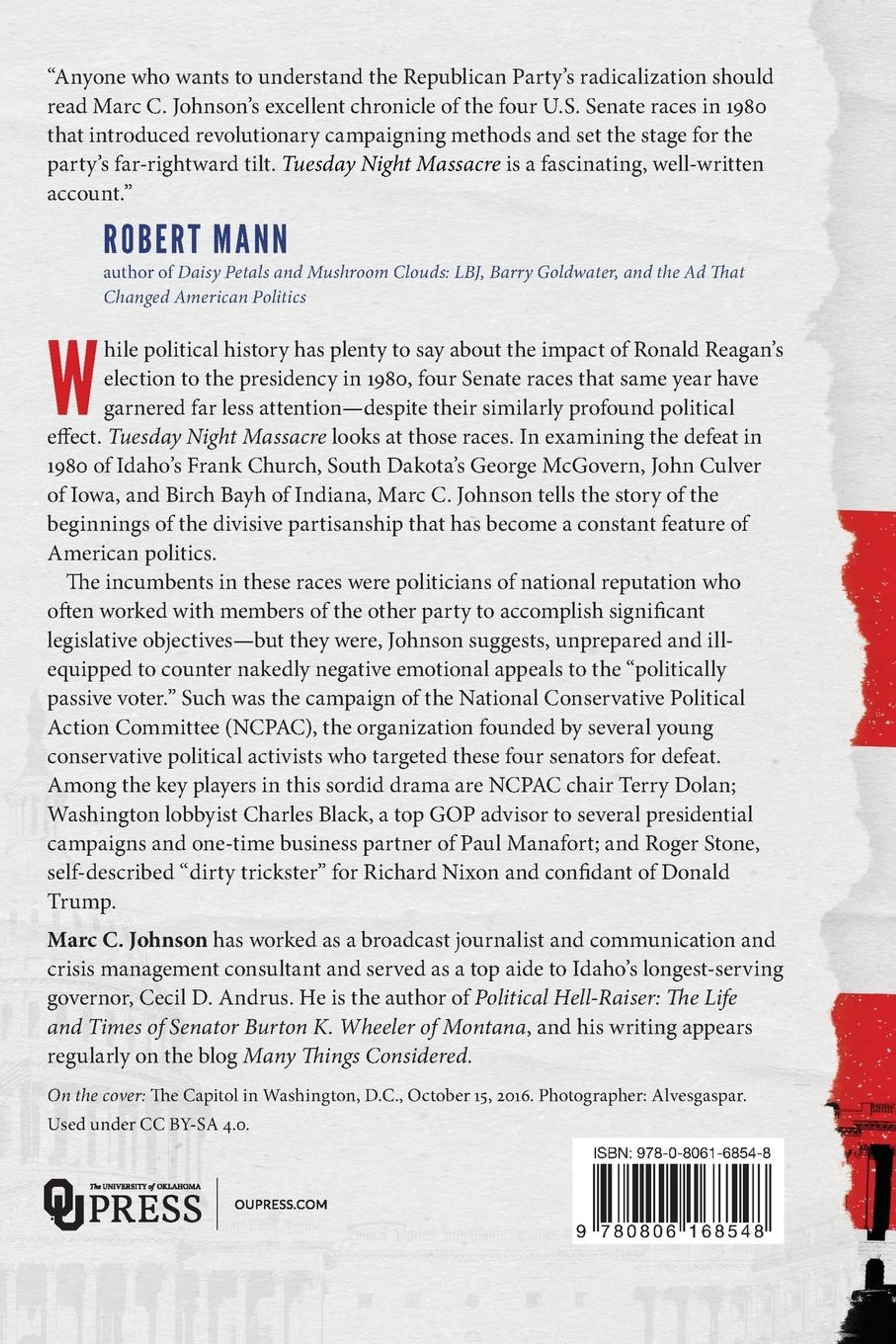 While political history has plenty to say about the impact of Ronald Reagan's election to the presidency in 1980, four Senate races that same year have garnered far less attention-despite their similarly profound political effect. Tuesday Night Massacre looks at those races. In examining the defeat in 1980 of Idaho's Frank Church, South Dakota's George McGovern, John Culver of Iowa, and Birch Bayh of Indiana, Marc C. Johnson tells the story of the beginnings of the divisive partisanship that has become a constant feature of American politics.