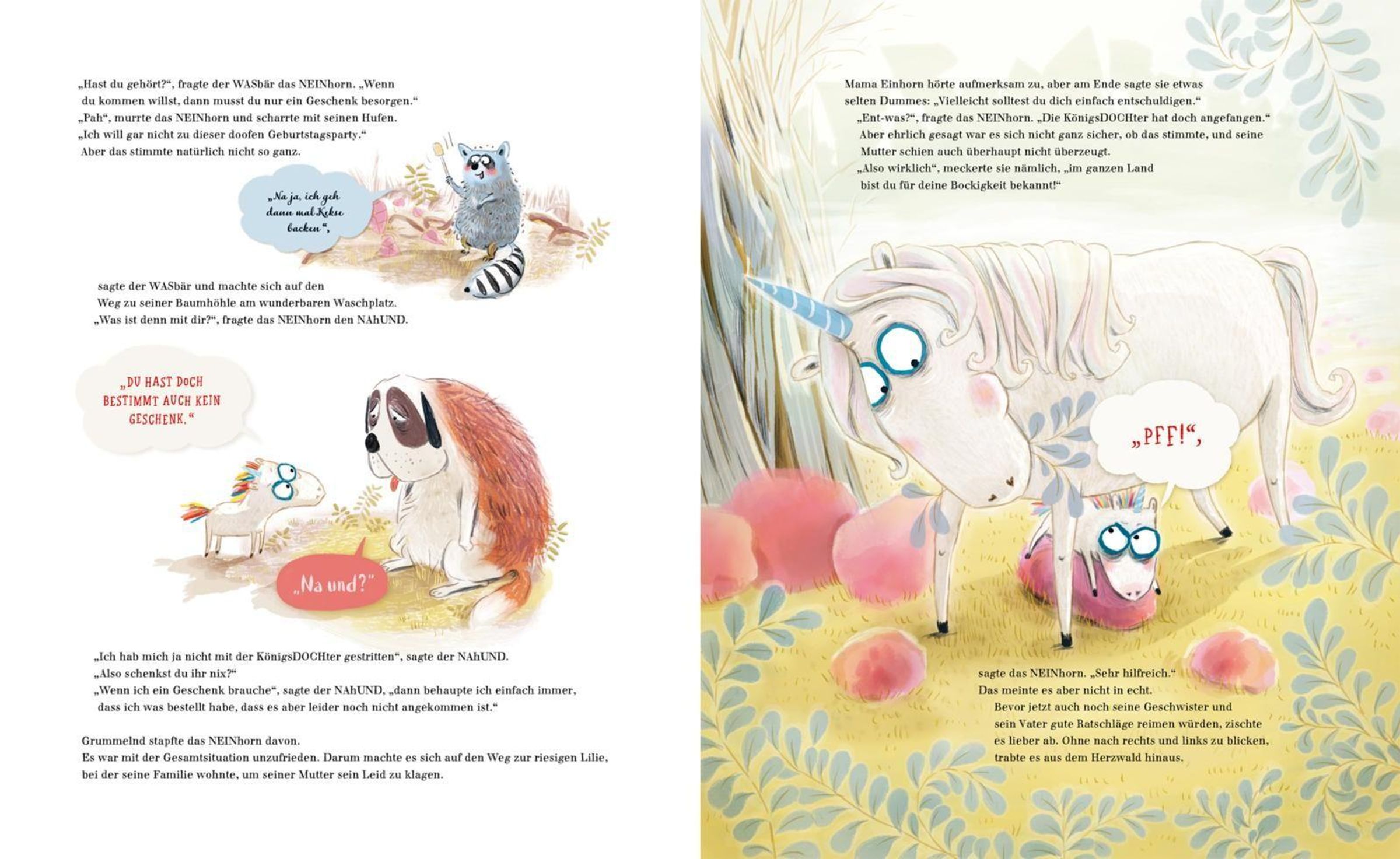 Der WASbär meint, ein schönes Geschenk, würde alles wieder in Ordnung bringen. Also macht sich das NEINhorn grummelnd auf die Suche. Unterwegs findet es zwar kein Geschenk, aber allerhand nervige neue Freunde.