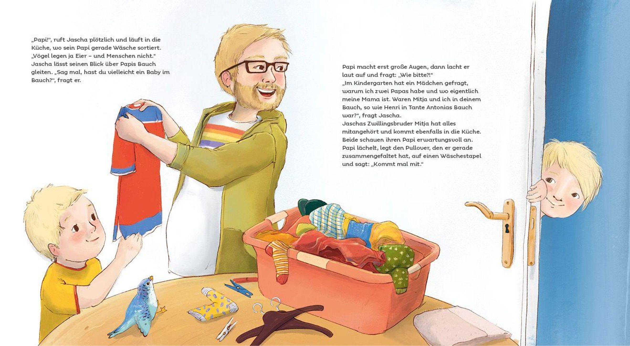Joshua und Jannis sind Zwillinge, und als Eltern haben sie einen Papi und einen Papa. Da fragen sich die beiden natürlich irgendwann, aus welchem Bauch sie als Babys einst auf diese Welt kamen. So erzählt Papi ihnen von der Frau im fernen Land, in deren Bauch sie neun Monate wuchsen. Es ist die etwas andere Geschichte einer Regenbogenfamilie. - Ein Bilderbuch zum Thema Leihmutterschaft - plus ein Interview mit dem Autor.