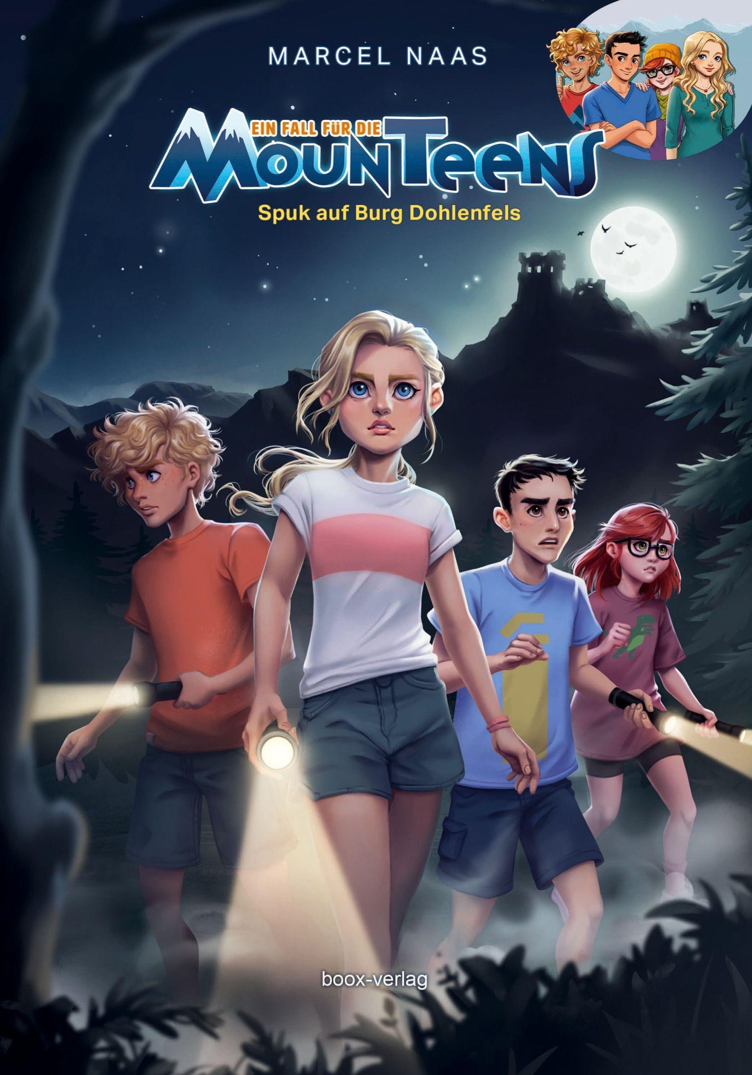 "MARCELE NAAS. Ein Fall für die Mount Teens: Spuk auf Burg Dohlenfels. Vier Jugendliche mit Taschenlampen im Wald.", Buch