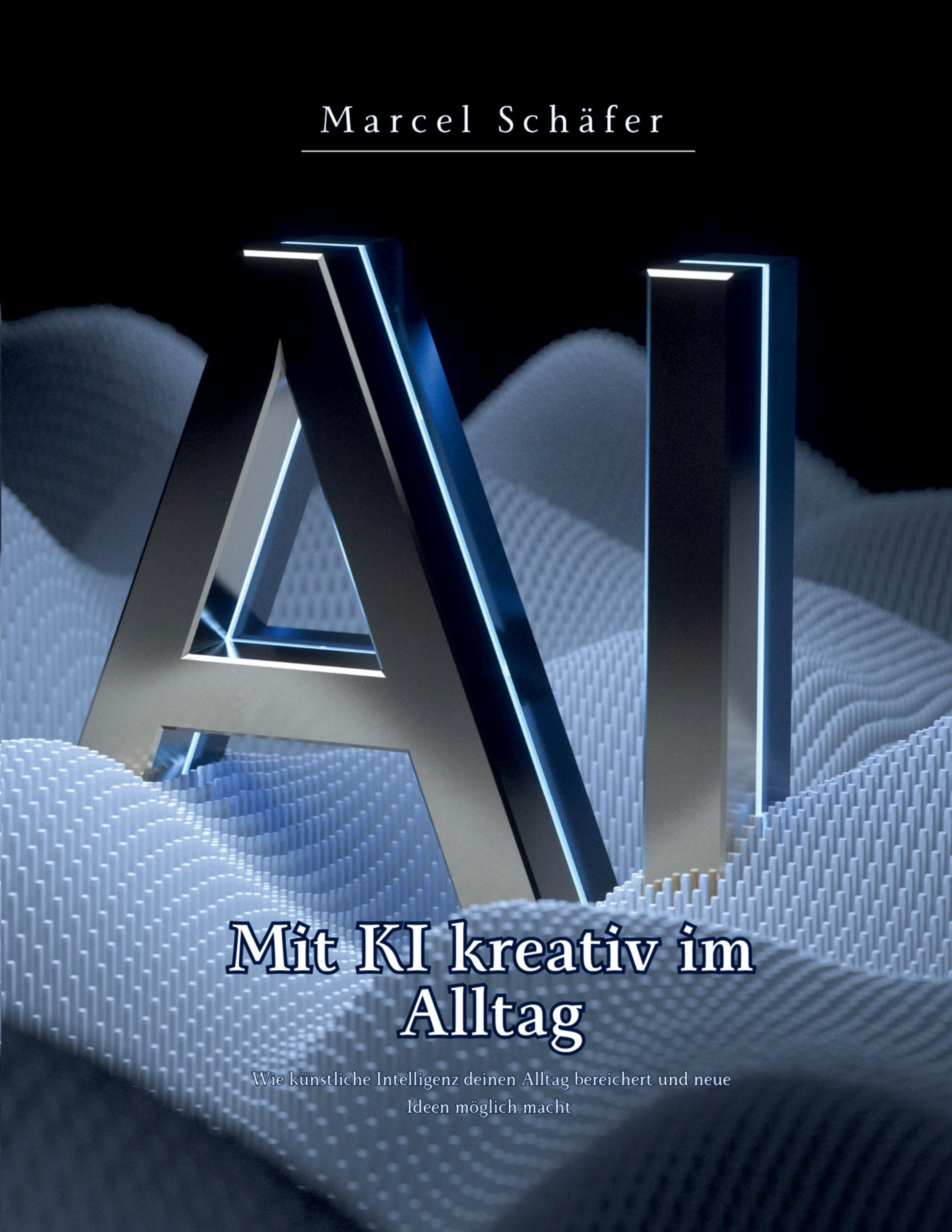 Text: "Marcel Schäfer, Mit KI kreativ im Alltag." Großes 3D "AI" auf texturierter Oberfläche., Buch