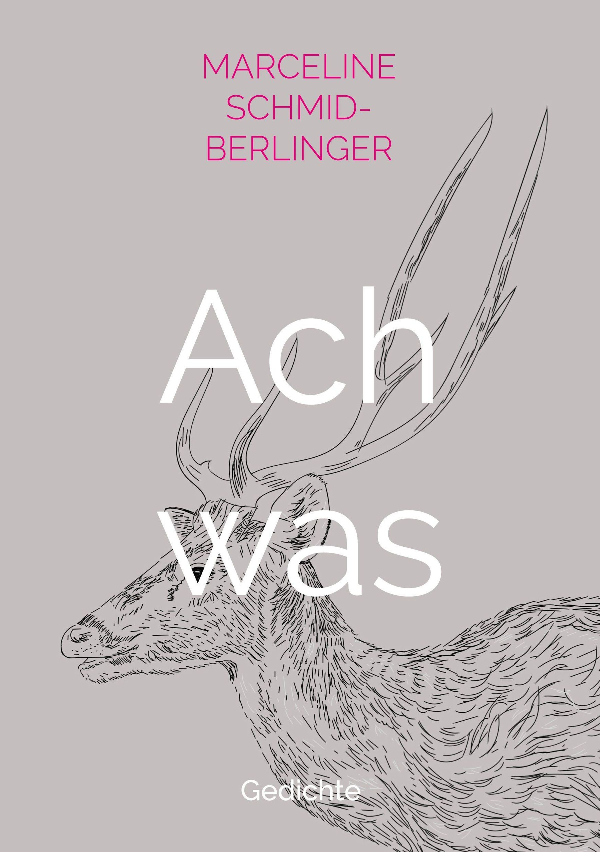 Text: "MARCELINE SCHMID-BERLINGER", "Ach was", "Gedichte". Illustration eines Hirschkopfes mit Geweih., Buch