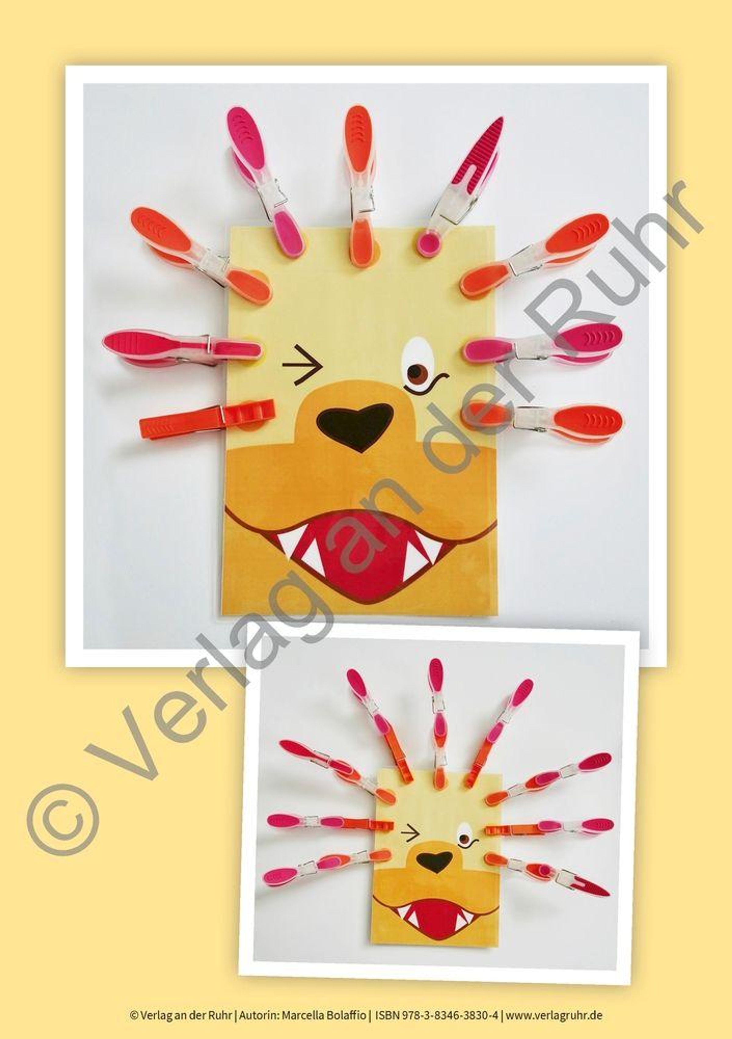Karteikarten für die Arbeit mit Kita-Kindern sowie für den Anfangsunterricht in der Grundschule und für Eltern +++ Mit diesen kreativen Feinmotorik-Förderkarten geben Sie Kindern von drei bis acht Jahren Spiel, Spaß und Frühförderung buchstäblich selbst in die Hand. Auf jeder Bildkarte ist eine schöne Illustration in fröhlich-bunten Farben zu sehen - doch erst durch das Anbringen von Wäscheklammern an den richtigen Stellen entsteht ein fertiges Bild. Die Kinder knobeln und klemmen, haben jede Menge Spaß und trainieren spielerisch Feinmotorik, Druckdosierung und Auge-Hand-Koordination. Auch Konzentration und Fantasie werden altersgerecht angeregt. Beispielsweise zaubern die Kinder dem Löwen mit Wäscheklammern seine Löwenmähne, dem Kaktus seine Stacheln und dem Eis einen Stiel. Sie selbst müssen sich gar nicht groß dahinterklemmen: Auf der Rückseite jeder Karteikarte ist das jeweilige Motiv zur Selbstkontrolle noch einmal mit fertig angebrachten Wäscheklammern abgebildet. So können sich die Kinder komplett selbstständig mit den Knobelkarten beschäftigen und ihr Ergebnis direkt selbst überprüfen. Die Wäscheklammern zum Vervollständigen besorgen Sie wahlweise in den passenden Farben oder Sie malen gemeinsam mit den Kindern Holzwäscheklammern farbig an. Ob im Kindergarten, im Anfangsunterricht oder auch zu Hause: Die 20 lustigen Wäscheklammer-Bilder garantieren spielerisches Feinmotorik-Training und spannenden Knobelspaß. Ein echter Glücksgriff also, den die Kinder gar nicht mehr aus der Hand geben wollen.