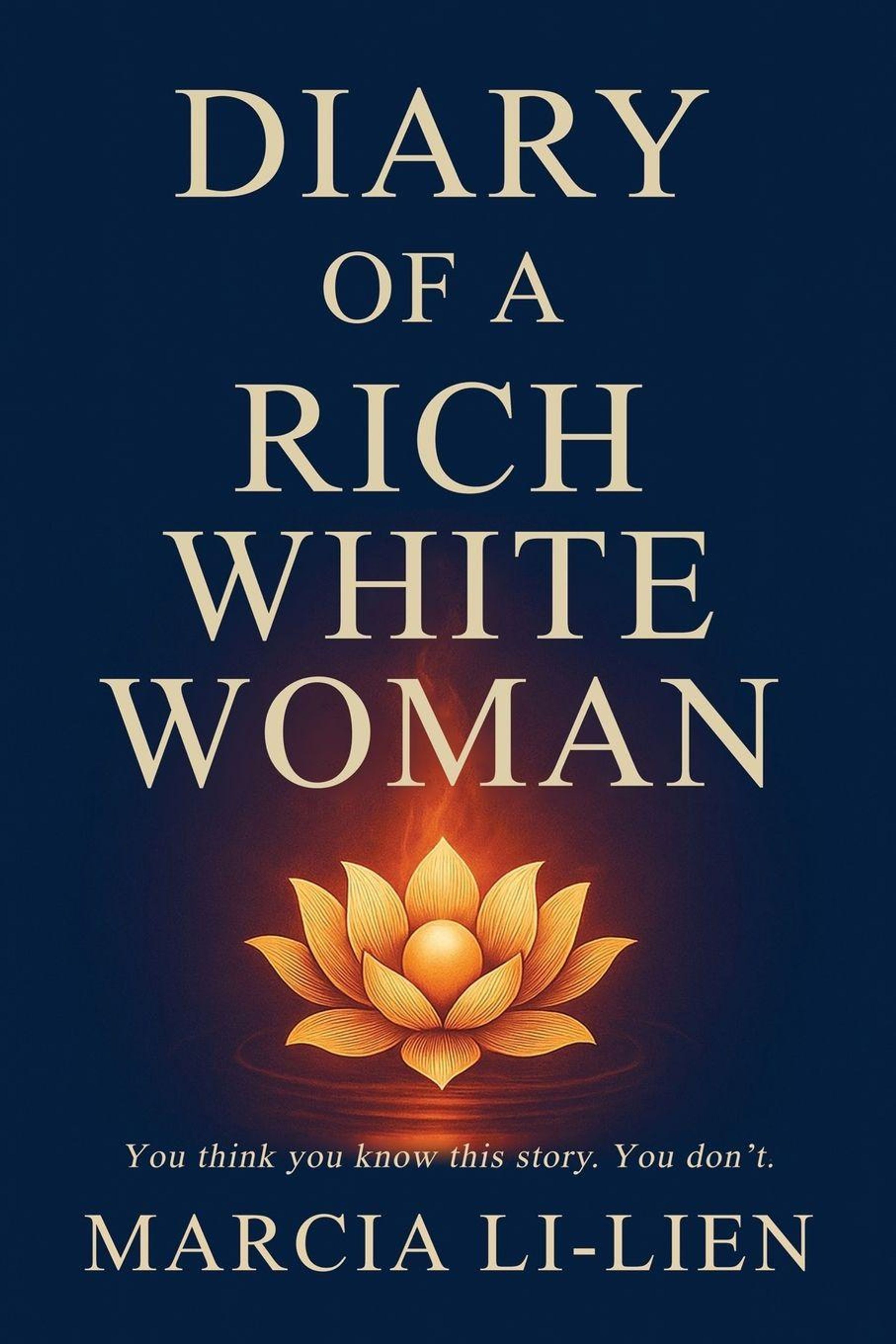 "DIARY OF A RICH WHITE WOMAN" von Marcia Li-Lien. Darunter eine orangefarbene Lotusblüte auf blauem Hintergrund., Buch