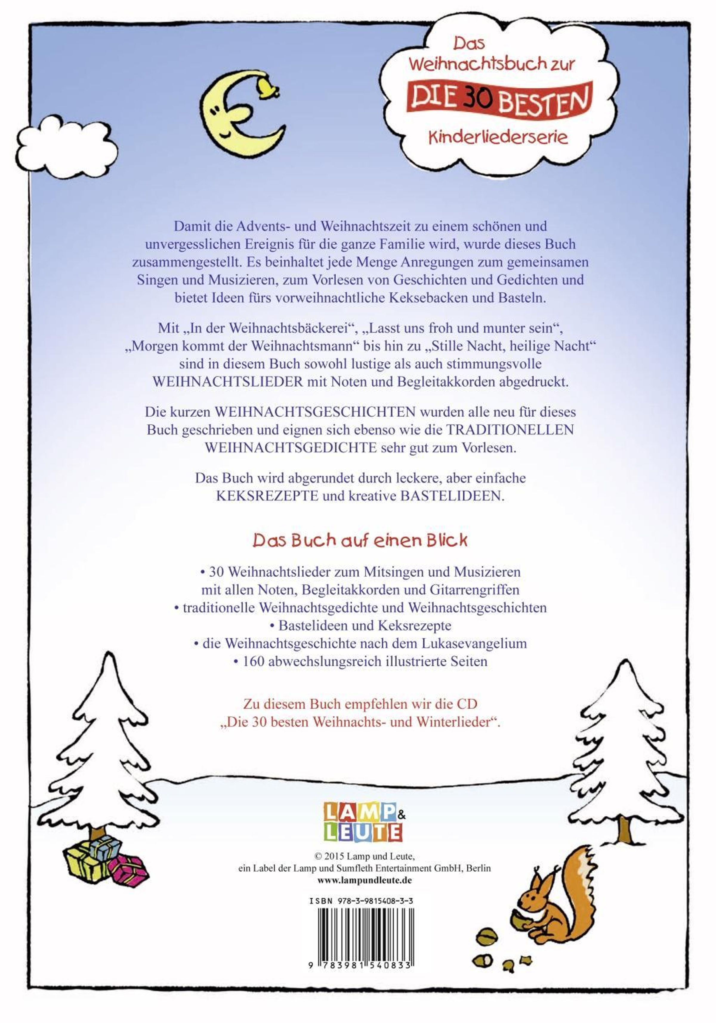 Damit die Advents- und Weihnachtszeit zu einem schönen und unvergesslichen Ereignis fur die ganze Familie wird, wurde dieses Buch zusammengestellt. Es beinhaltet jede Menge Anregungen zum gemeinsamen Singen und Musizieren, zum Vorlesen von Geschichten und Gedichten und bietet Ideen furs vorweihnachtliche Keksebacken und Basteln. Mit "In der Weihnachtsbäckerei", "Lasst uns froh und munter sein", "Morgen kommt der Weihnachtsmann" bis hin zu "Stille Nacht, heilige Nacht" sind in diesem Buch sowohl lustige als auch stimmungsvolle WEIHNACHTSLIEDER mit Noten und Begleitakkorden abgedruckt. Die kurzen WEIHNACHTSGESCHICHTEN wurden alle neu fur dieses Buch geschrieben und eignen sich ebenso wie die TRADITIONELLEN WEIHNACHTSGEDICHTE sehr gut zum Vorlesen. Das Buch wird abgerundet durch leckere, aber einfache KEKSREZEPTE und kreative BASTELIDEEN. Das Buch auf einen Blick * 30 Weihnachtslieder zum Mitsingen und Musizieren mit allen Noten, Begleitakkorden und Gitarrengriffen * traditionelle Weihnachtsgedichte und Weihnachtsgeschichten * Bastelideen und Keksrezepte * die Weihnachtsgeschichte nach dem Lukasevangelium * 160 abwechslungsreich illustrierte Seiten Zu diesem Buch empfehlen wir die CD "Die 30 besten Weihnachts- und Winterlieder".