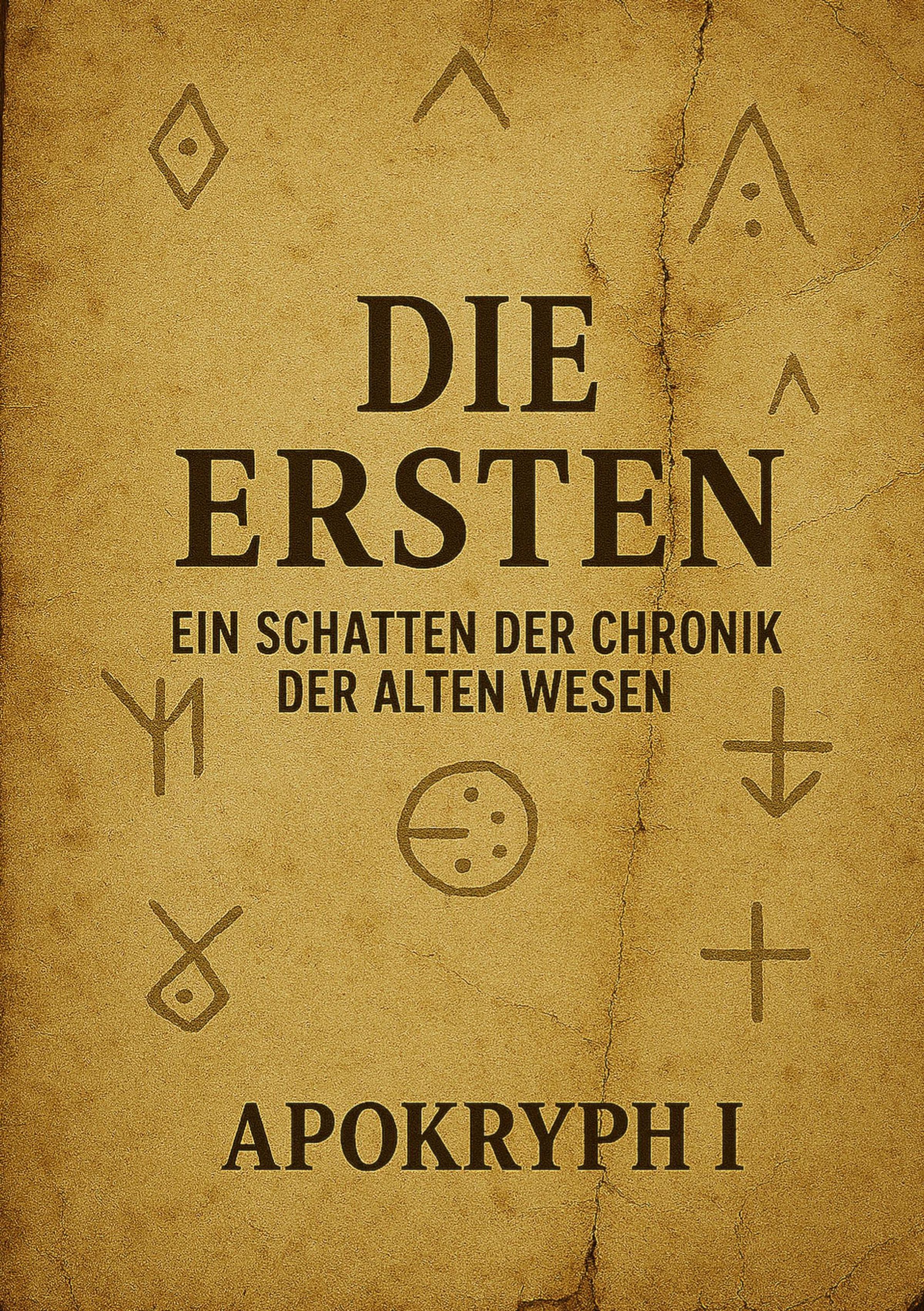 Text: "DIE ERSTEN. EIN SCHATTEN DER CHRONIK DER ALTEN WESEN. APOKRYPH I." Hintergrund mit mystischen Symbolen., Buch