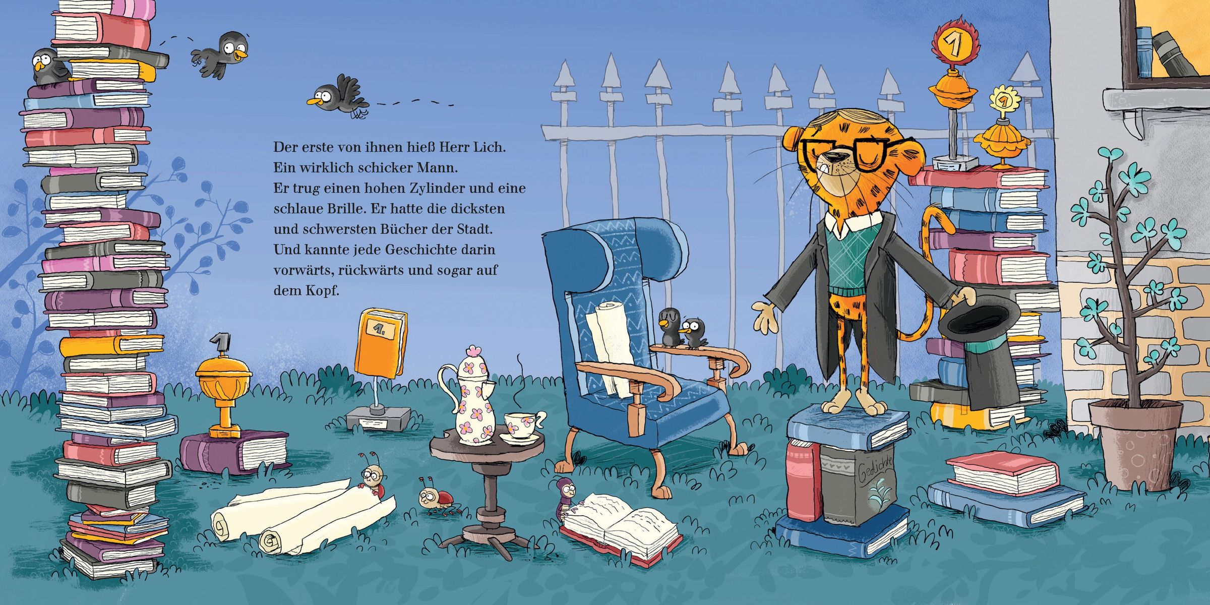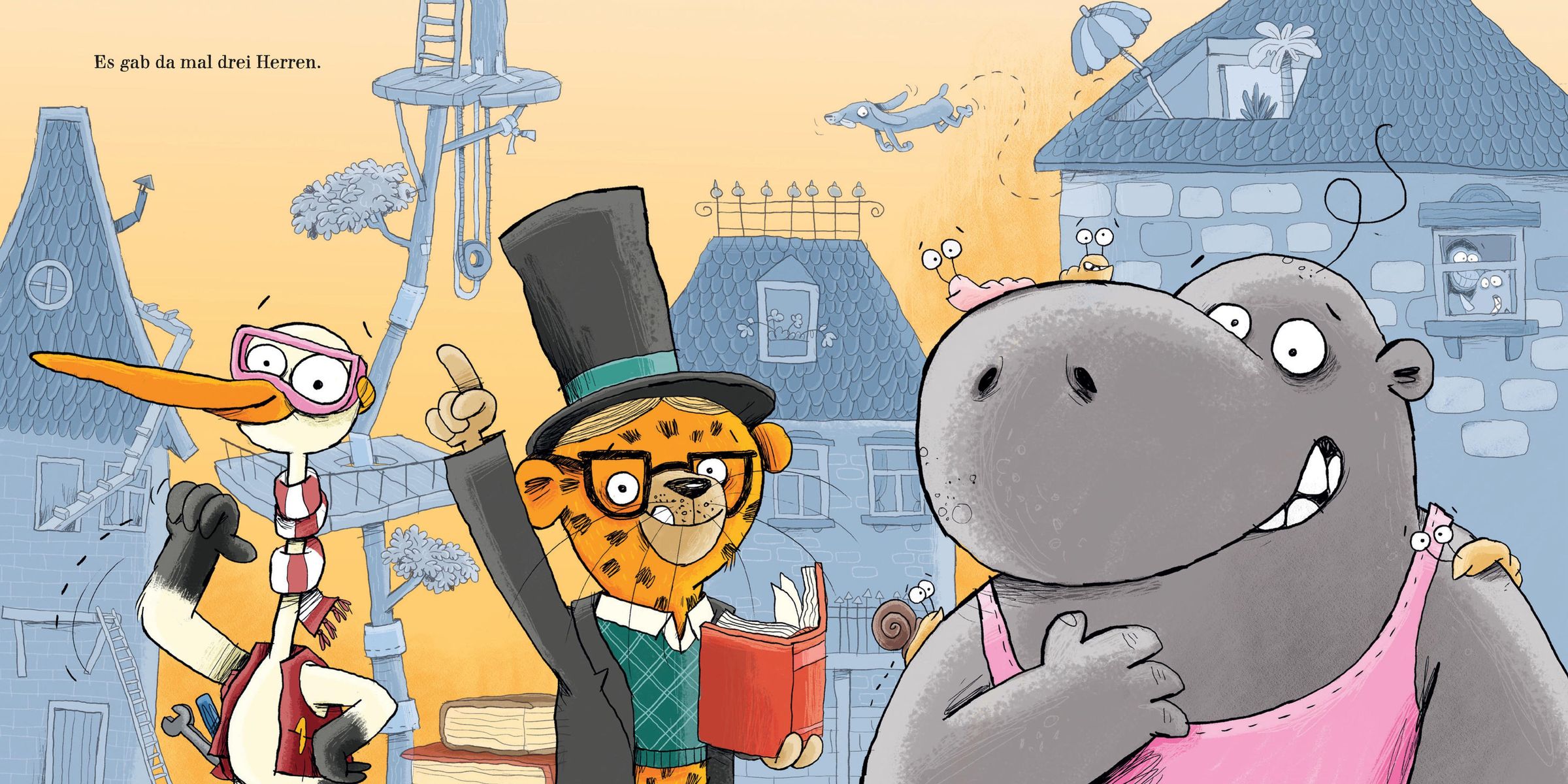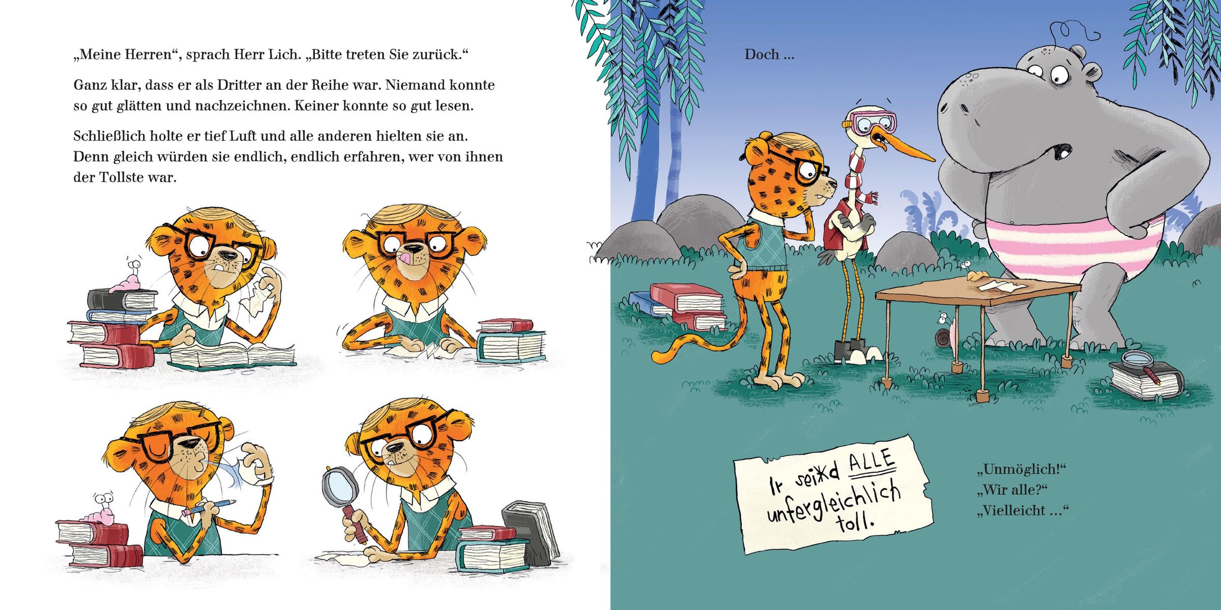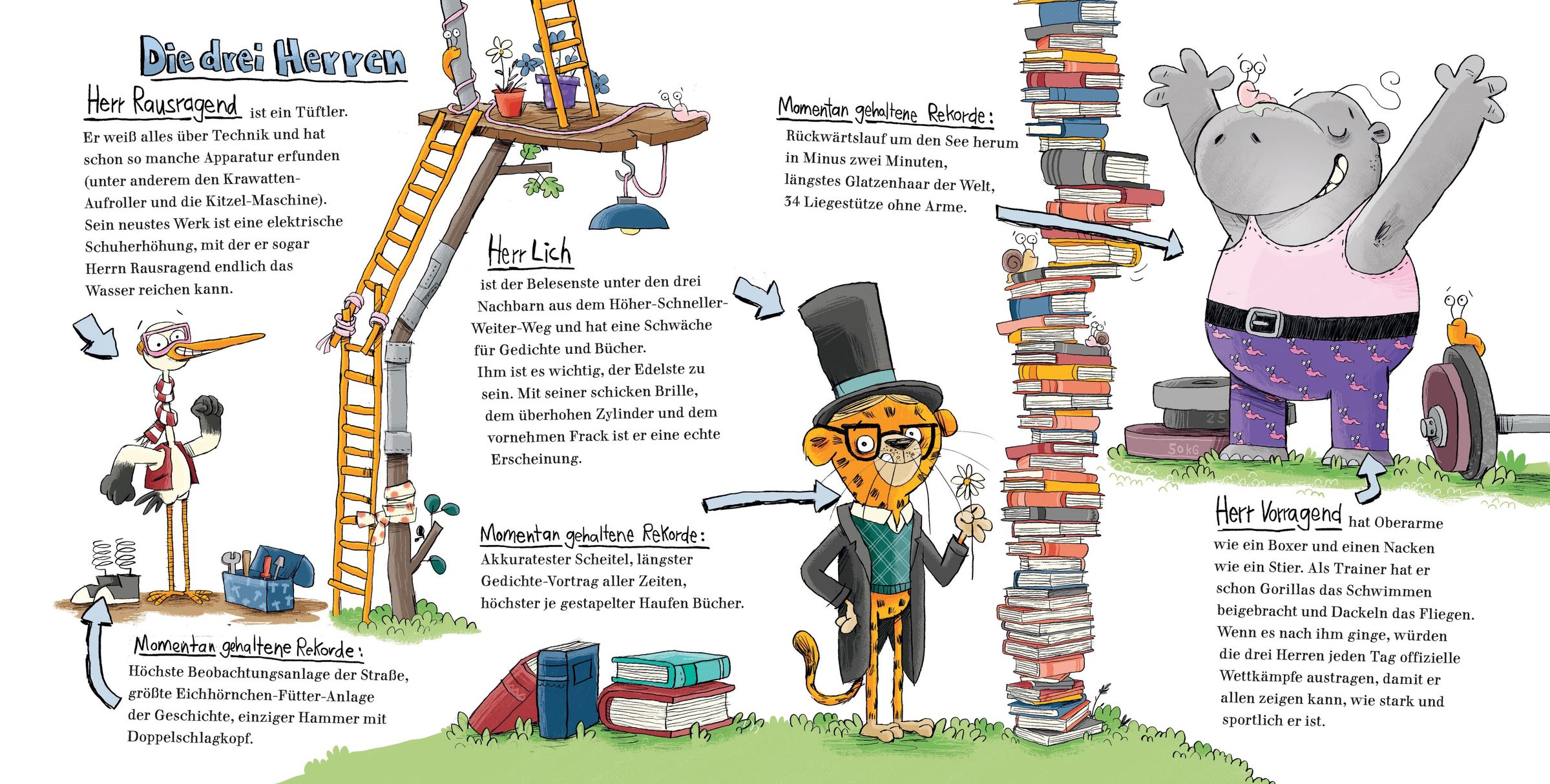 Es gab mal drei (tierische) Herren: Herr Lich hatte die dicksten Bücher und las sie vorwärts und rückwärts. Herr Vorragend war ein bulliger Mann mit Gürtel und Glatze, der die schnellsten Schnecken der Stadt trainierte. Herr Rausragend war ein genialer Erfinder, dessen Schuhe auf Knopfdruck wachsen konnten. Eines Tages wollten sie klären, wer von ihnen der Tollste war - im Höher-Schneller-Weiter-Weg und am Größer-Tiefer-Schöner-See. Sie schwammen, tüftelten und übertrafen sich - bis sie merkten: Zusammen sind wir die Allerallerbesten!