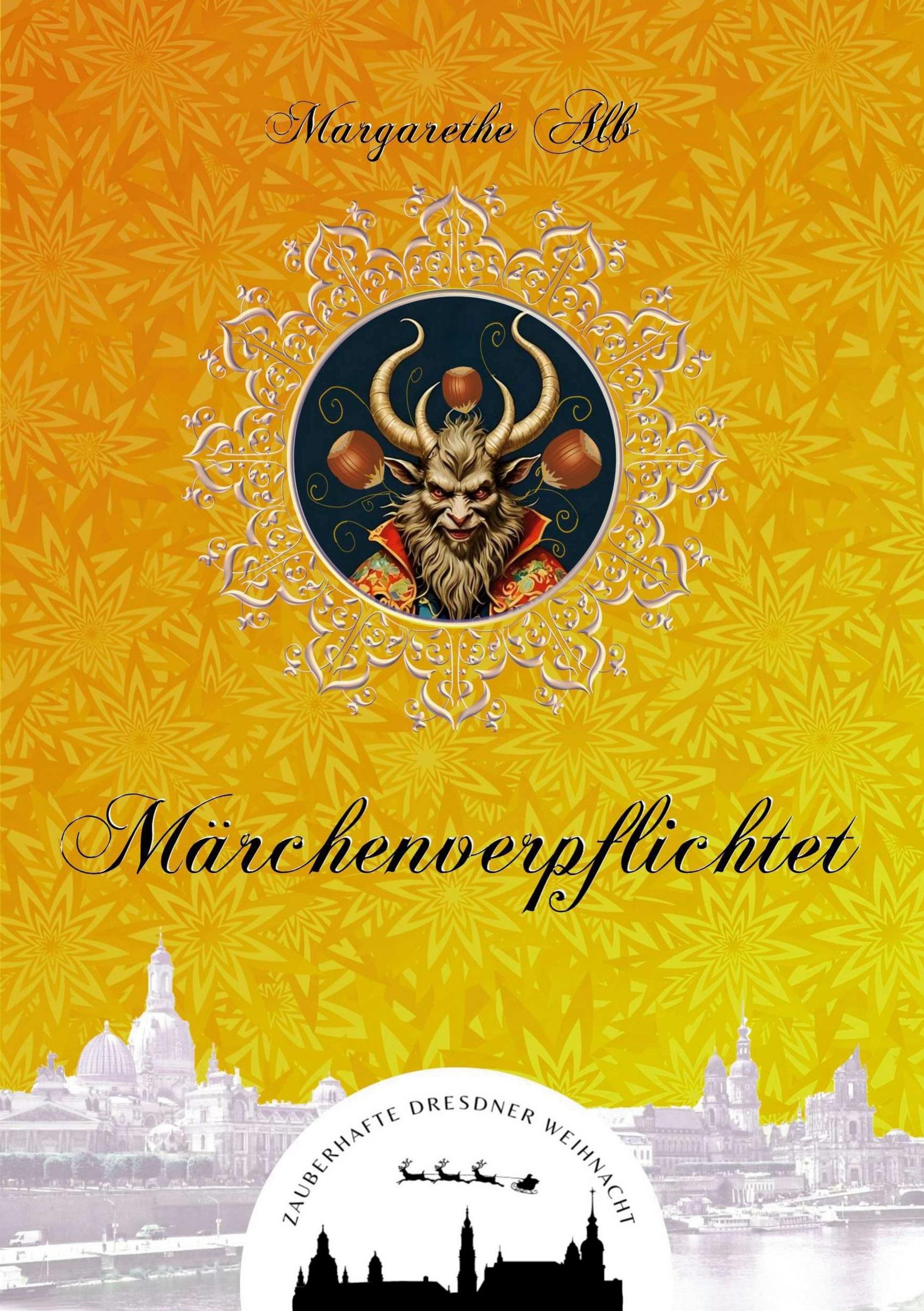 "Märchenverpflichtet" und "Margarethe Alb" auf sternenförmigem Hintergrund, Illustration mit gehörntem Wesen. Unten Dresdner Skyline., Buch