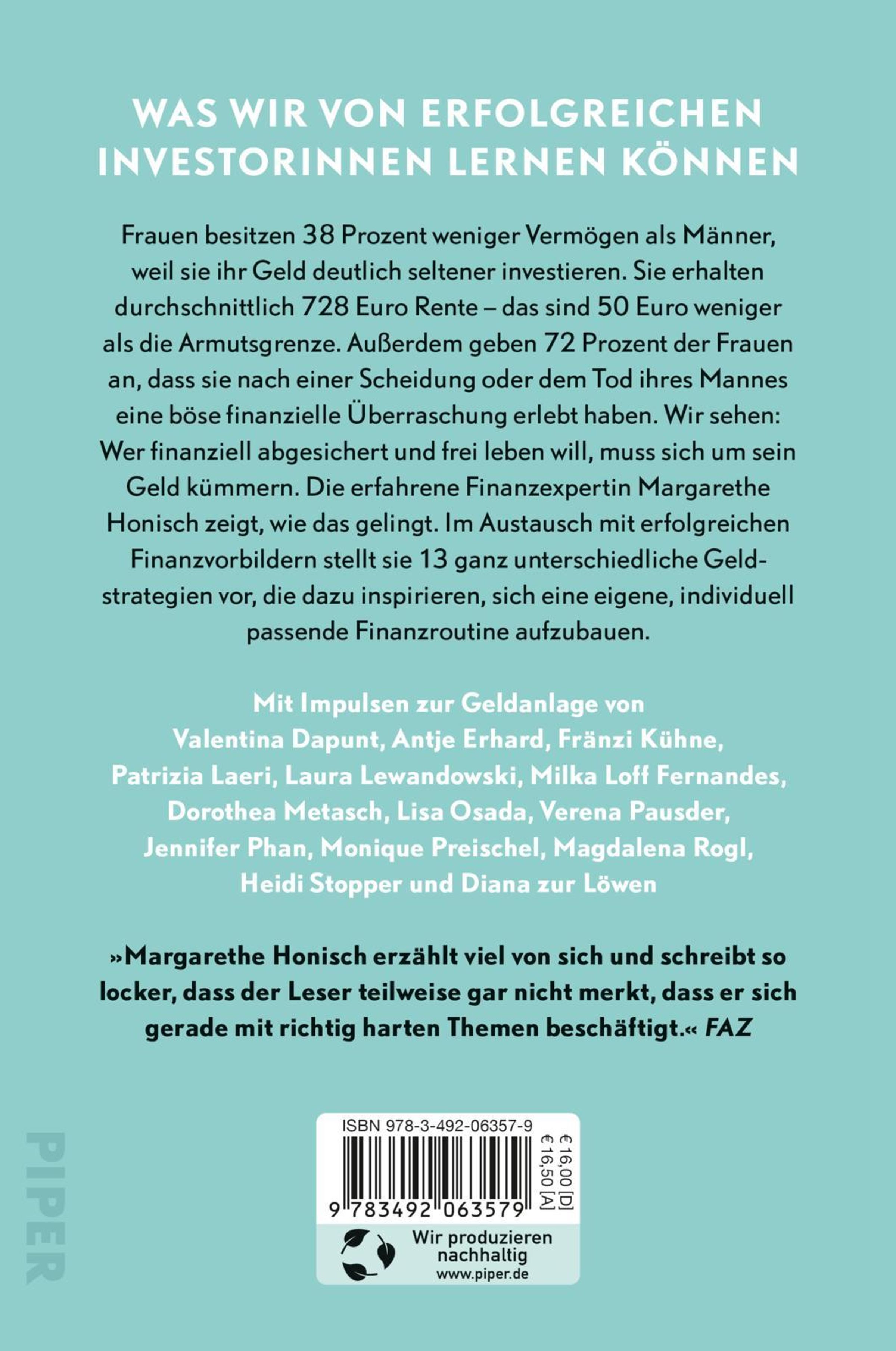 Frauen besitzen 38 Prozent weniger Vermögen als Männer, weil sie ihr Geld deutlich seltener investieren. Sie erhalten durchschnittlich 728 Euro Rente - das sind 50 Euro weniger als die Armutsgrenze. Außerdem geben 72 Prozent der Frauen an, dass sie nach einer Scheidung oder dem Tod ihres Mannes eine böse finanzielle Überraschung erlebt haben. Wir sehen: Wer finanziell abgesichert und frei leben will, muss sich um sein Geld kümmern. Die erfahrene Finanzexpertin Margarethe Honisch zeigt, wie das gelingt. Im Austausch mit erfolgreichen Finanzvorbildern stellt sie 13 ganz unterschiedliche Geld-strategien vor, die dazu inspirieren, sich eine eigene, individuell passende Finanzroutine aufzubauen.
