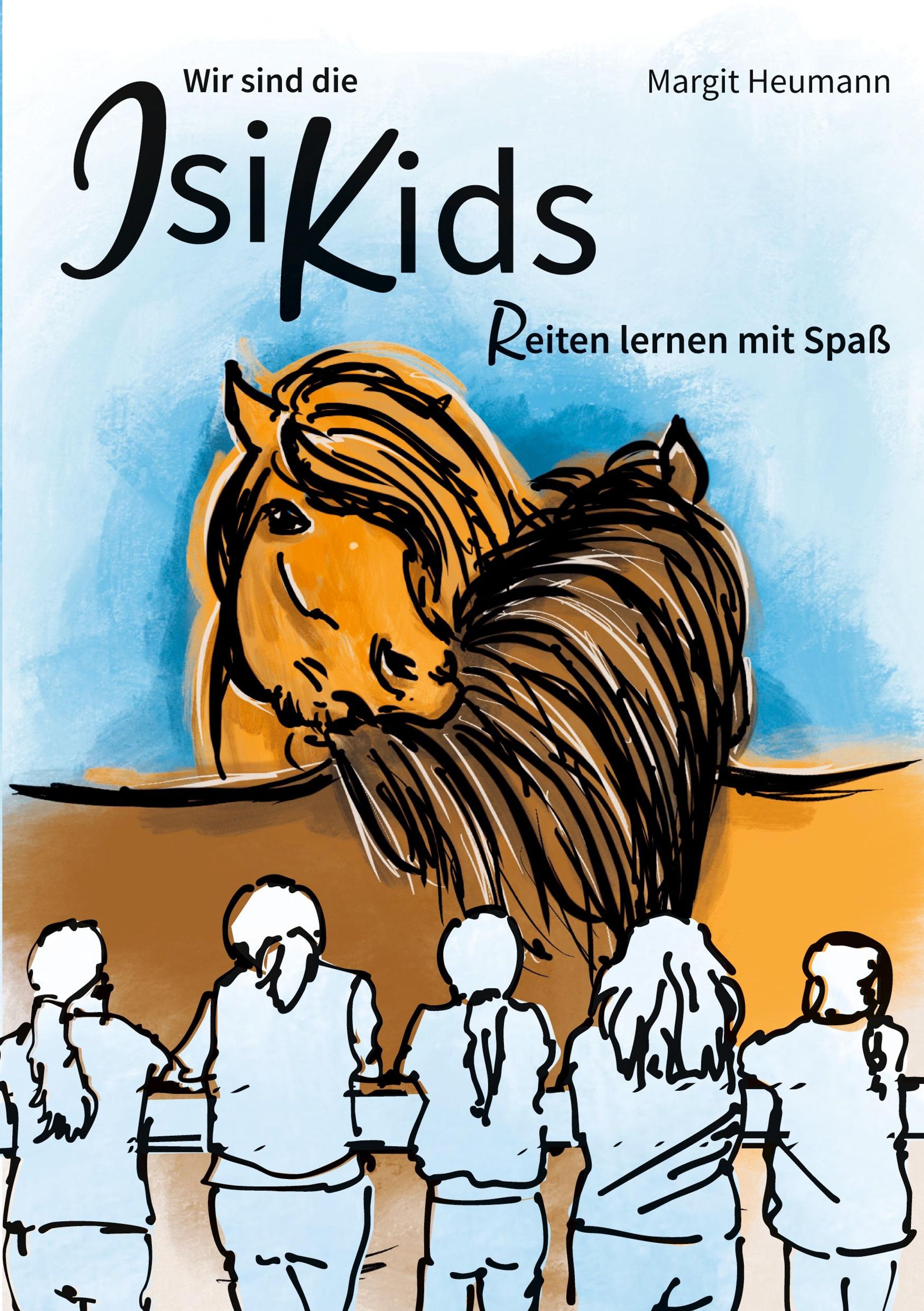 Text: "Wir sind die IsiKids: Reiten lernen mit Spaß. Margit Heumann." Illustration eines Pferdes vor Kindern an einem Zaun., Buch