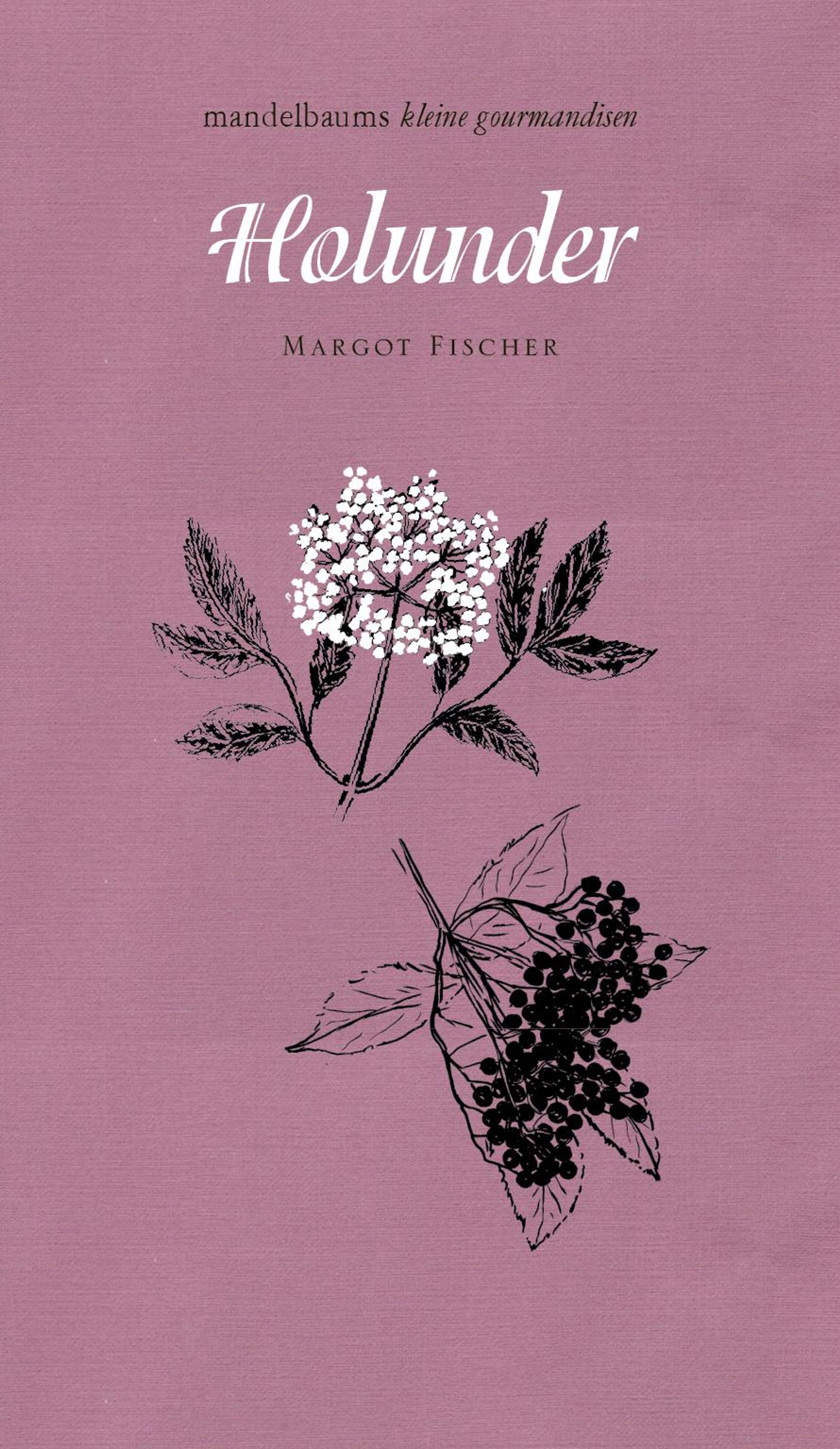 „mandelbaums kleine gourmandisen“, „Holunder“, „Margot Fischer“. Illustration von Holunderblüten und Beeren auf lila Hintergrund., Buch