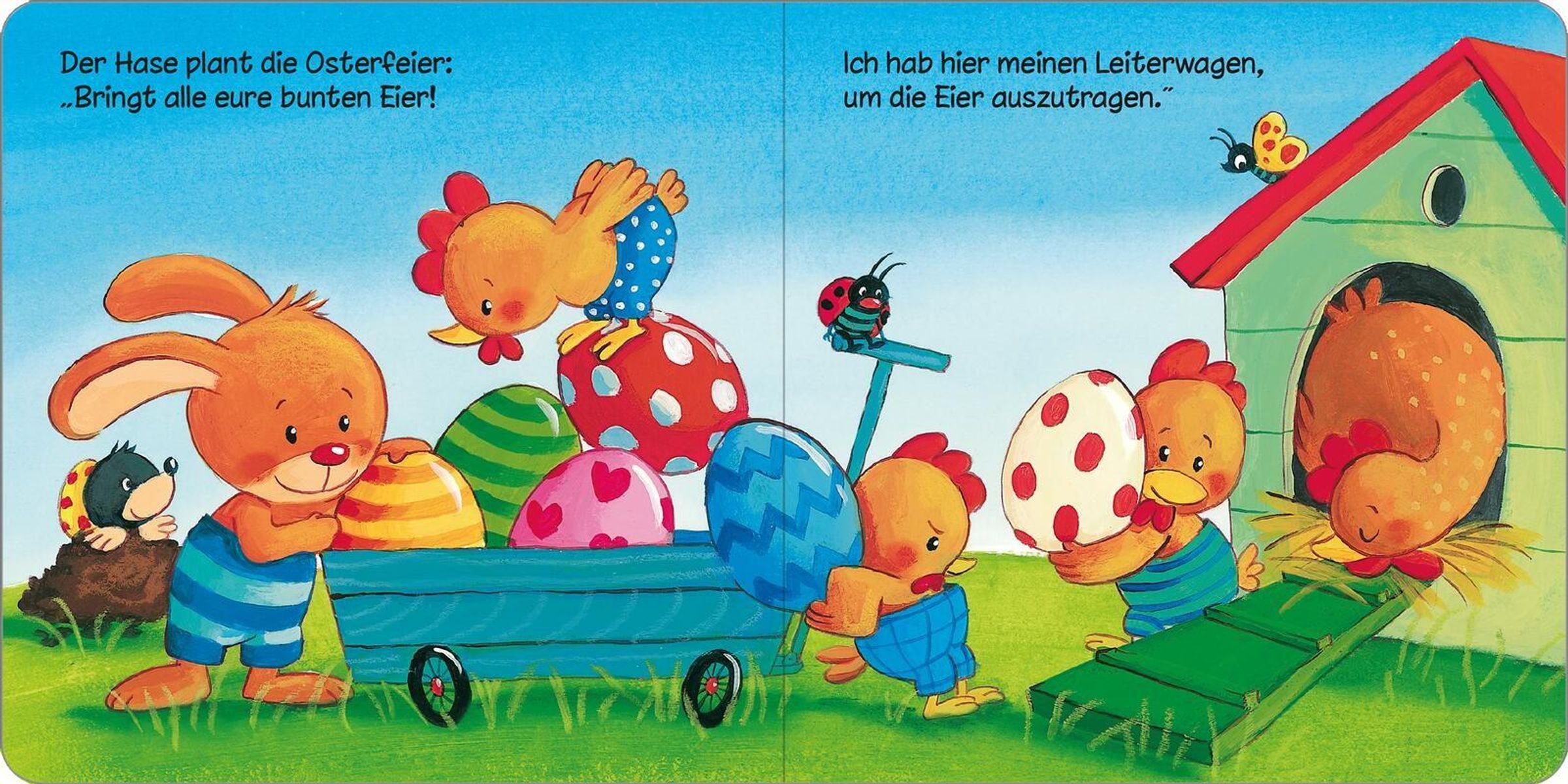 Der kleine Osterhase ist bereit fürs Osterfest. Er holt seinen Leiterwagen und möchte die bunten Eier verteilen. Doch was ist da los? Die ganze Hühnerschar will ihn begleiten. Und wen treffen sie noch auf dem Weg?