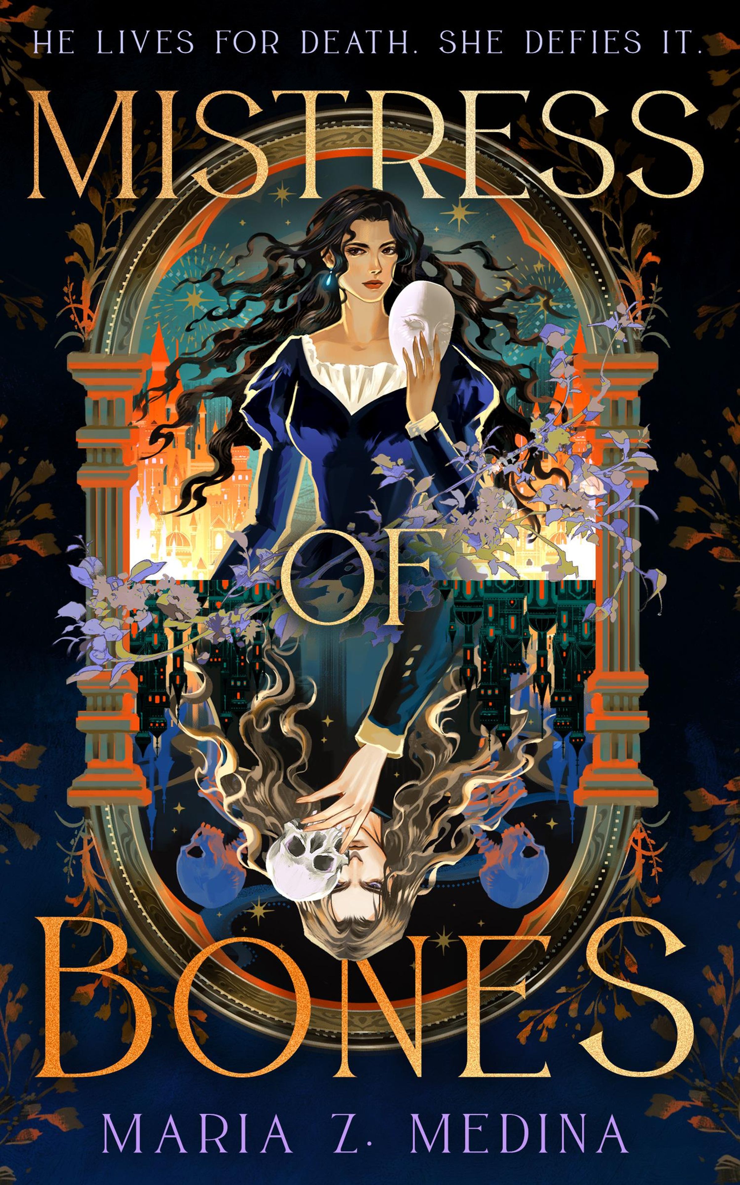 "HE LIVES FOR DEATH. SHE DEFIES IT. MISTRESS OF BONES. MARIA Z. MEDINA." Illustration: Frau mit Maske, Spiegelbild hält Schädel., Buch