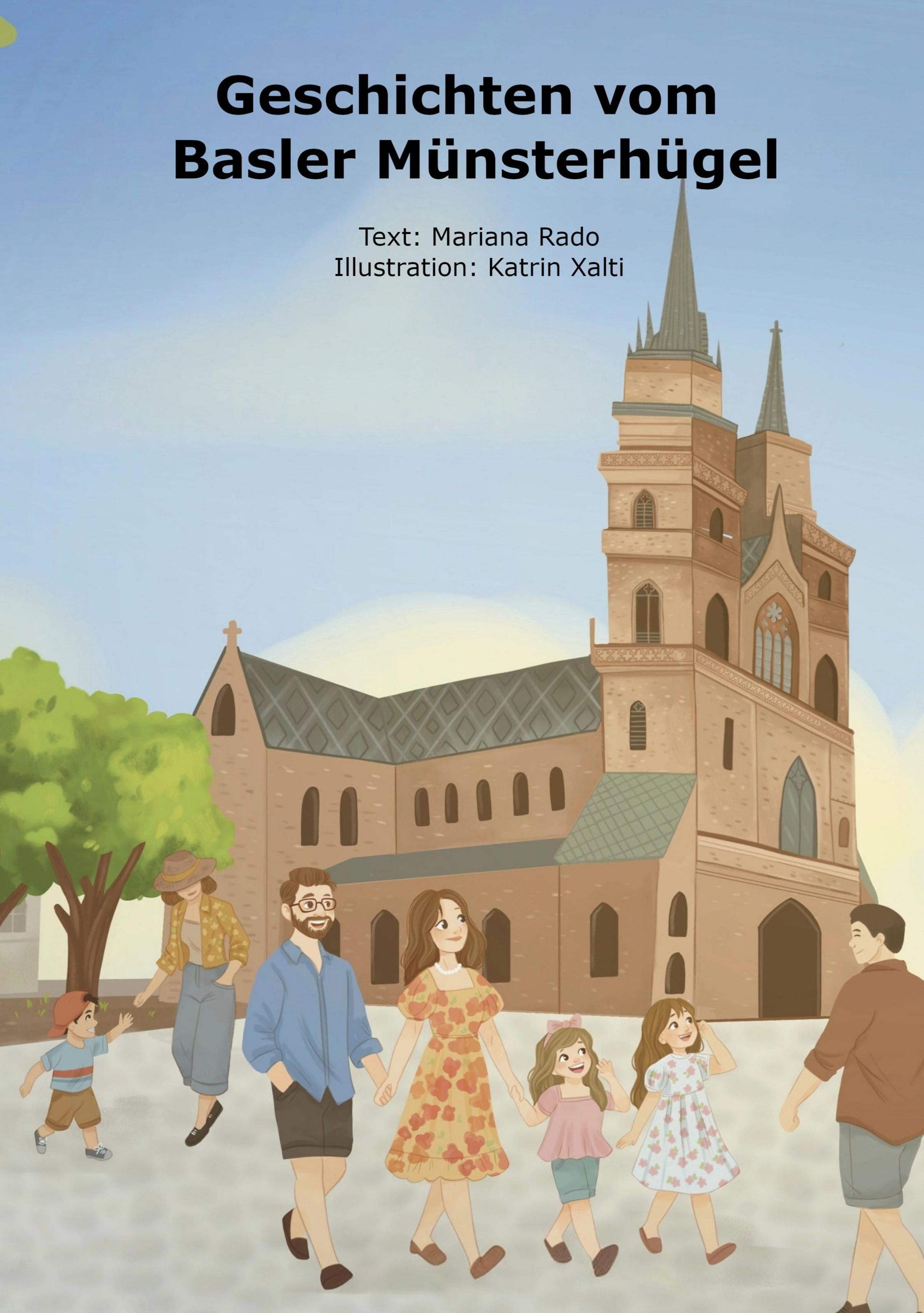 "Geschichten vom Basler Münsterhügel. Text: Mariana Rado, Illustration: Katrin Xalti." Illustration einer fröhlichen Familie vor dem Münster., Buch