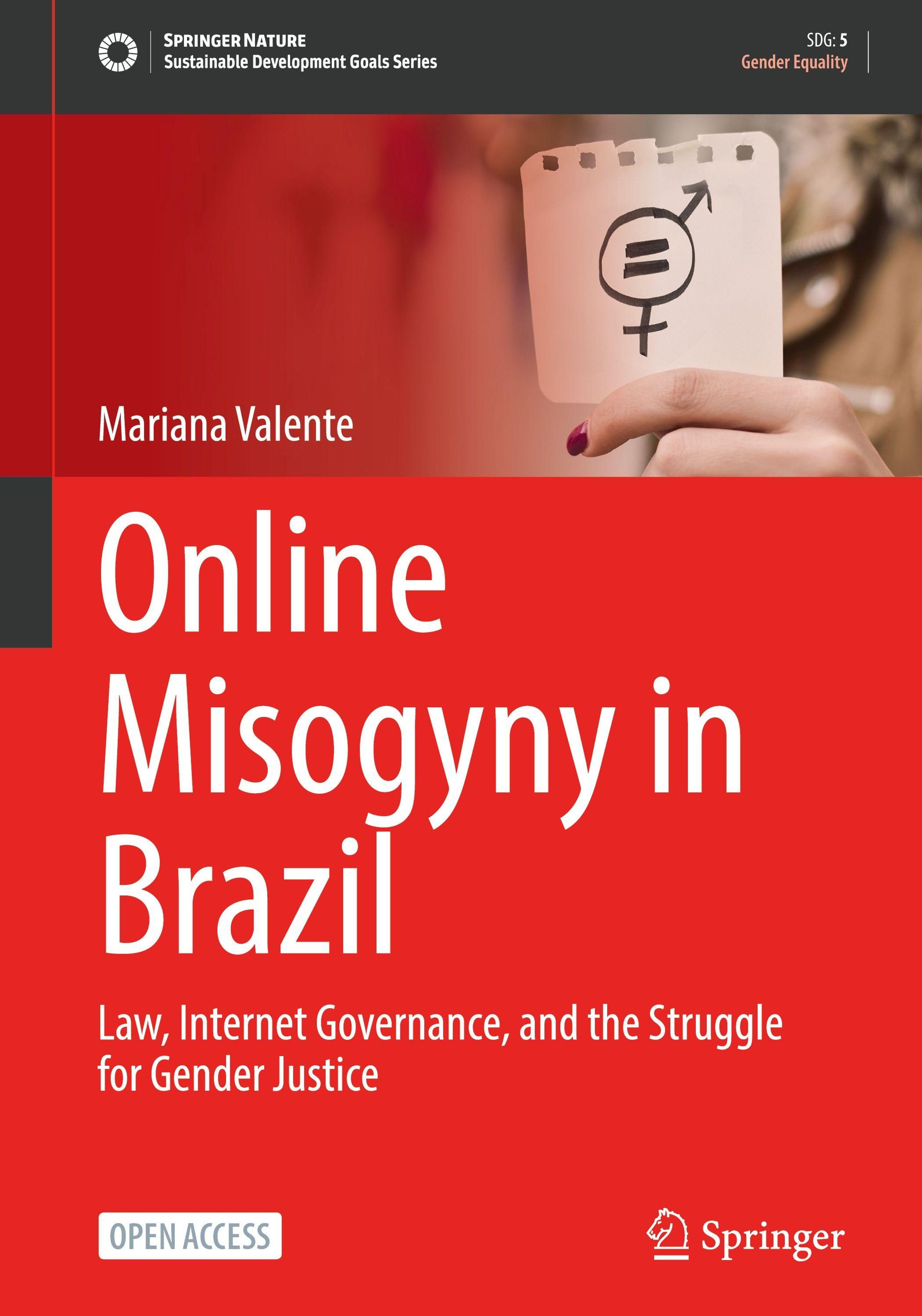 "Online Misogyny in Brazil" von Mariana Valente, ein rotes Cover mit einer Hand, die ein Gleichheitssymbol hält., Buch