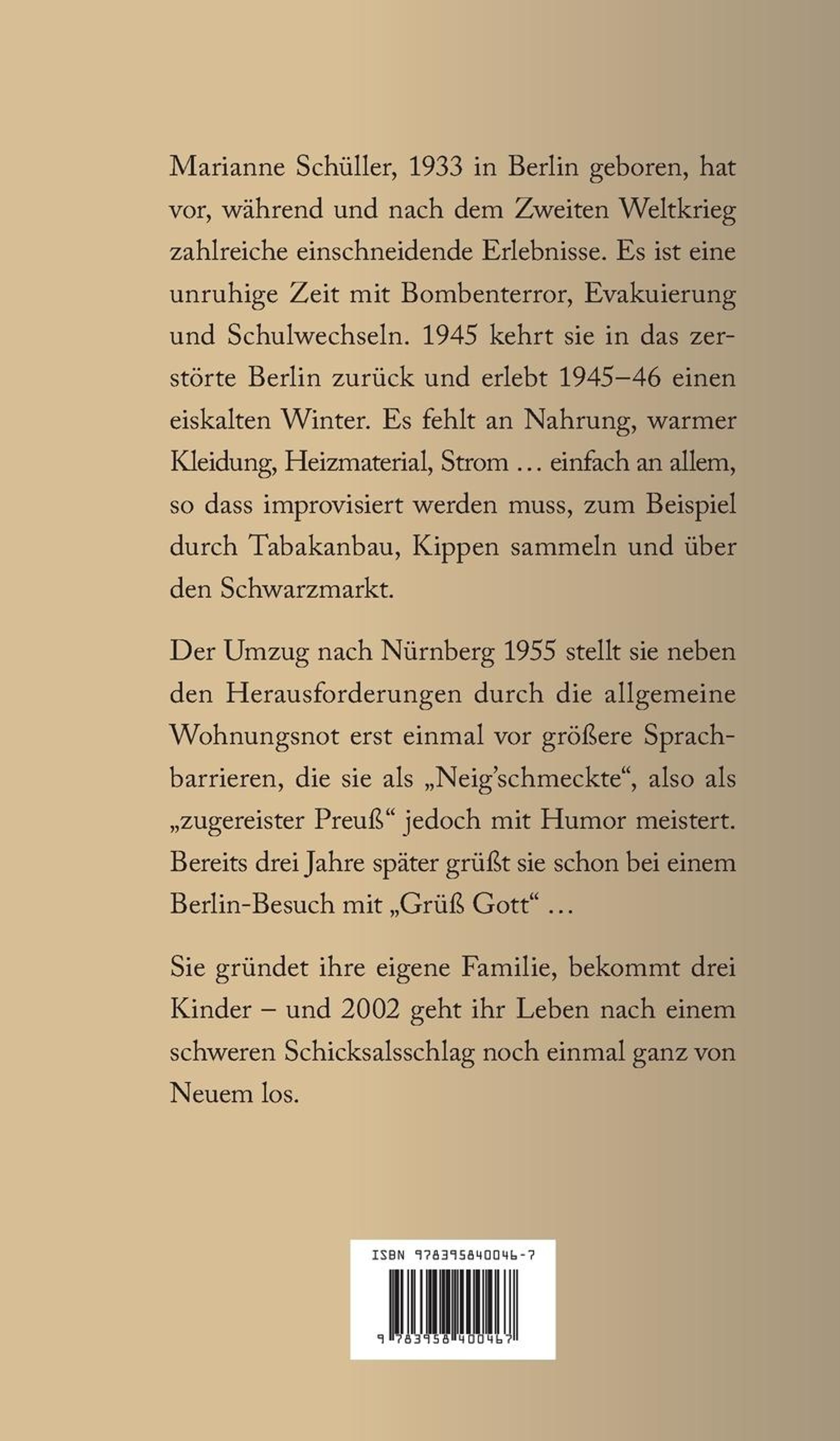 Während und nach dem Zweiten Weltkrieg in Berlin erlebt Marianne Schüller nicht nur glückliche und sorgenfreie Stunden. Nach einem Umzug 1955 nach Nürnberg steht sie dann erst einmal vor großen Sprachbarrieren. Guten Tag - ach nein: Grüß Gott!