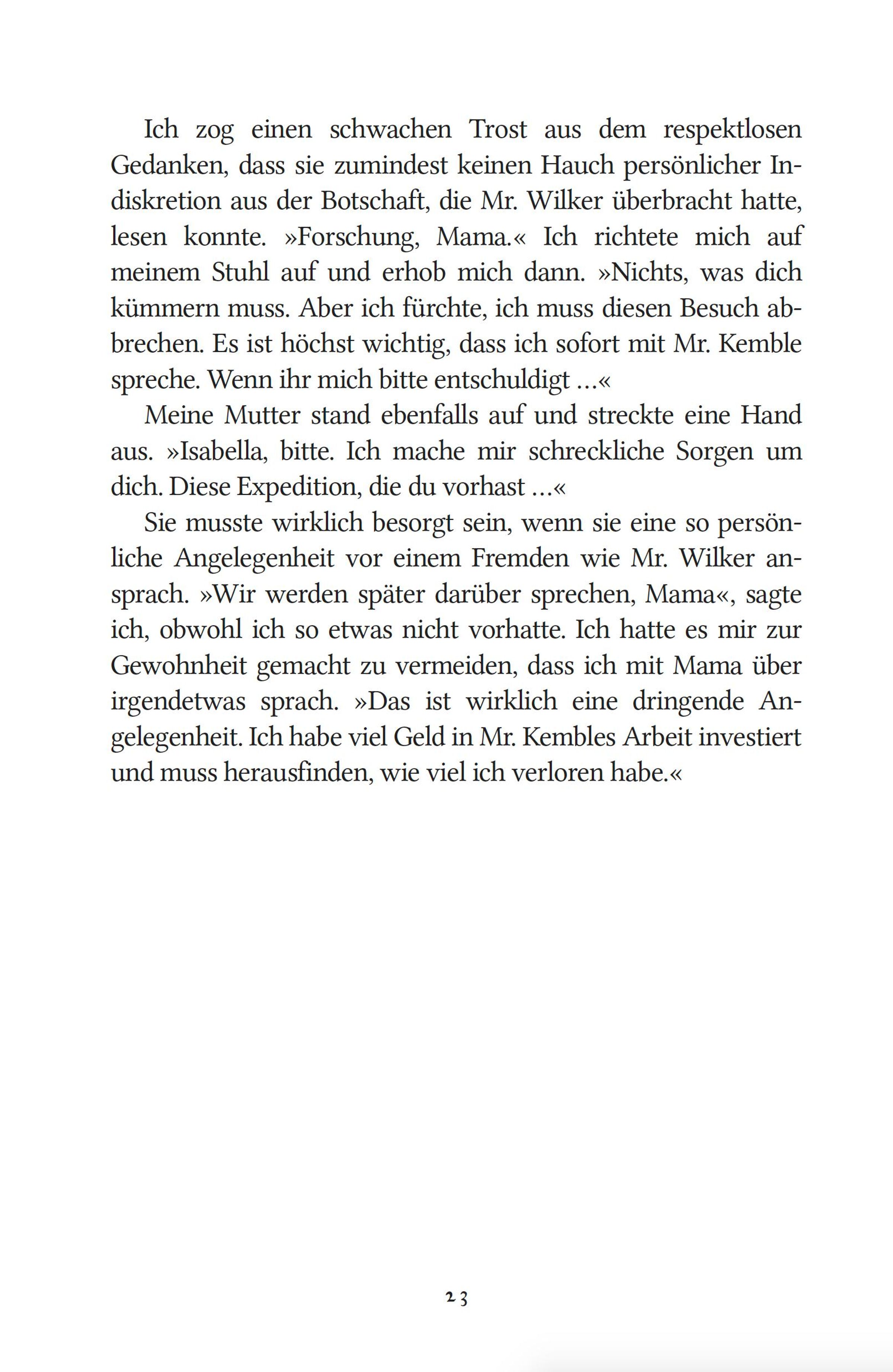 Die Expedition gestaltet sich als schwierig. In Begleitung einer alten Freundin und einer Thronerbin auf der Flucht, muss sich Isabella drückender Hitze, gnadenlosen Fiebern, Palastintrigen, Klatsch und Tratsch und anderen Bedrohungen stellen, um ihre grenzenlose Faszination alles Drachen betreffende zu befriedigen. Selbst wenn sie dafür tief in den verbotenen Dschungel vordringen muss, der gemeinhin die Grüne Hölle genannt wird. Dort werden ihr Mut, ihr Einfallsreichtum und ihre wissenschaftliche Neugierde auf Proben gestellt, wie sie es bislang noch nicht erlebt hat.