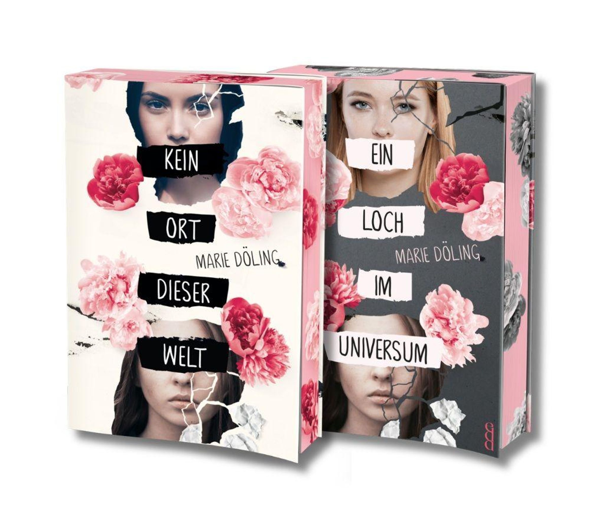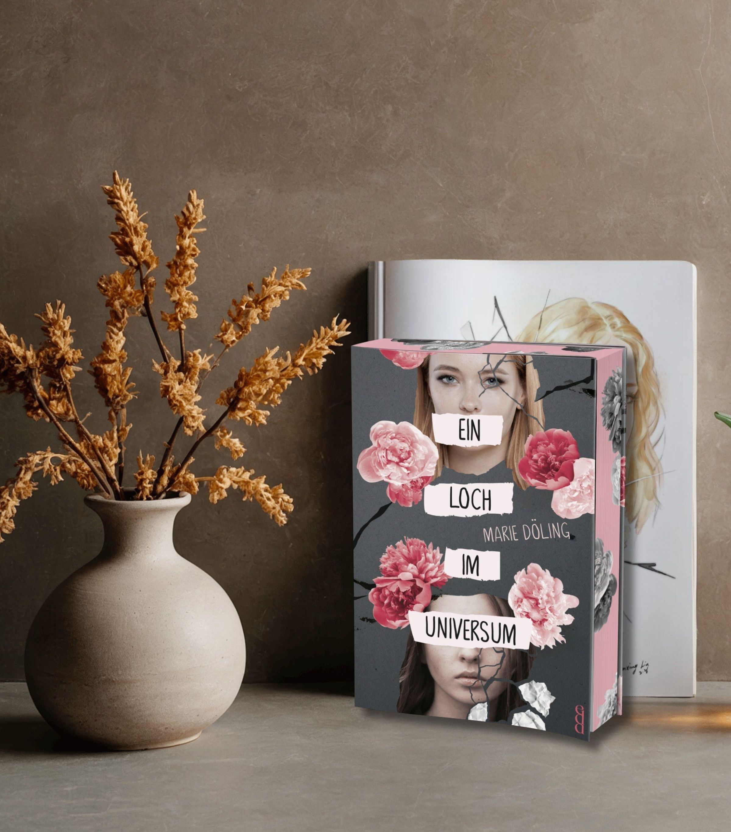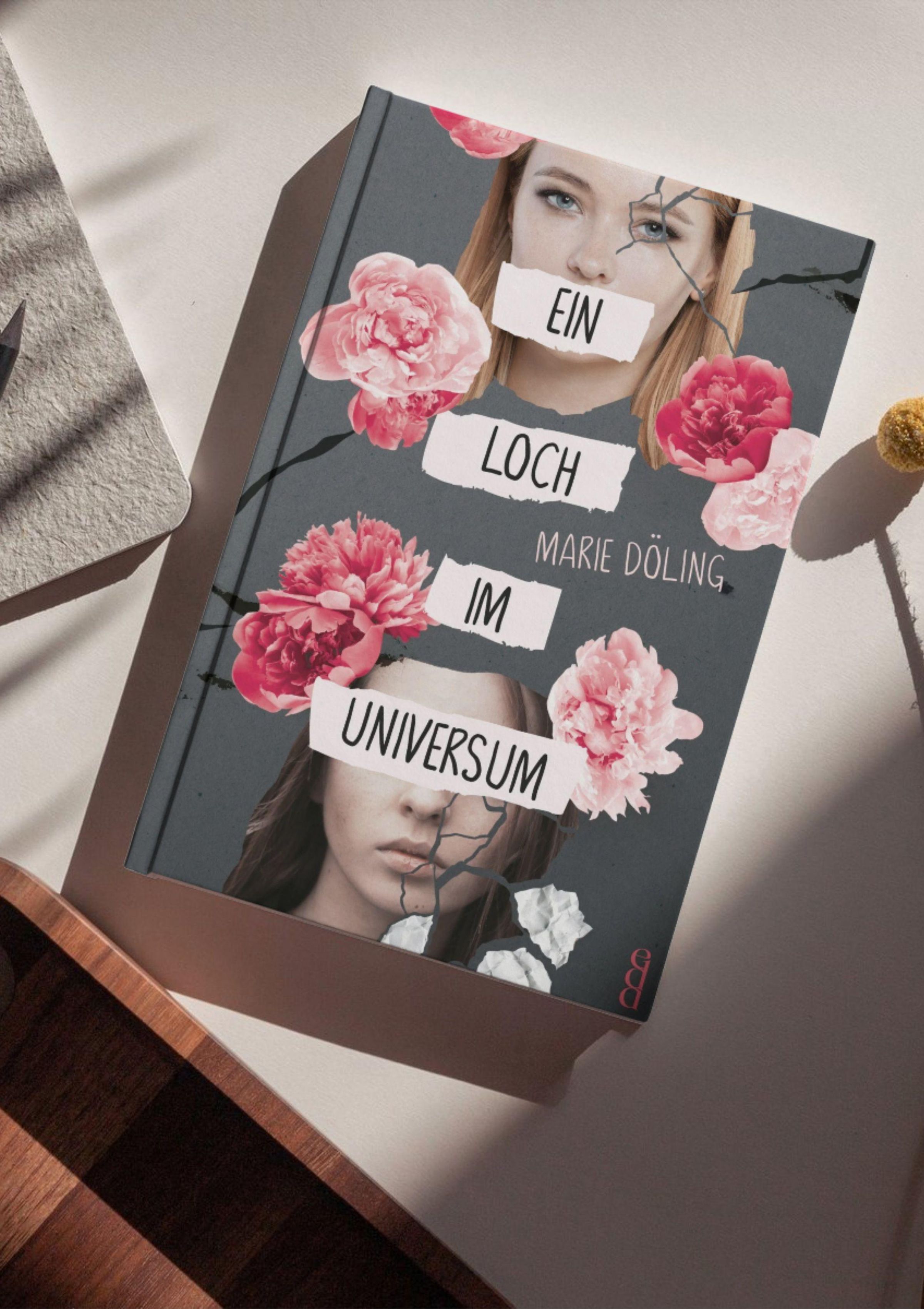 "Ein Loch im Universum" von Marie Döling, dunkles Design mit zwei Gesichtern und rosa Blumen., Buch