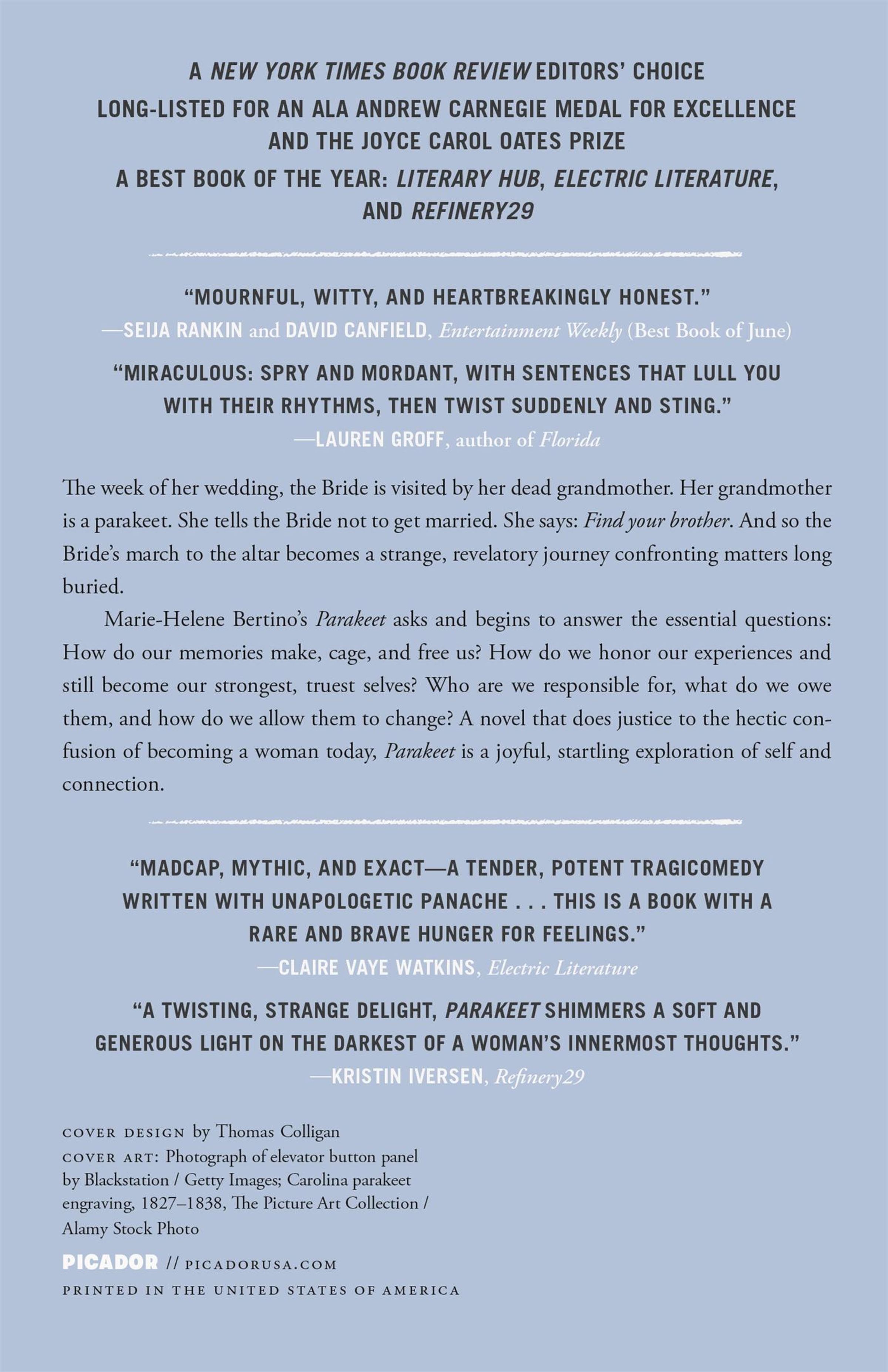 Acclaimed author of 2 A. M. at the Cat's Pajamas Marie-Helene Bertino's Parakeetis a darkly funny and warm-hearted novel about a young woman whose dead grandmother (in the form of a parakeet) warns her not to marry and sends her out to find an estranged loved one.