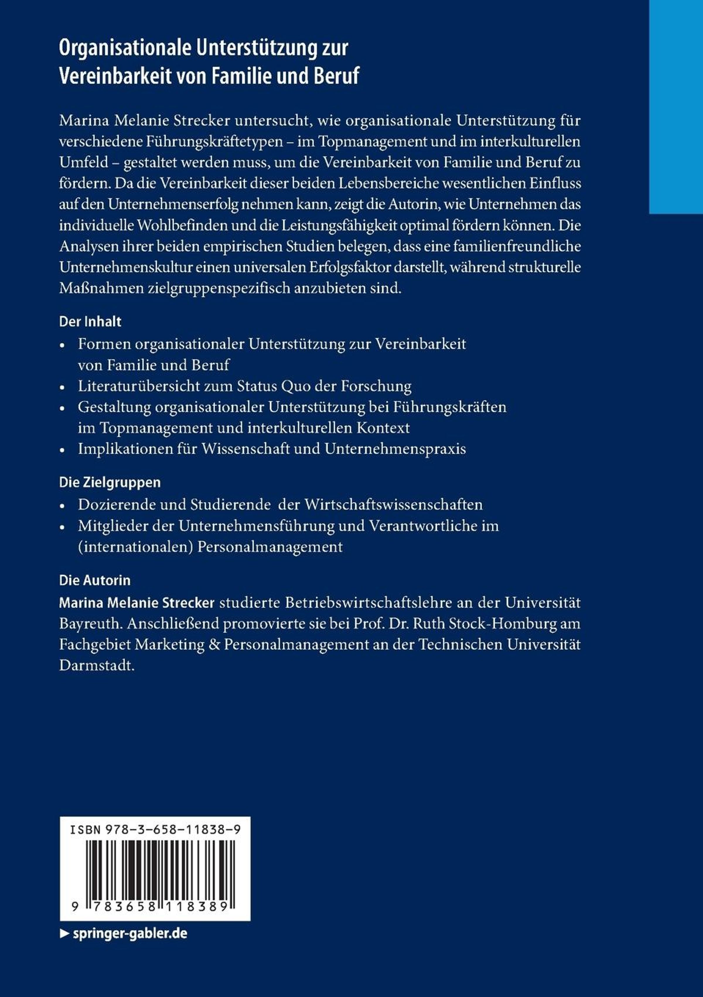 Marina Melanie Strecker untersucht, wie organisationale Unterstützung für verschiedene Führungskräftetypen im Topmanagement und im interkulturellen Umfeld gestaltet werden muss, um die Vereinbarkeit von Familie und Beruf zu fördern. Da die Vereinbarkeit dieser beiden Lebensbereiche wesentlichen Einfluss auf den Unternehmenserfolg nehmen kann, zeigt die Autorin, wie Unternehmen das individuelle Wohlbefinden und die Leistungsfähigkeit optimal fördern können. Die Analysen ihrer beiden empirischen Studien belegen, dass eine familienfreundliche Unternehmenskultur einen universalen Erfolgsfaktor darstellt, während strukturelle Maßnahmen zielgruppenspezifisch anzubieten sind.