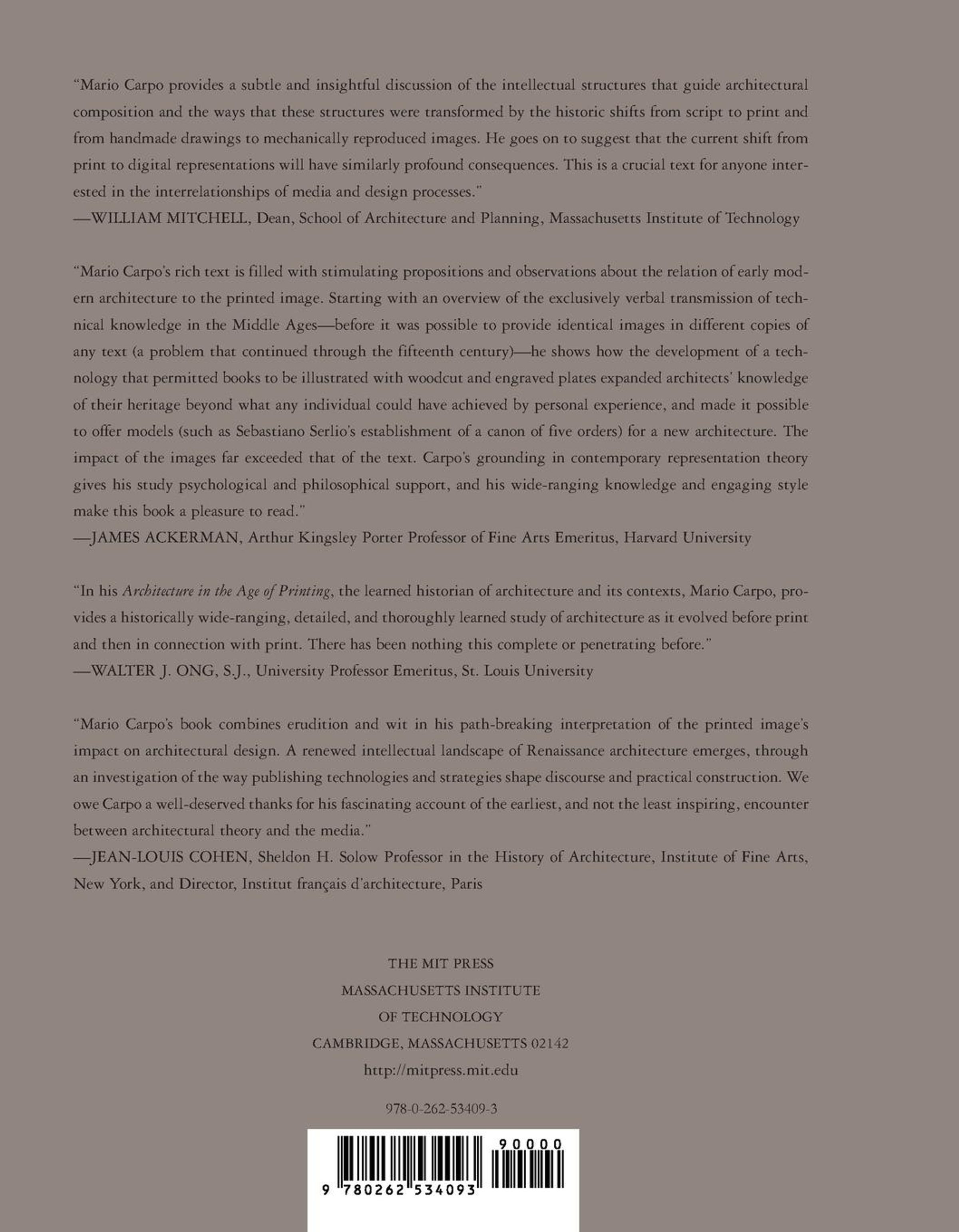 The discipline of architecture depends on the transmission in space and time of accumulated experiences, concepts, rules, and models. From the invention of the alphabet to the development of ASCII code for electronic communication, the process of recording and transmitting this body of knowledge has reflected the dominant information technologies of each period. In this book Mario Carpo discusses the communications media used by Western architects, from classical antiquity to modern classicism, showing how each medium related to specific forms of architectural thinking.