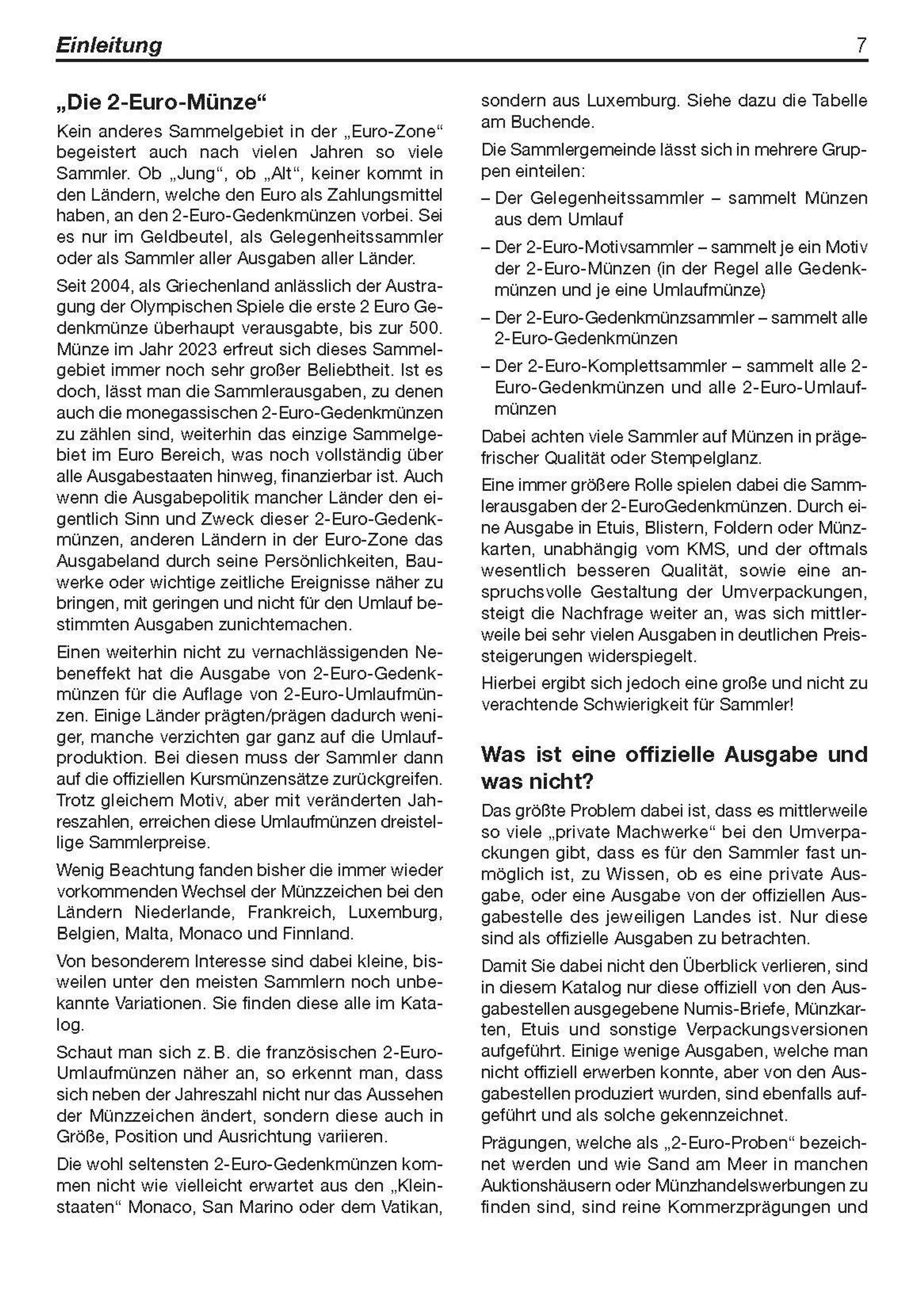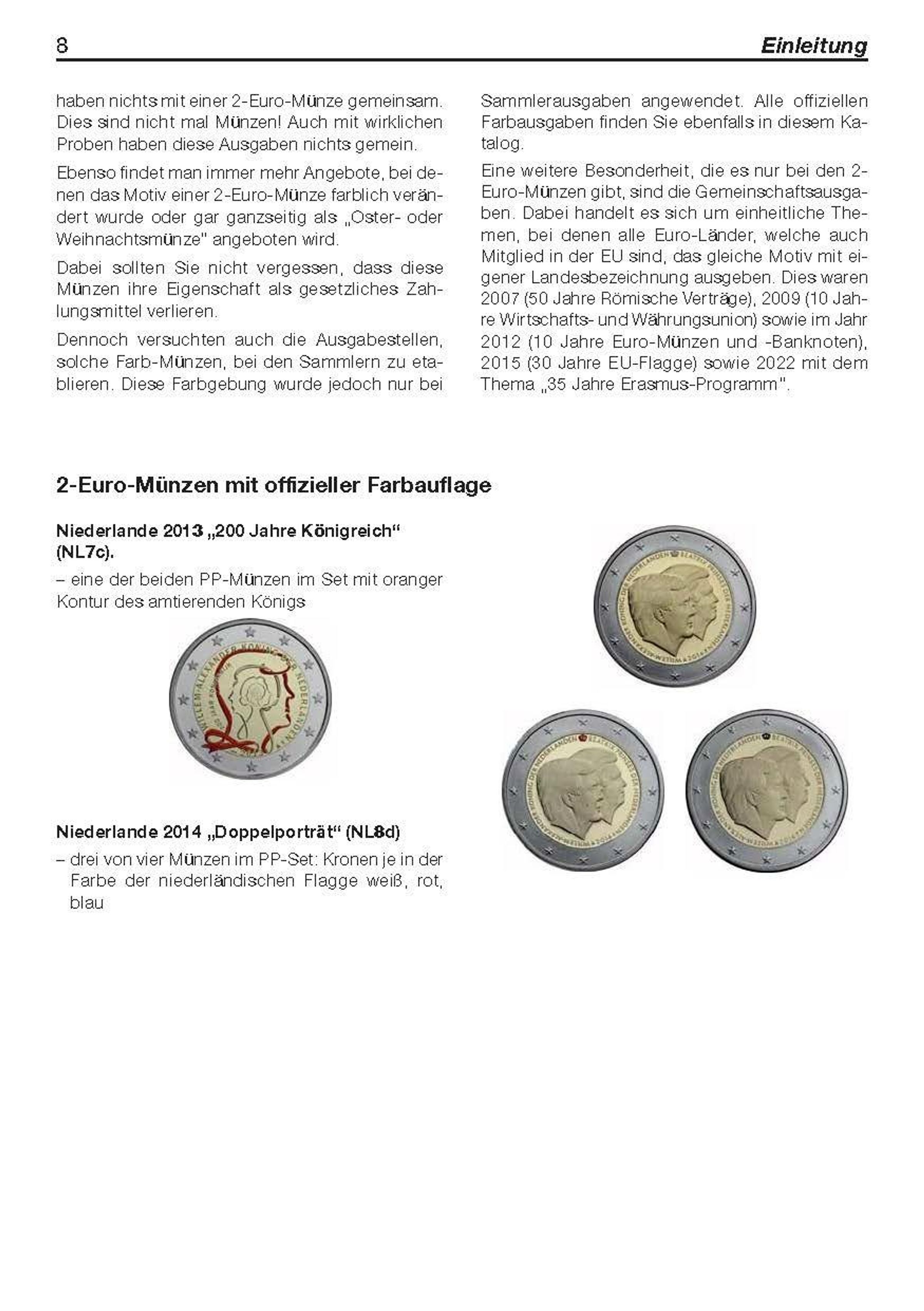 In diesem Katalog findet der Sammler sämtliche 2-Euro-Münzen aller Euro Länder inklusive der Kleinstaaten Andorra, Monaco, San Marino und dem Vatikan. Besondere Aufmerksamkeit erhalten dabei die offiziellen Sammlerausgaben in Foldern, Münzkarten und Blistern sowie in der Qualität "Polierte Platte". Der Katalog ist schwarz-weiß bebildert. Alle Münzen sind beschrieben, mit aktuellen Auflagezahlen versehen und marktgerecht bewertet. Für den Sammler von 2-Euro-Münzen stellt dieser Katalog die ideale Richtschnur für den Aufbau und die Verwaltung seiner eigenen Sammlung dar.