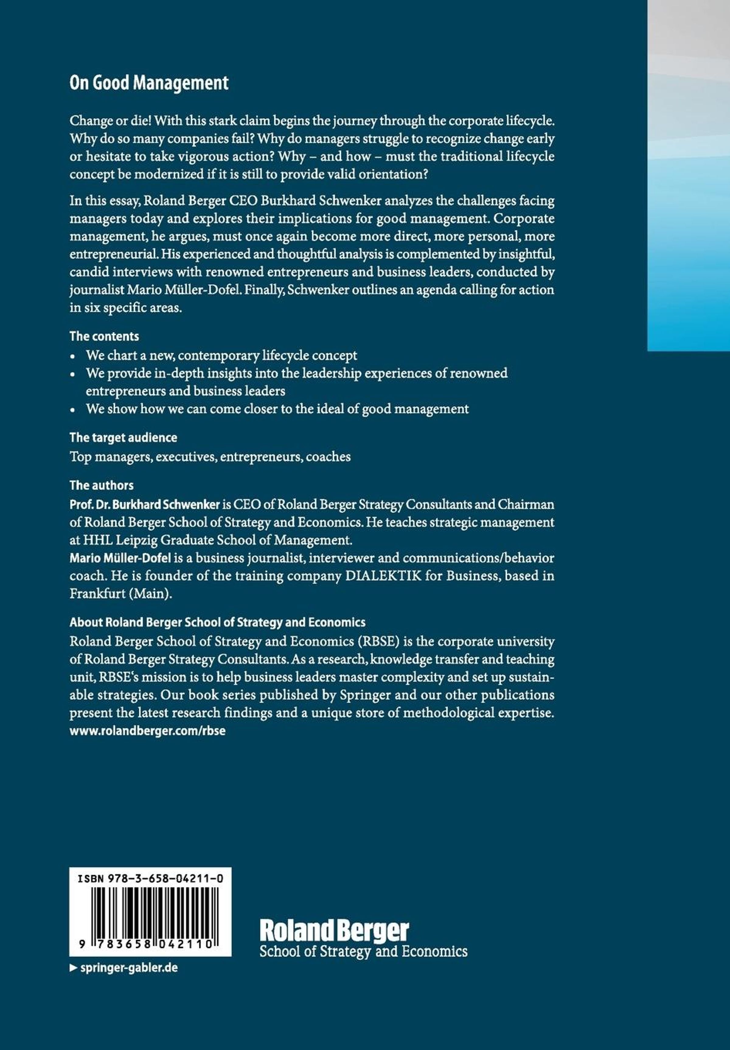Change or die! With this stark claim begins the journey through the corporate lifecycle. Why do so many companies fail? Why do managers struggle to recognize change early or hesitate to take vigorous action? Why and how must the traditional lifecycle concept be modernized if it is still to provide valid orientation? In this essay, Roland Berger CEO Burkhard Schwenker analyzes the challenges facing managers today and explores their implications for good management. Corporate management, he argues, must once again become more direct, more personal, more entrepreneurial. His experienced and thoughtful analysis is complemented by insightful, candid interviews with renowned entrepreneurs and business leaders, conducted by journalist Mario Müller-Dofel. Finally, Schwenker outlines an agenda calling for action in six specific areas.
