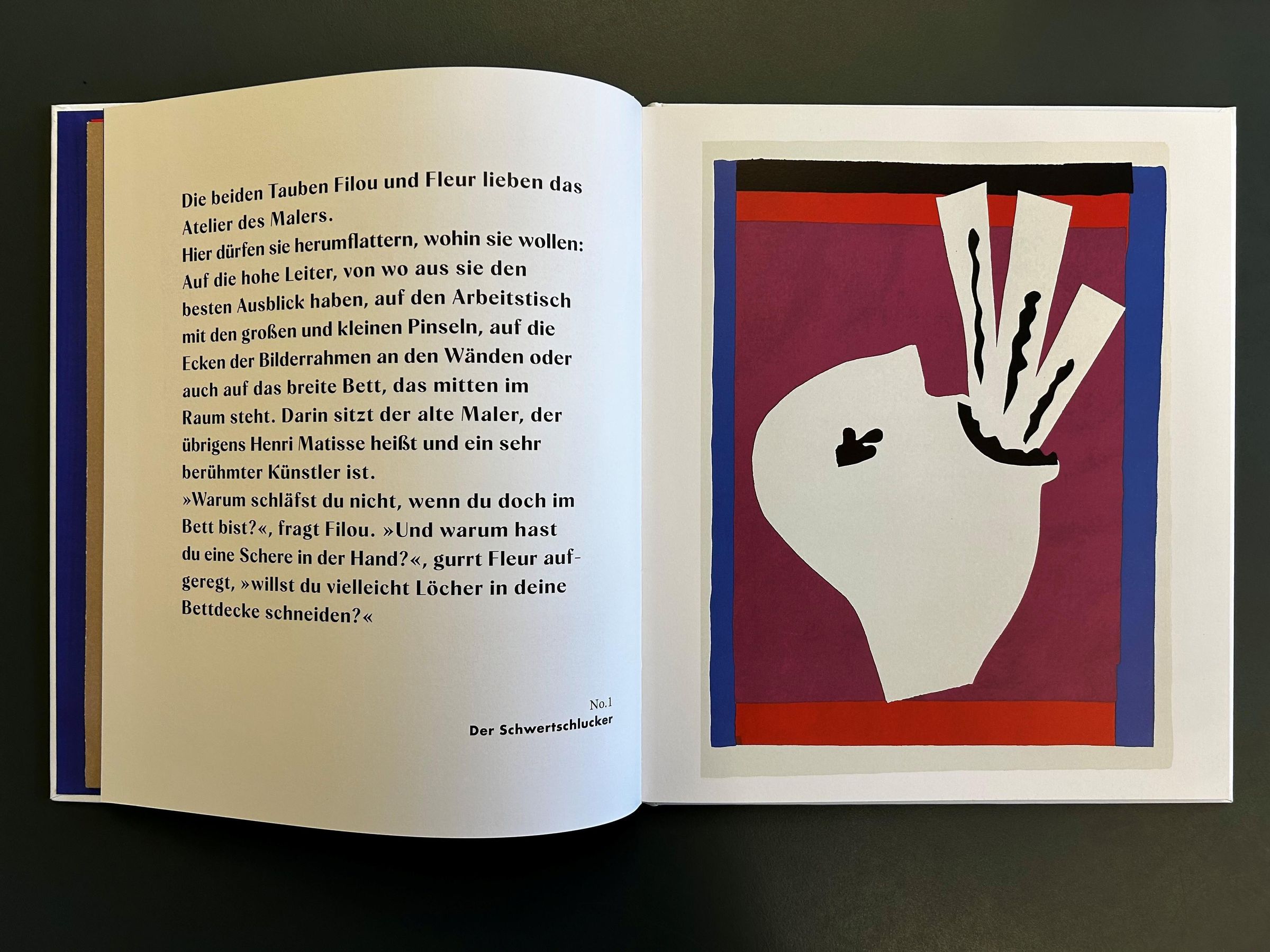 >>Das kann ich nicht, das schaffe ich nicht!<< Dies haben die beiden Tauben Filou und Fleur, die im Atelier von Henri Matisse rumflattern, nie von ihm gehört, nicht einmal, als der alte Maler im Rollstuhl saß und nicht mehr so gut arbeiten konnte. Aufgeben war für ihn keine Option, er legte die Hände nicht in den Schoß, sondern begann >>mit der Schere zu zeichnen<<, wie er es nannte.