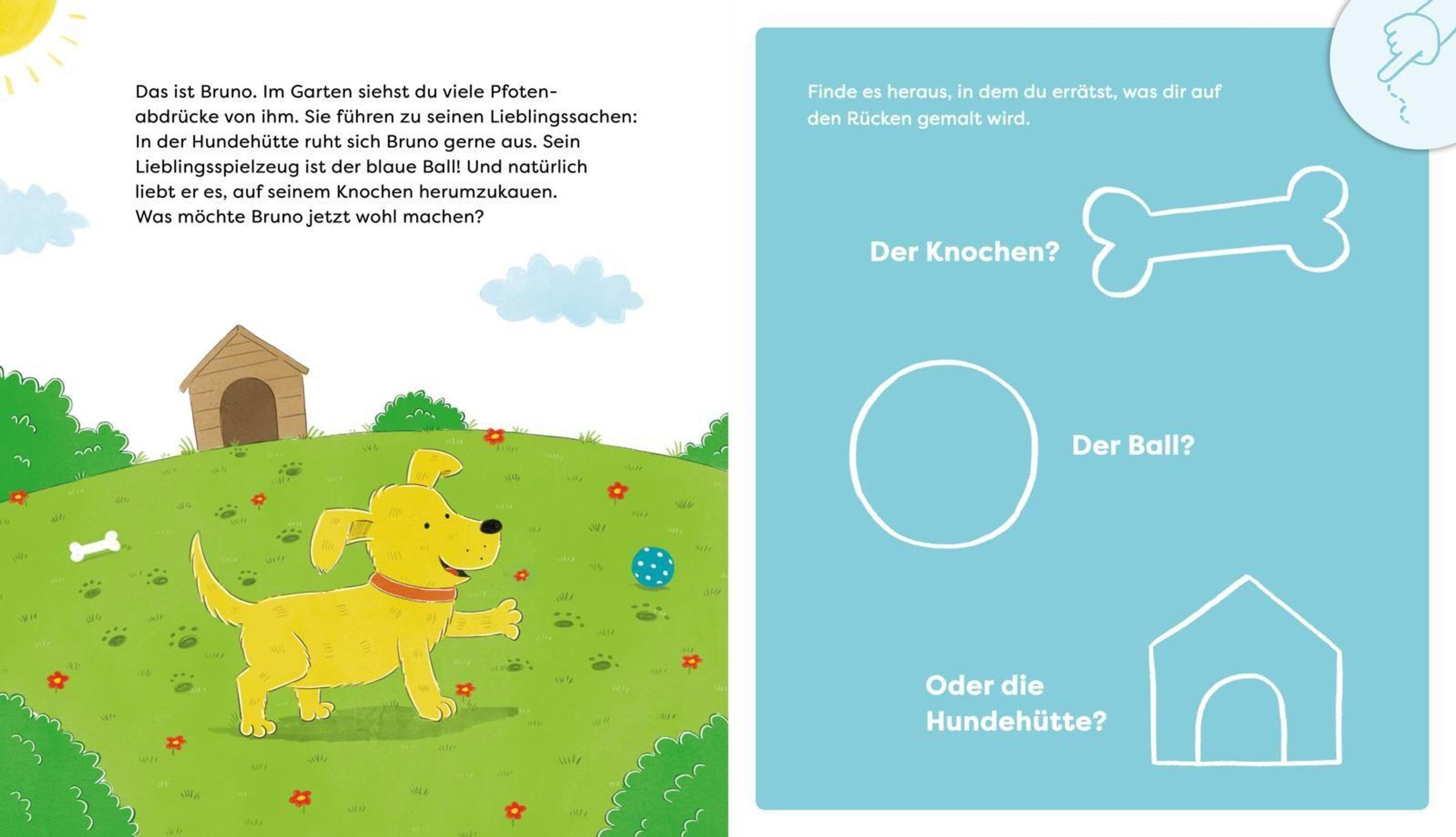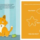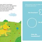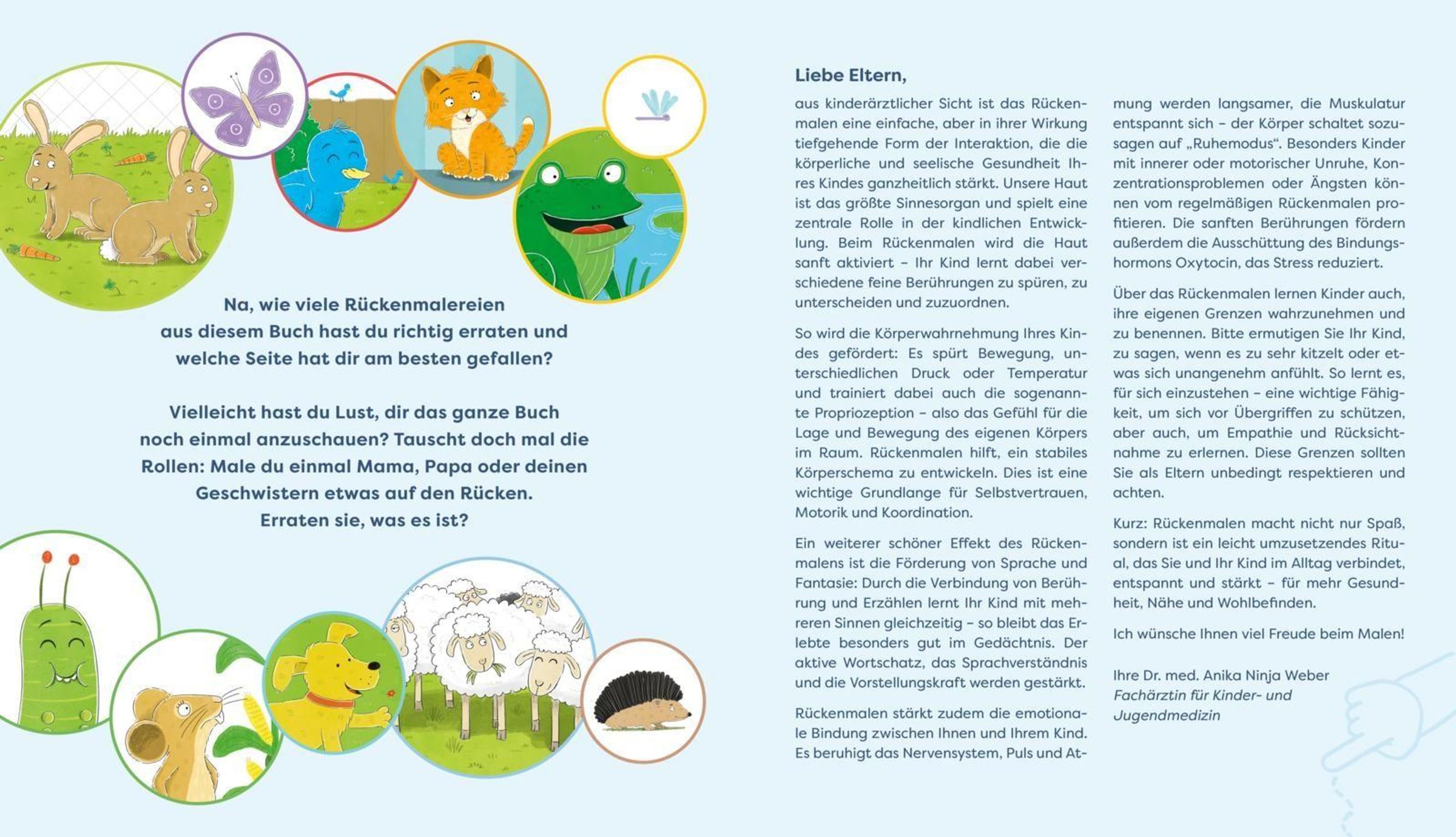 Titel: "Eins, zwei, drei, Rückenmalerei". Untertitel: "Fühlst du, was ich male?". Zwei Tiere spielen zusammen., Buch