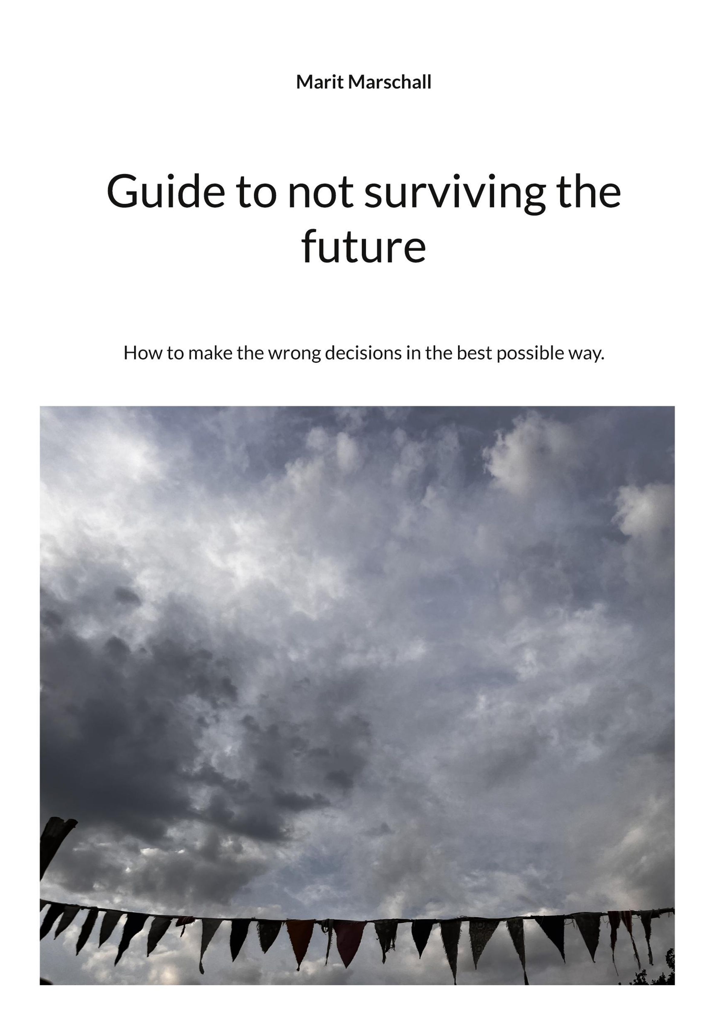 Text: "Guide to not surviving the future. How to make the wrong decisions in the best possible way." Wolkenhimmel mit Wimpeln., Buch