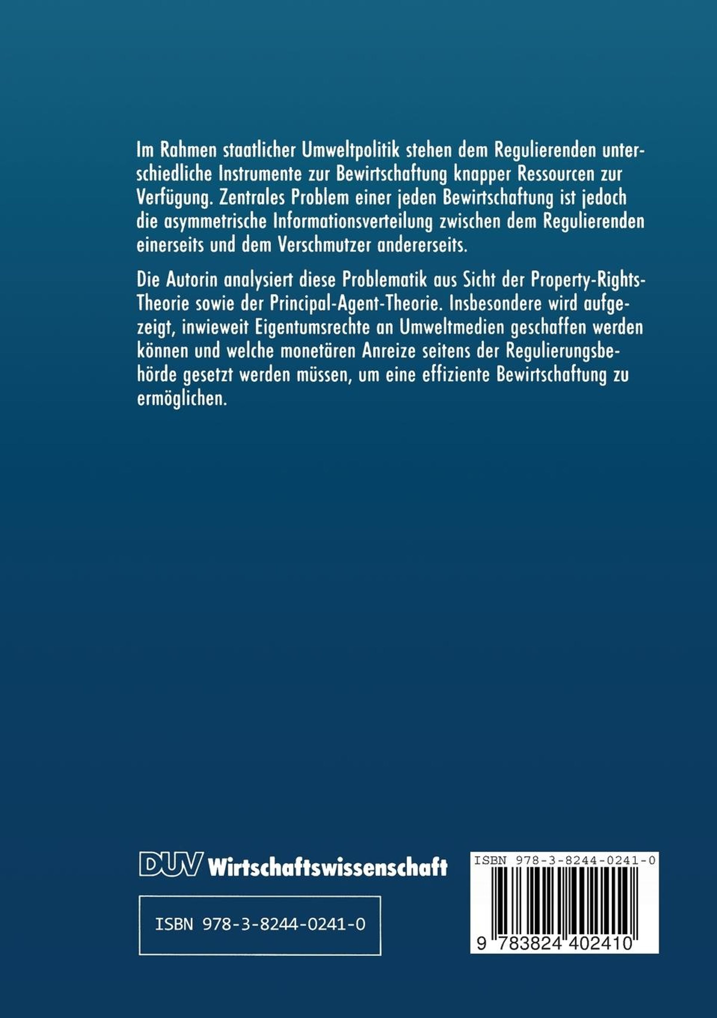 Marktwirtschaftliche Ansätze der Umweltpolitik beruhen auf dem Grundgedanken, daß für knappe Umweltgüter Preise zustande kommen müssen, die die Wirtschaftssubjekte zum sparsamen Umgang damit veranlassen. Solche Preise können direkt in Form von Steuern von staatlicher Seite festgesetzt werden, sie können aber auch indirekt zustande kommen, indem für die Nutzung von Umweltgütern Zertifikate ausgegeben und gehandelt werden. In beiden Fällen muß der Staat regulierend eingreifen. Eine Regulierungsbehörde steht dabei vor dem Problem, daß sie weder den Nutzen noch die Kosten einer Verbesserung der Umweltqualität kennt. Insbesondere hinsichtlich der Kosten besteht Informationsasymmetrie zwischen der Regulierungsbehörde einerseits und den Nutzern von Umweltgütern, vor allem den Unternehmen, andererseits. Dieses Problem steht im Mittelpunkt der vorliegenden Untersuchung. Es geht darum, wie ein System von Anreizen geschaffen werden kann, das die Unternehmen veranlaßt, ihre Information über die Kosten einer Verbesserung der Umweltqualität offenzulegen und dadurch der Regulierungsbehörde eine Optimierung zu ermöglichen. Eine formal ähnliche Problemstellung ist in der Literatur für einen anderen Anwen dungsfall untersucht worden, nämlich für die Regulierung von Versorgungsunter nehmen. Dieser theoretische Ansatz wird in der vorliegenden Arbeit für den Bereich der Umweltpolitik übertragen. Daraus ergeben sich wichtige Einsichten über die Instrumente, mit denen man auch im Bereich der Umweltpolitik die Auswirkungen der Informationsasymmetrie bewältigen kann. Für die Theorie der Umweltpolitik bringt die Untersuchung beachtliche Anregungen. Herbert Hax Danksagung Die vorliegende Arbeit wurde am 22. Dezember 1994 von der Wirtschafts-und Sozialwissenschaftlichen Fakultät der Universität zu Köln als Dissertation angenommen.