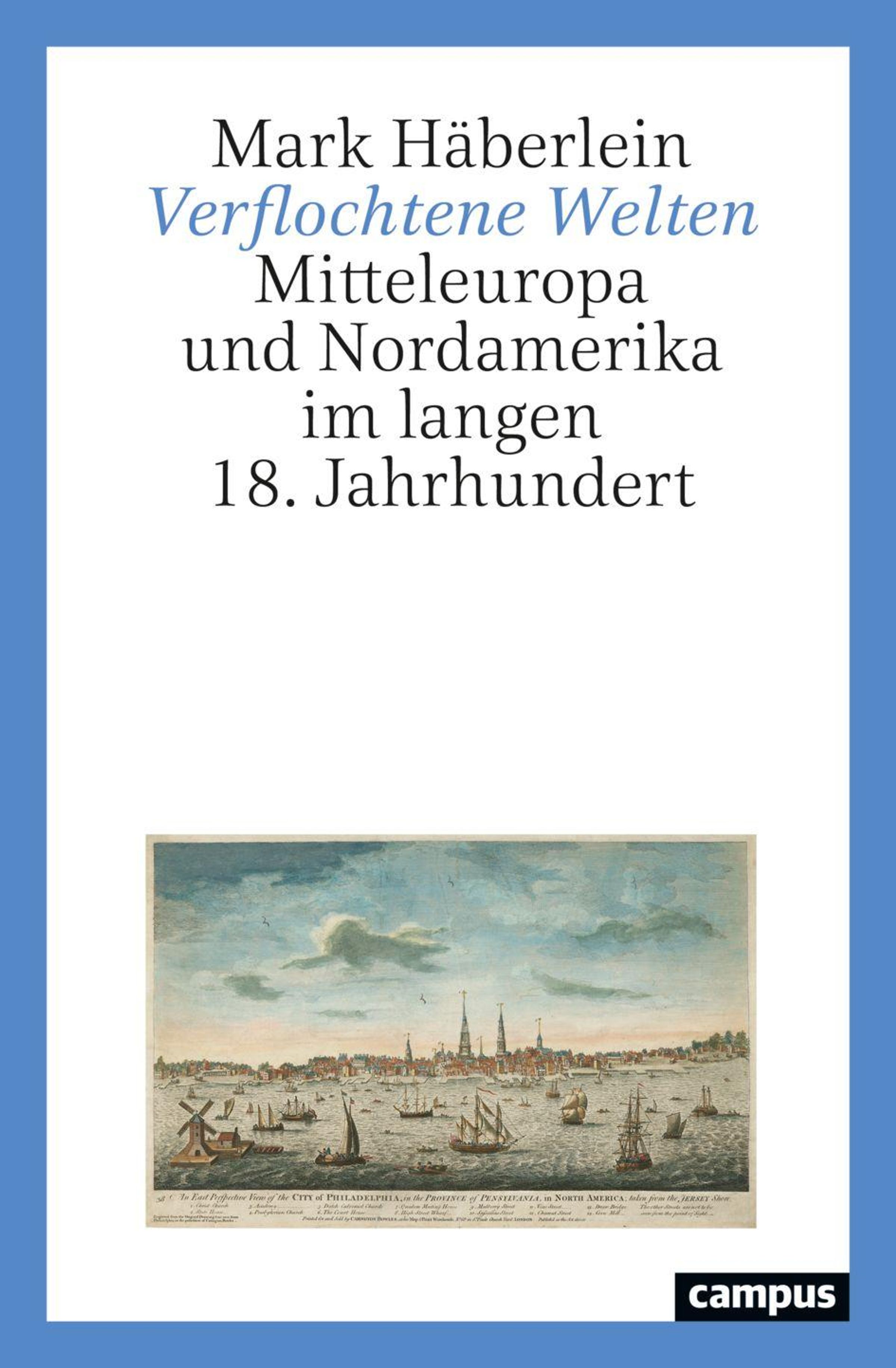 Buchtitel: "Verflochtene Welten: Mitteleuropa und Nordamerika im langen 18. Jahrhundert" von Mark Häberlein. Illustration von Segelschiffen vor einer Stadtansicht., Buch