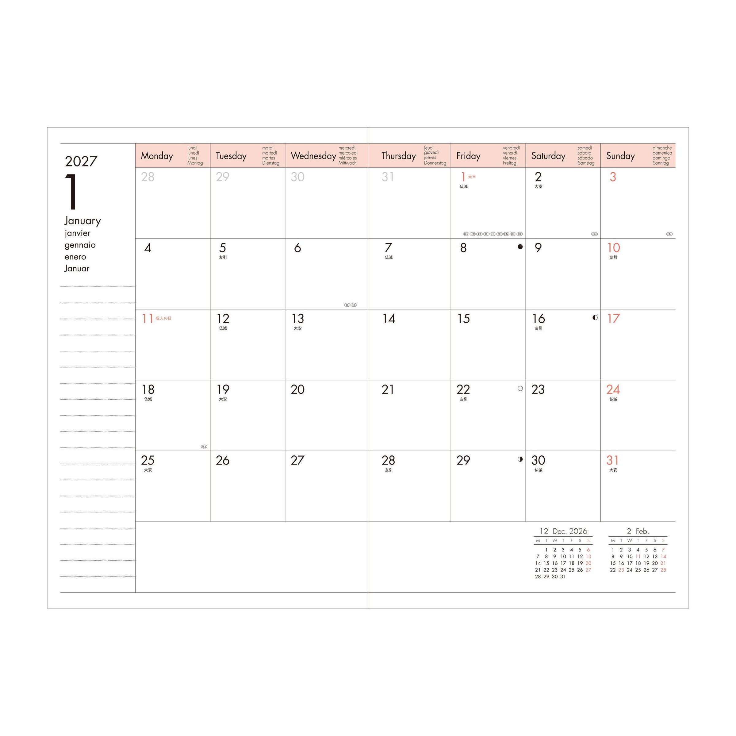 Internationaler Kalender (FSC-zertifiziertes Papier) in B6 (Wochenplaner - vertikal) mit patentierter Zipp-Reißverschluss-Hülle, in der sich z. B. Stifte, Tickets, Mobiltelefone praktisch verstauen lassen. Der Touchscreen von Smartphones kann durch die PVC-Hülle (aus Phthalatfreiem PVC) von außen bedient werden. Kalendarium mit 15 Monaten, beginnend mit Oktober 2026. Internationale und deutsche Feiertage. Eine Doppelseite zum Planen pro Woche, monatliche Übersichten.
