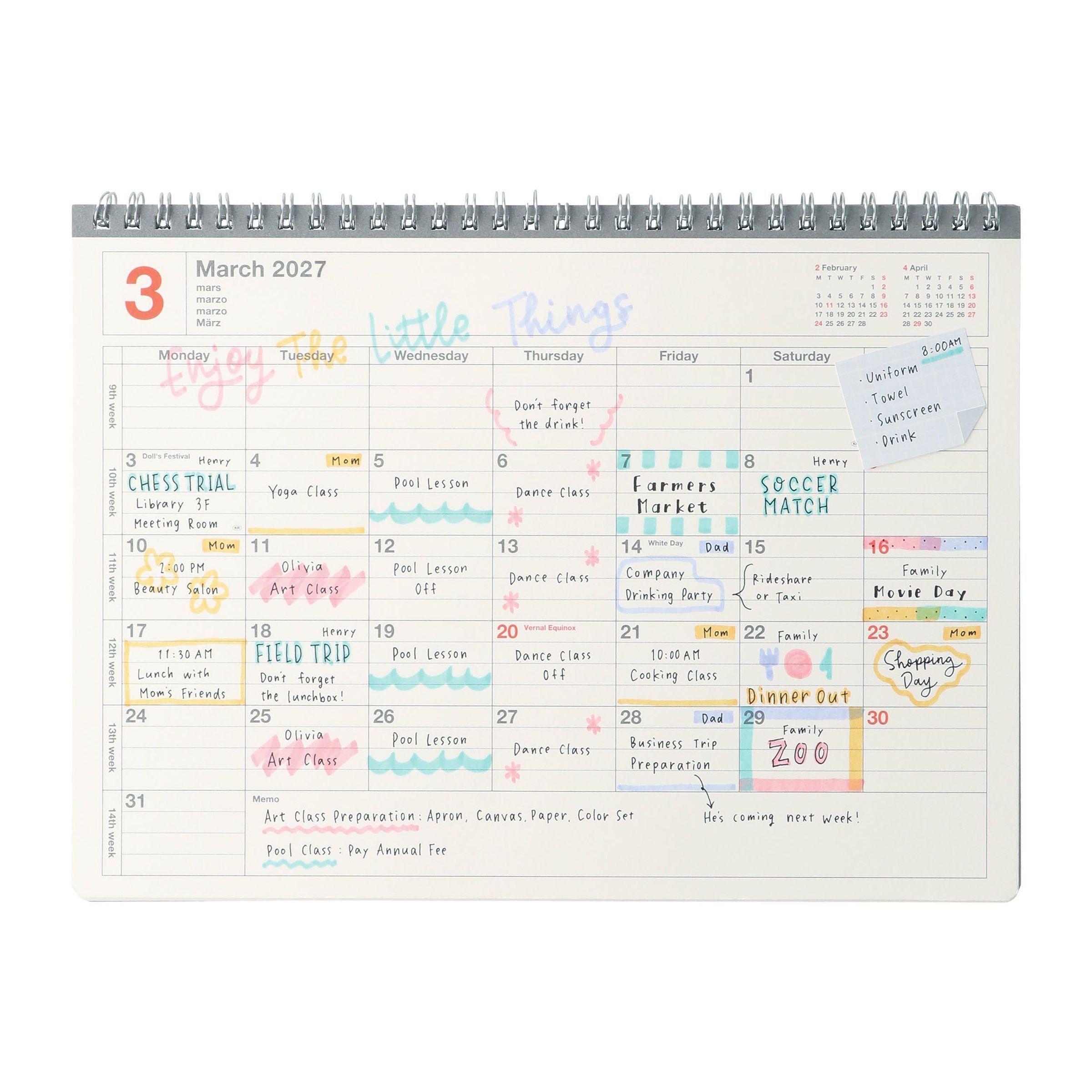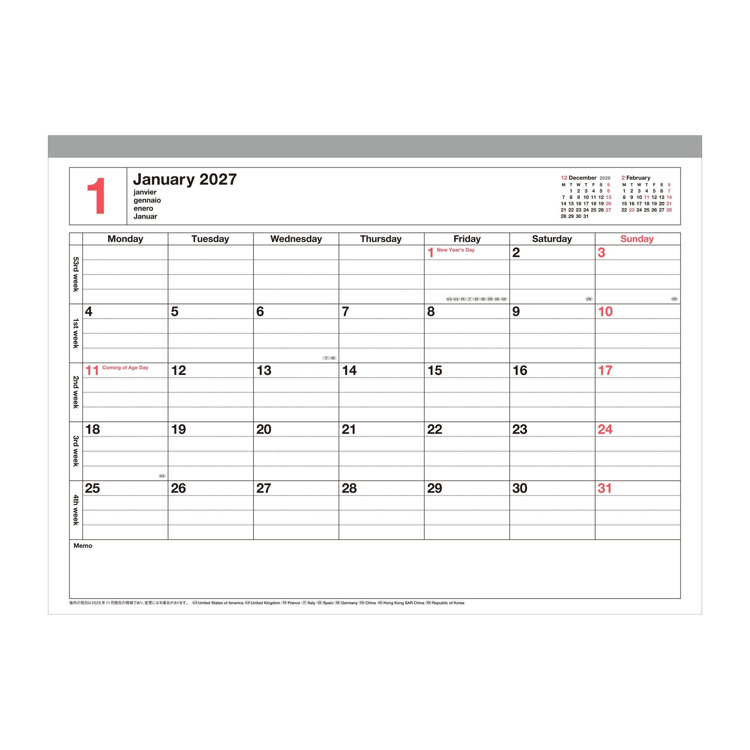 Tischkalender mit Spiralbindung, beginnend im Januar 2027, 1 Monat / 1 Seite und Jahresübersicht / 1 Seite, internationale und deutsche Feiertage