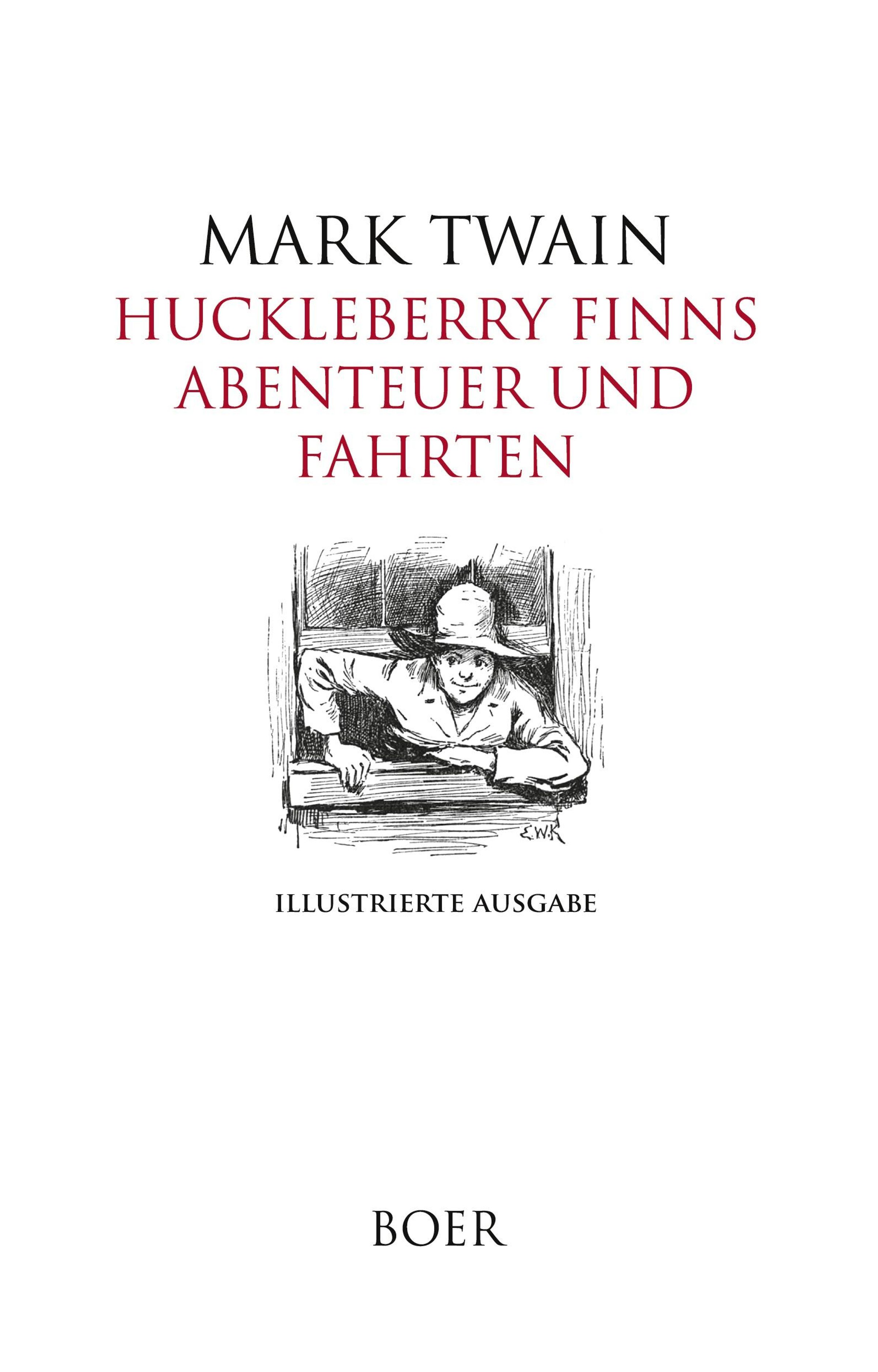 Titel: "HUCKLEBERRY FINNS ABENTEUER UND FAHRTEN". Illustration zeigt einen Jungen am Fenster. Darunter: "ILLUSTRIERTE AUSGABE". Oben steht "MARK TWAIN". Unten: "BOER"., Buch