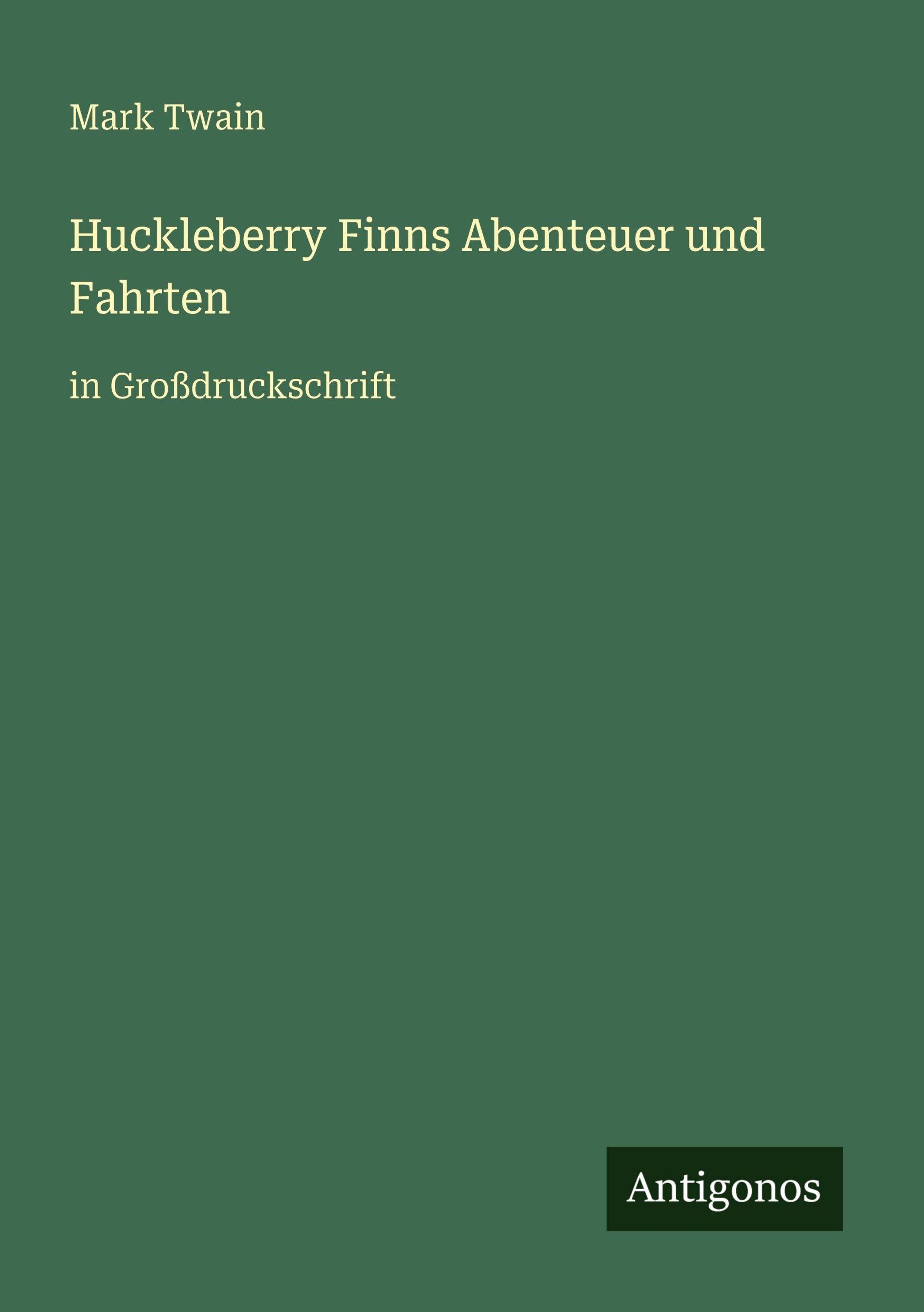 Mark Twain, "Huckleberry Finns Abenteuer und Fahrten", Großdruckschrift, Antigonos, grüner Hintergrund., Buch