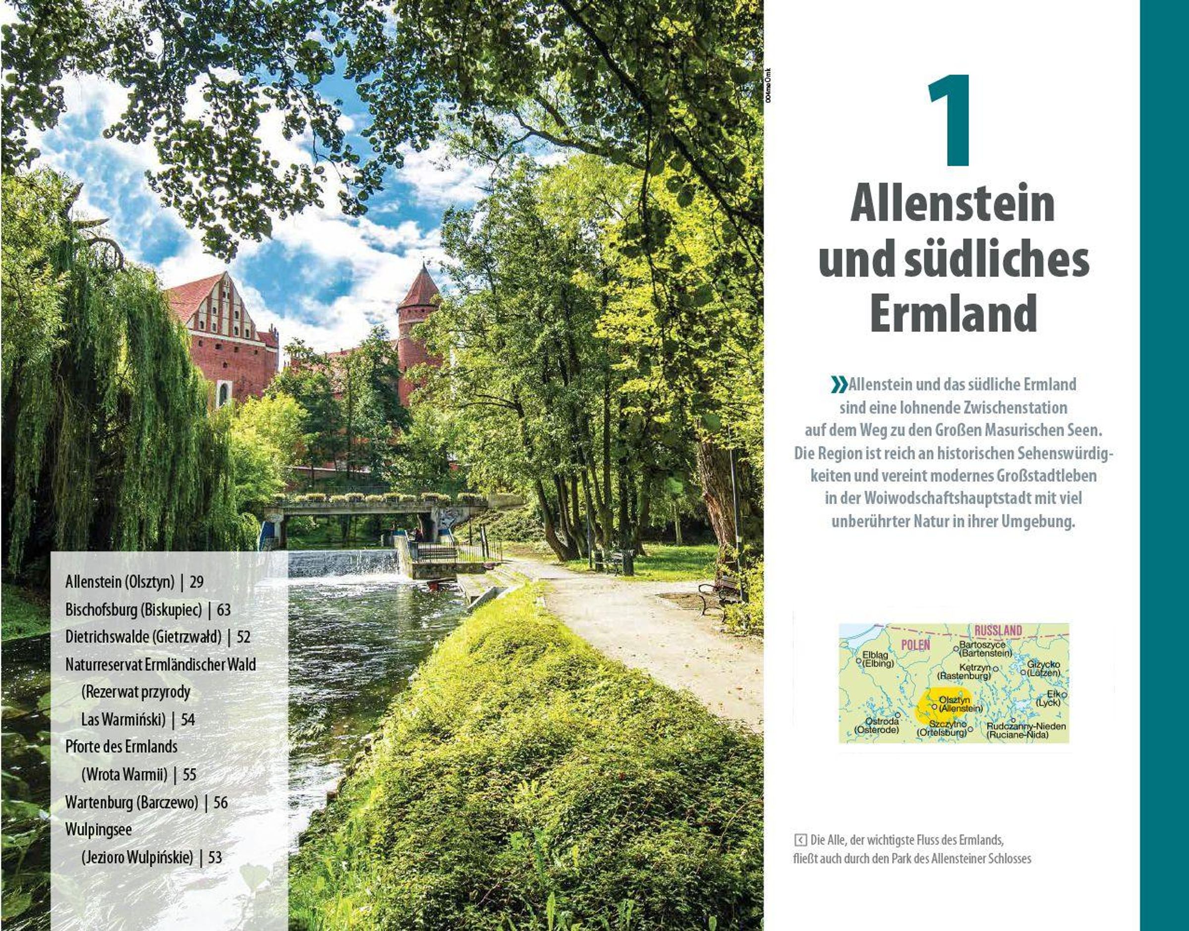 Die bedeutendsten Regionen im Überblick: Allenstein und südliches Ermland, zentrales Ermland, nordwestliches Ermland und Frisches Haff, westliches Masuren, südliches Masuren und große Masurische Seen