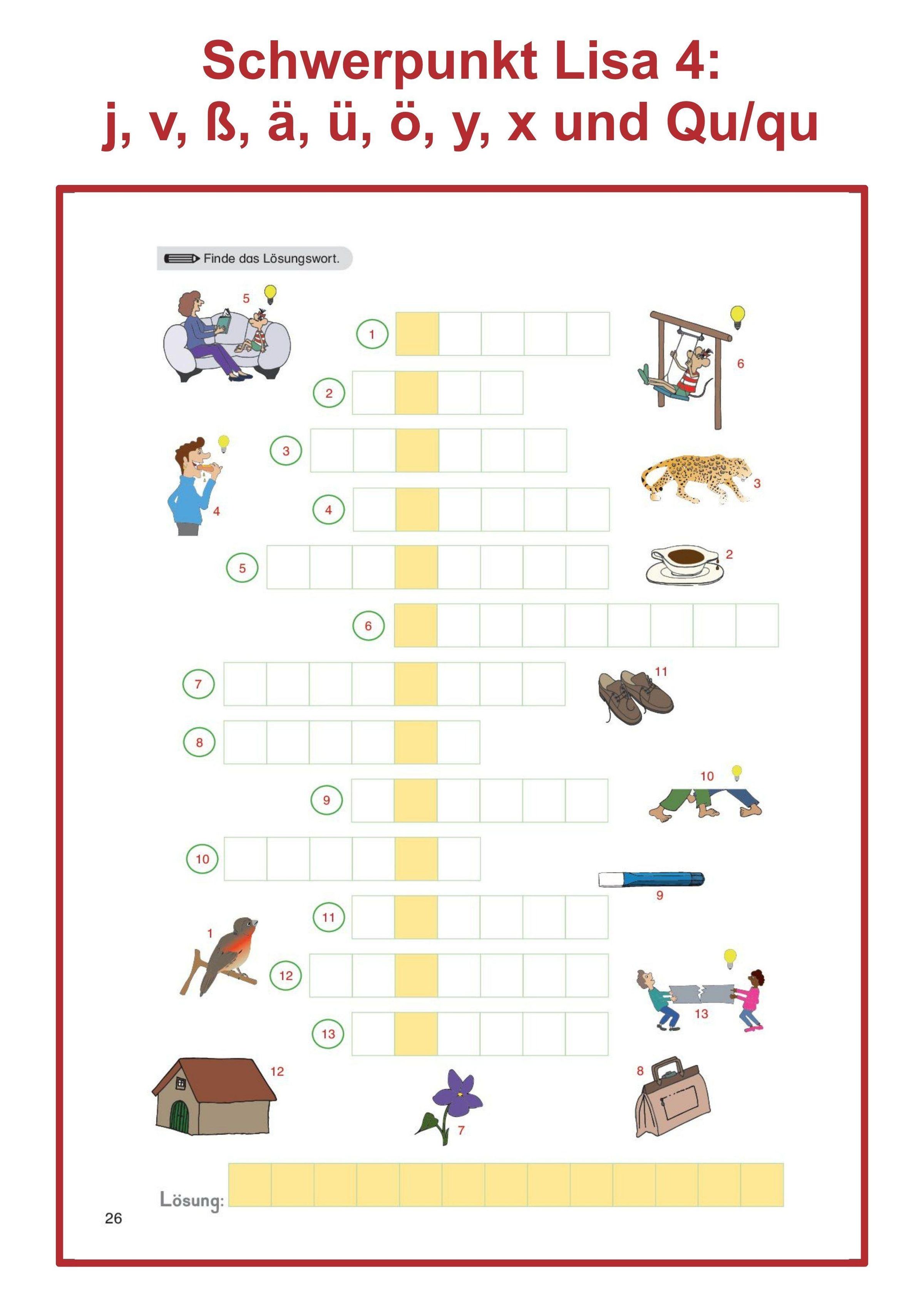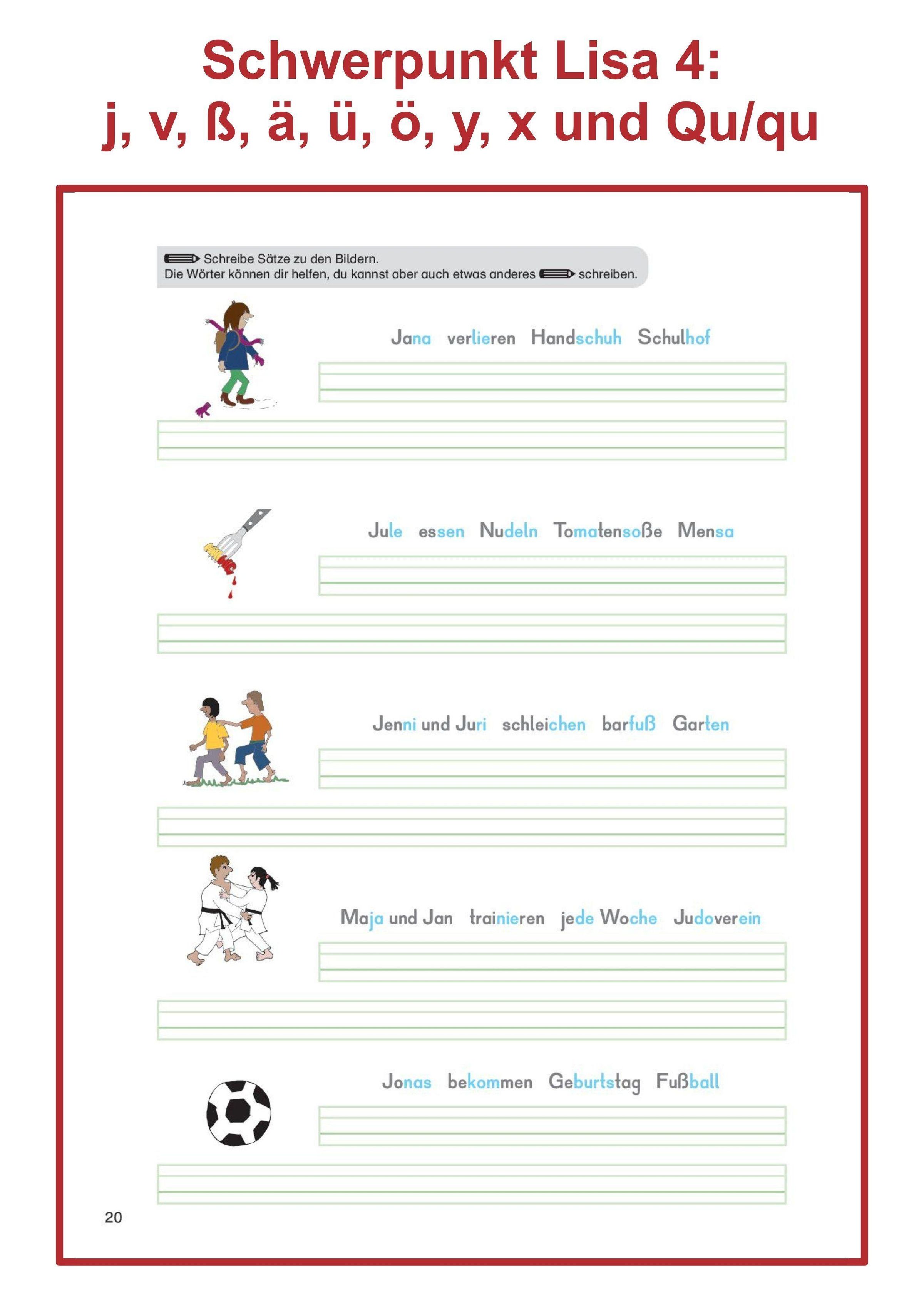Heft 4 der Reihe "Trainieren mit Lisa" legt den Fokus auf: j, v, ß, ä, ü, ö, y, x und Qu / qu. Außerdem sind Übungen zu Vorsilben und zum ck enthalten.