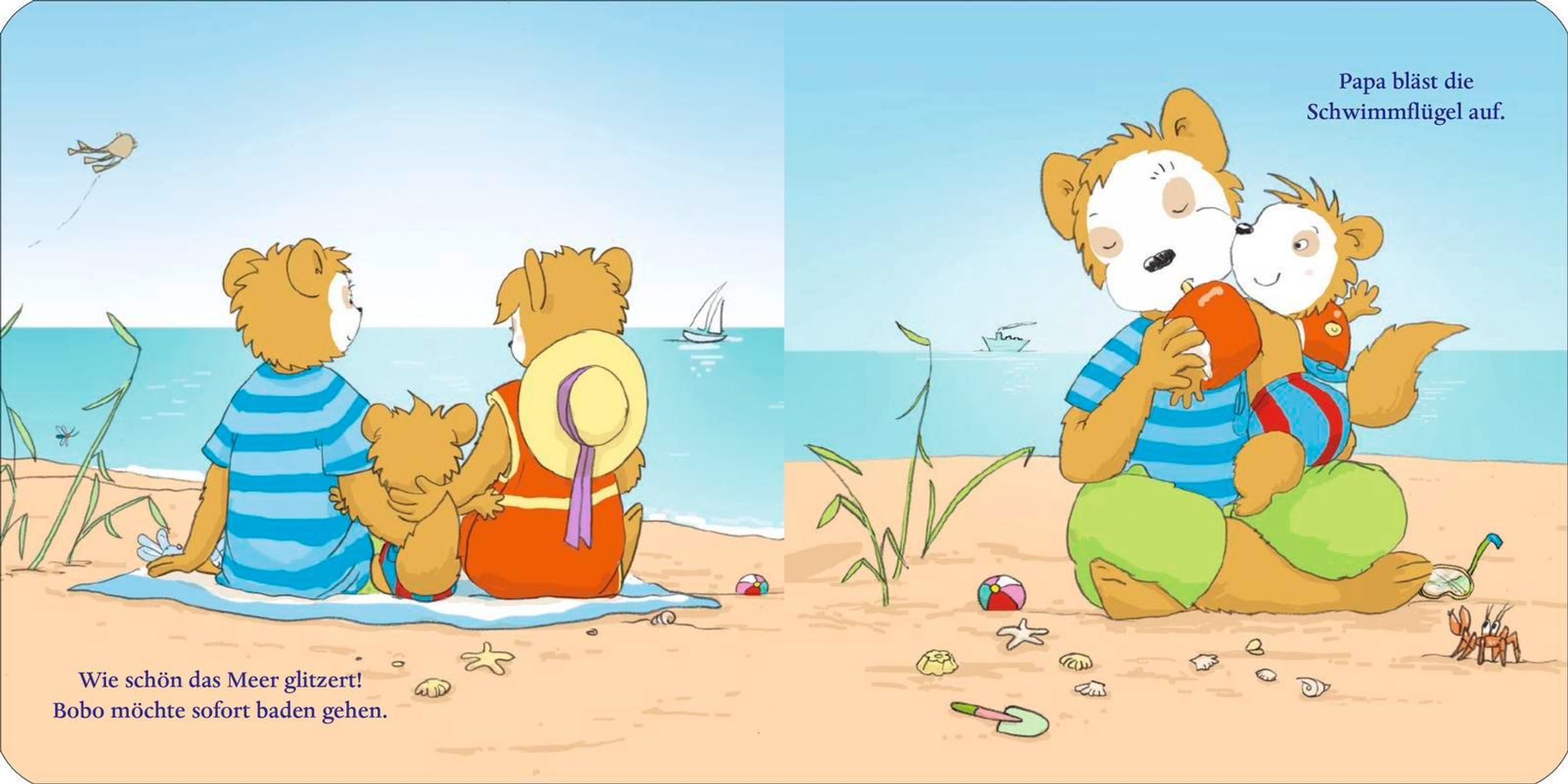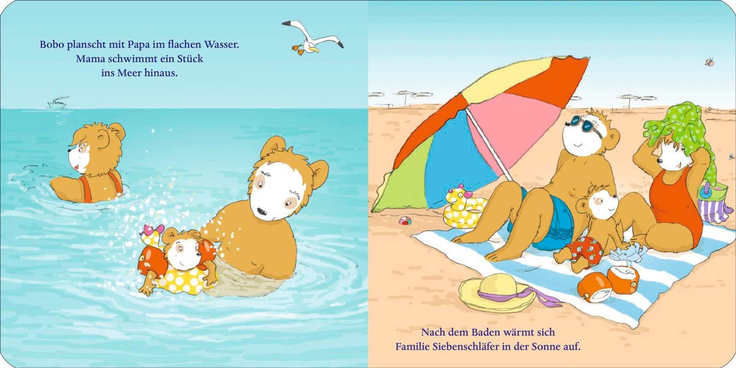 Familie Siebenschläfer ist in den Ferien am Meer! Erst fahren Bobo und seine Eltern mit einer kleinen Bahn am Strand entlang. Dann spielt Bobo im weichen Sand. Er badet mit Papa in den Wellen, findet Muscheln und besucht mit seinen Eltern ein Aquarium. Was für ein herrlicher Tag!