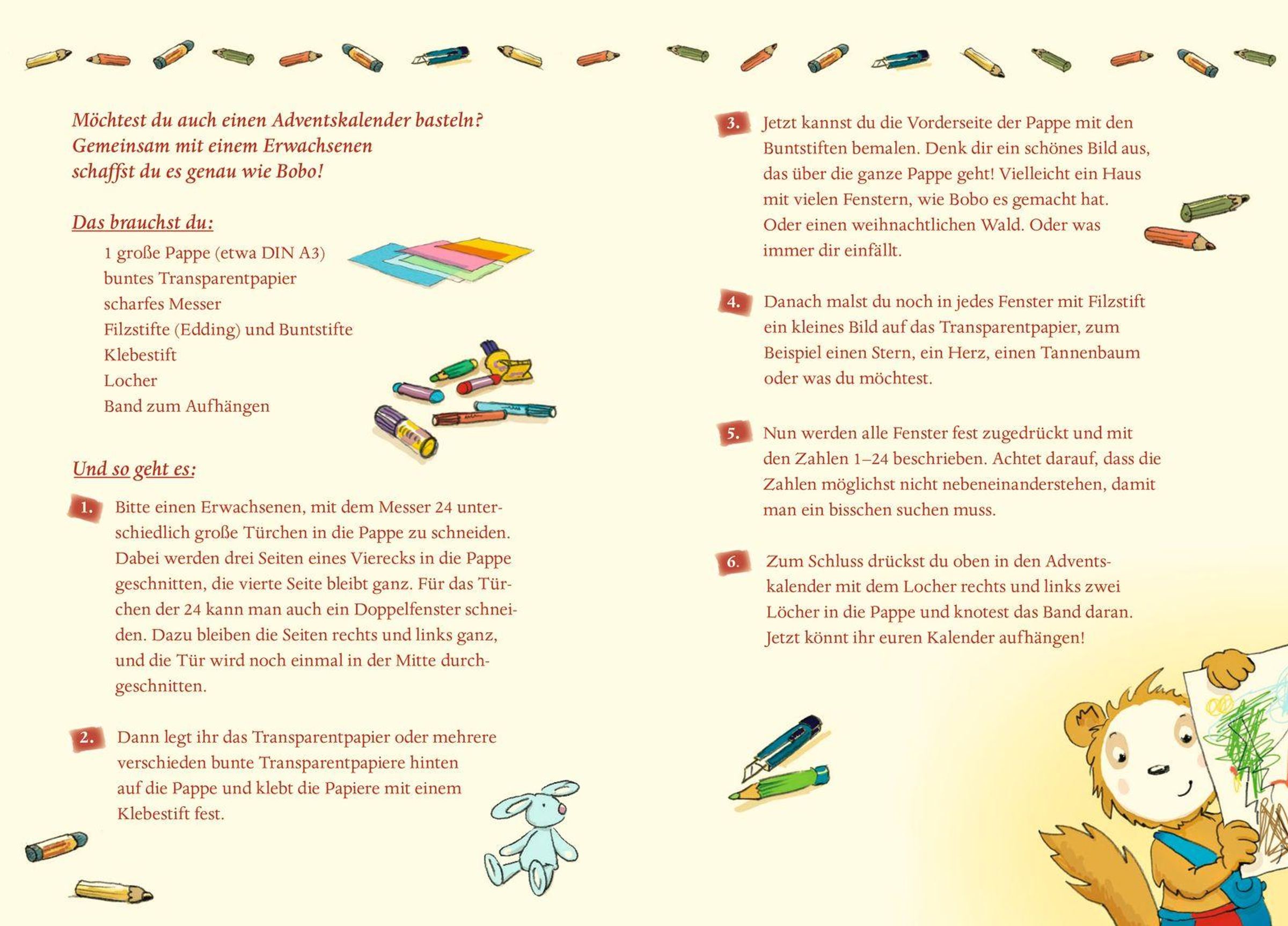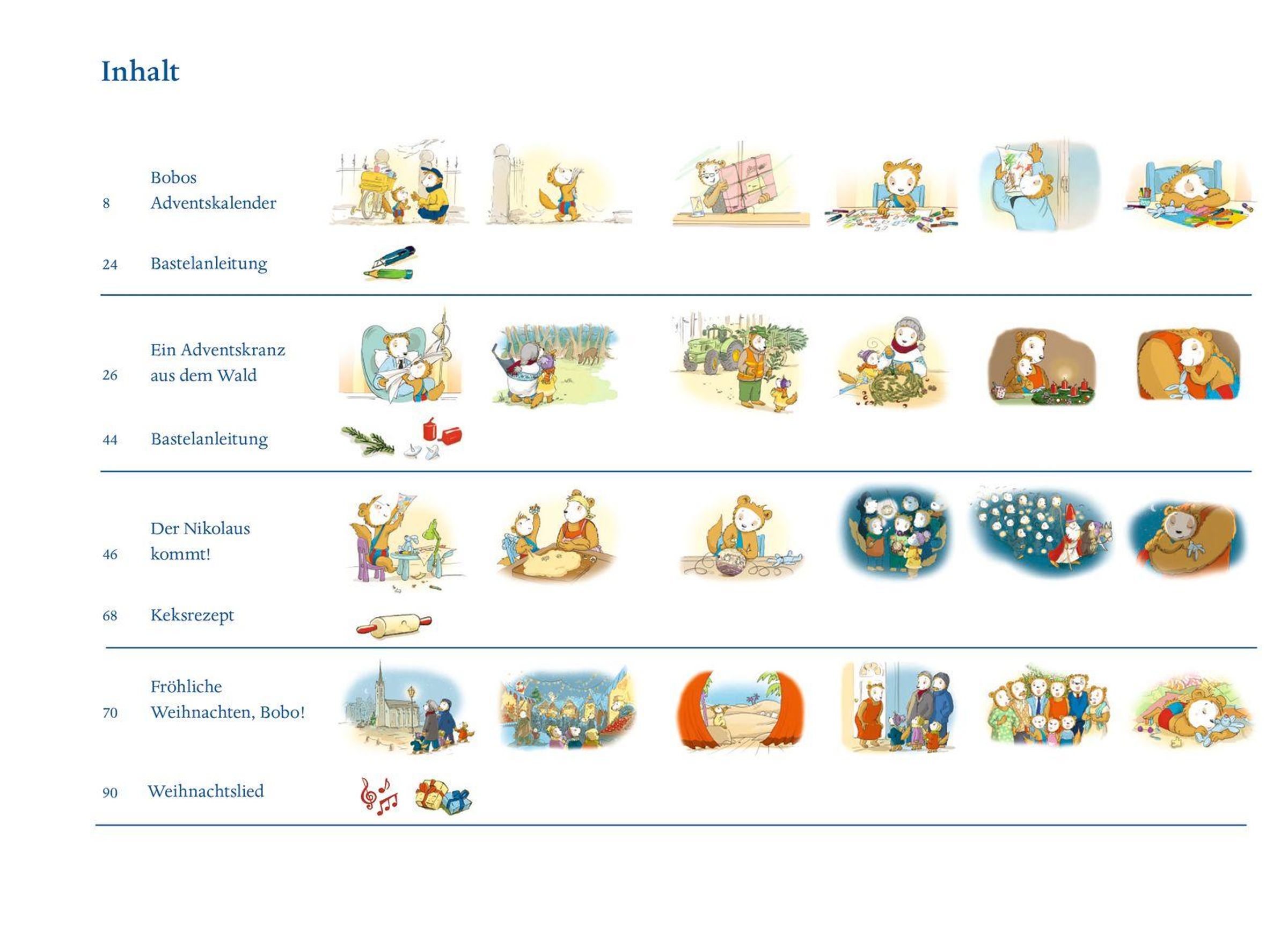 In vier neuen Geschichten erlebt der kleine Bobo Siebenschläfer die schöne Zeit bis zum Weihnachtsfest - und sein kleiner Kuschelhase ist immer mit dabei. So bastelt Bobo zum Beispiel mit Papa Siebenschläfer einen tollen Adventskalender, sammelt im Wald Tannenzapfen und Zweige für einen selbstgemachten Adventskranz, erlebt einen aufregenden Nikolausumzug, backt leckere Kekse und besucht sogar ein richtiges Weihnachtstheater - bis schließlich die Bescherung gekommen ist. Am Ende jeder Geschichte schläft Bobo wie gewohnt zufrieden ein. So macht das Warten auf Weihnachten Spaß!