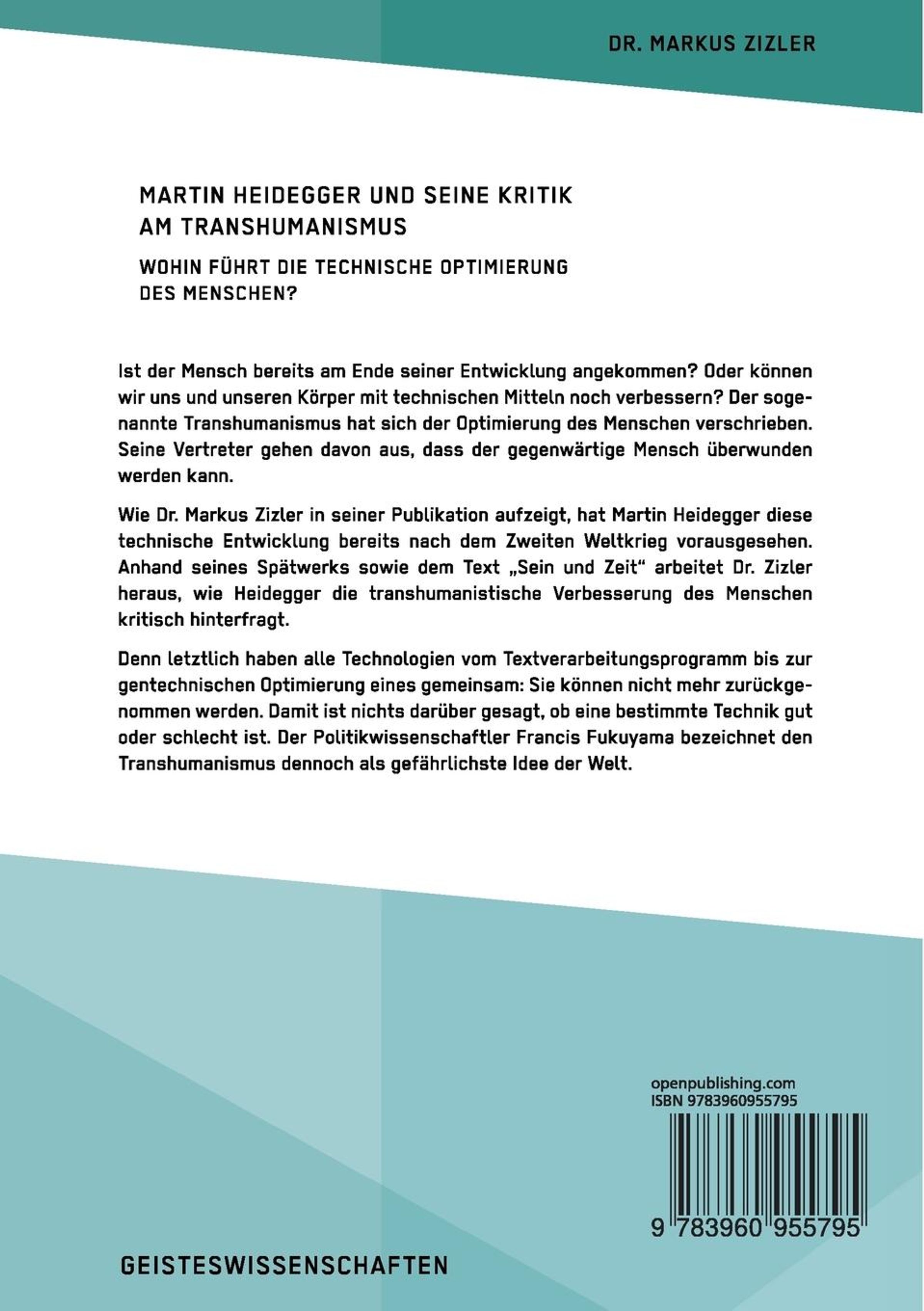 Wie Dr. Markus Zizler in seiner Publikation aufzeigt, hat Martin Heidegger diese technische Entwicklung bereits nach dem Zweiten Weltkrieg vorausgesehen. Anhand seines Spätwerks sowie dem Text ¿Sein und Zeit¿ arbeitet Dr. Zizler heraus, wie Heidegger die transhumanistische Verbesserung des Menschen kritisch hinterfragt.