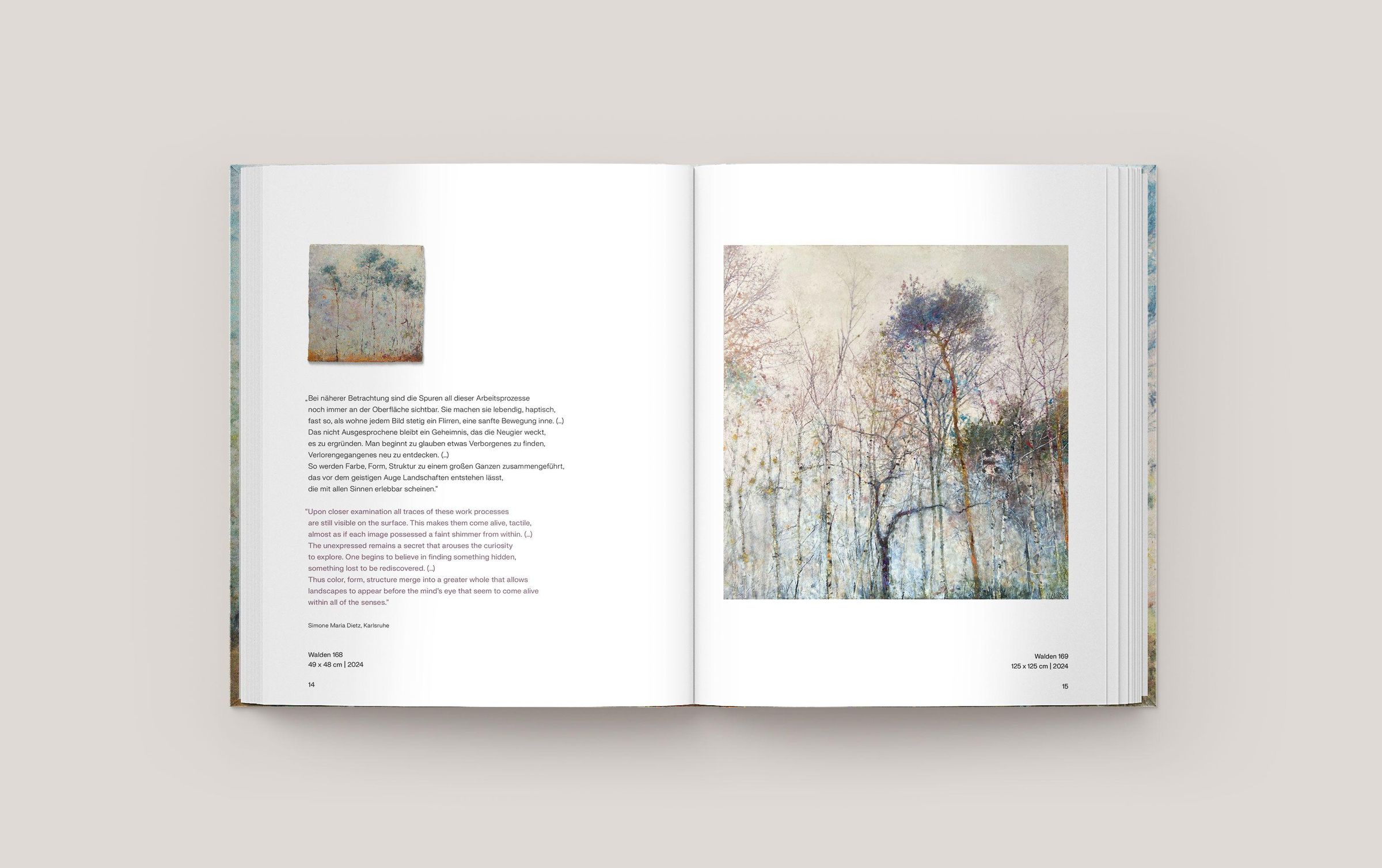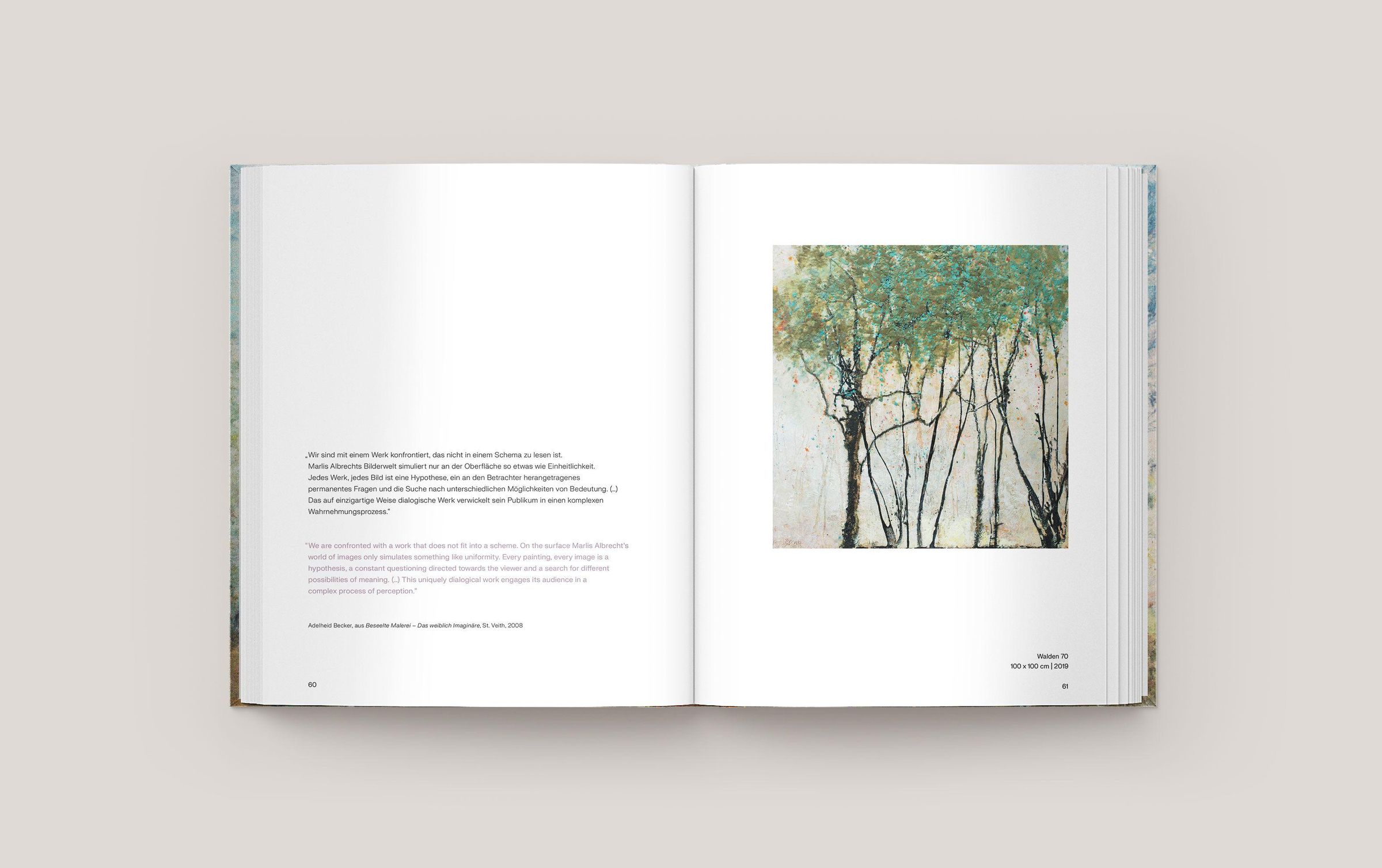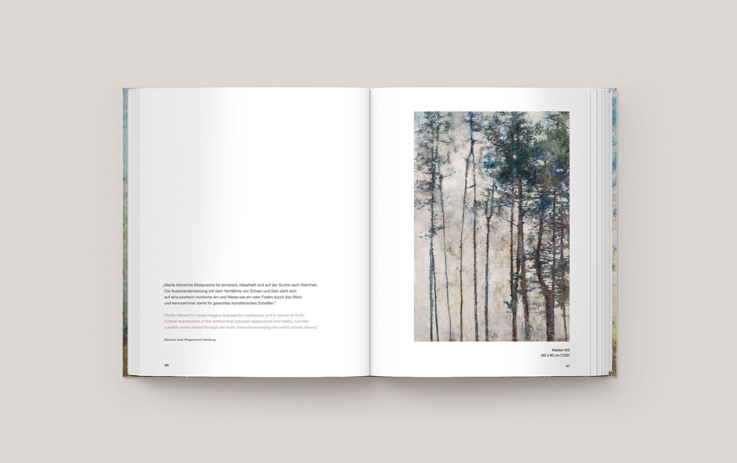 Der Band "Zwischen Bäumen" gibt Einblicke in einen Schaffensschwerpunkt der Künstlerin Marlis Albrecht, die Beschäftigung mit dem Wald. Kennzeichnend für ihre Kunst ist die Arbeit mit dem Naturstoff Bienenwachs, worin es Marlis Albrecht über die Jahrzehnte zur Meisterschaft gebracht hat. Für ihre komplexen, teils großformatigen Bildwerke verwendet sie neben dem erhitzten Wachs, das mit Pigmenten vermischt wird, weitere Materialien wie Tusche, Kreide und Kaltwachstempera. Ihre durchscheinende Wirkung und besondere Tiefe erhalten die Werke durch vielfältige Bearbeitung, Übereinanderlegen und wieder Abtragen einzelner Schichten.