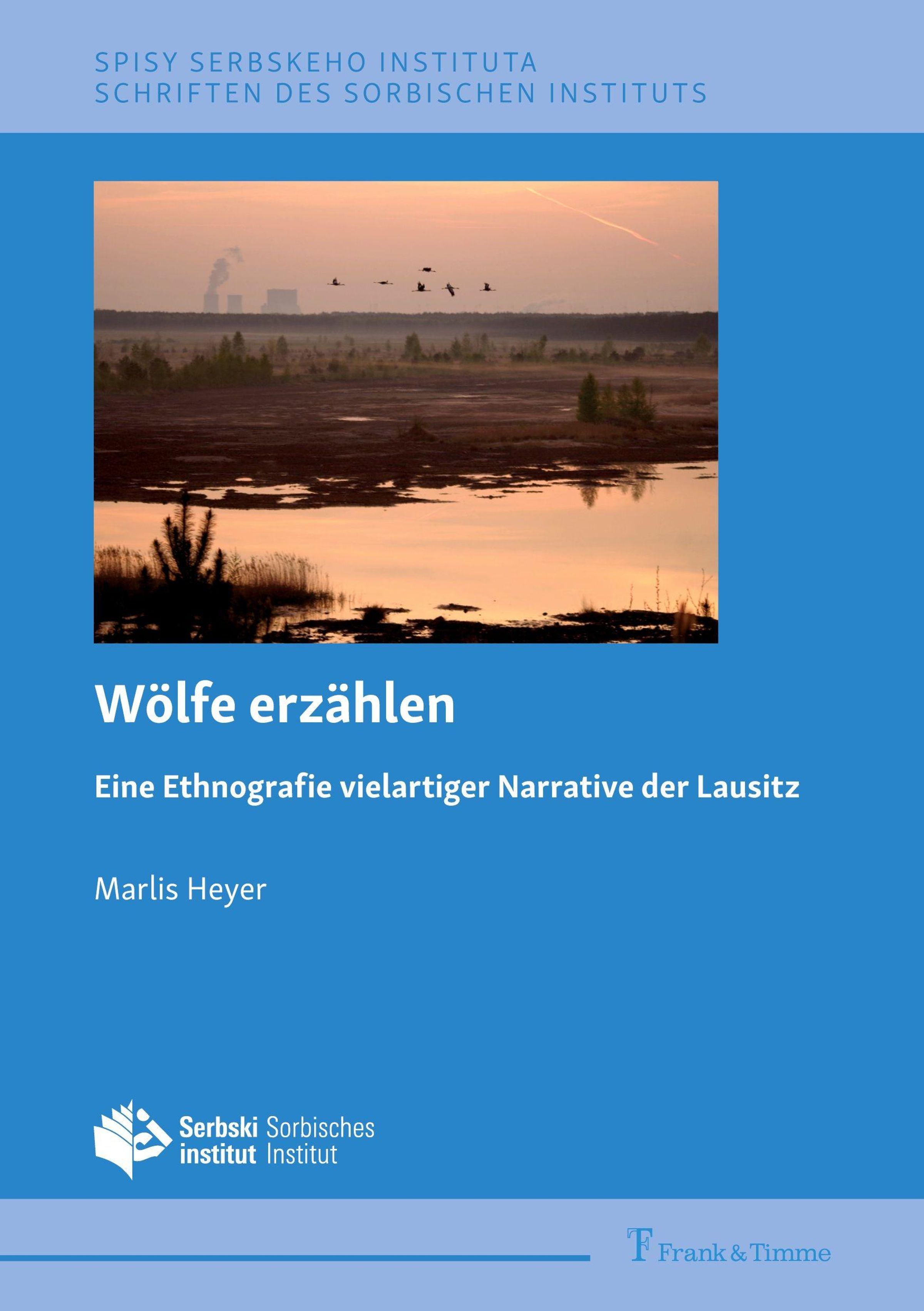 "Wölfe erzählen" von Marlis Heyer. Oben Horizont mit fliegenden Vögeln. Logo: Serbski institut, Sorbisches Institut., Buch