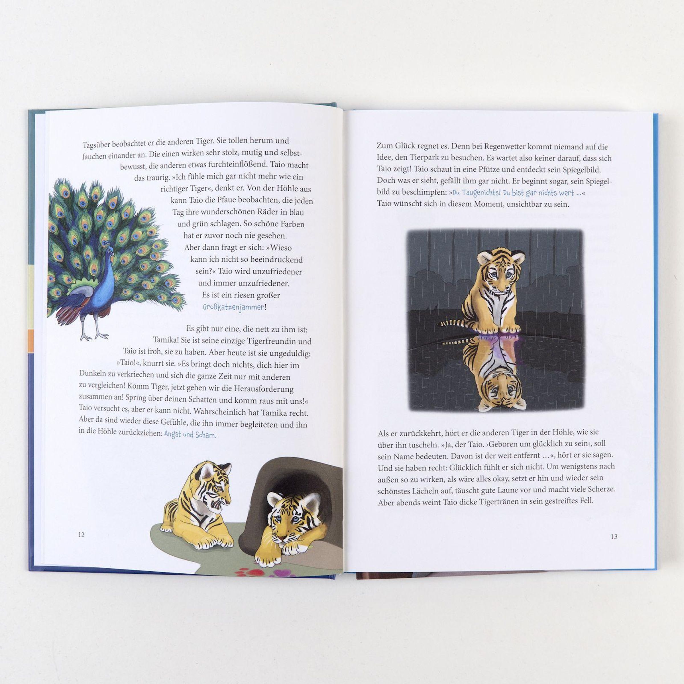 Tiger Taio ist da - und zwar mit bunten Pfotenspuren! Das hört sich lebendig und glücklich an? Ist es aber zu Beginn ganz und gar nicht. Denn Taio ist mies drauf. Er zieht sich zurück und dunkle Gedanken füllen seinen Kopf. Könnte er doch nur sein wie die anderen ... Eines nachts reicht es ihm und er beschließt, auszubrechen. Doch statt aus dem Tierpark bricht er aus seiner grauen Gedankenwelt aus, findet Vertrauen in sich und andere und kommt seinem eigenen Selbstwert auf eine immer buntere Spur.