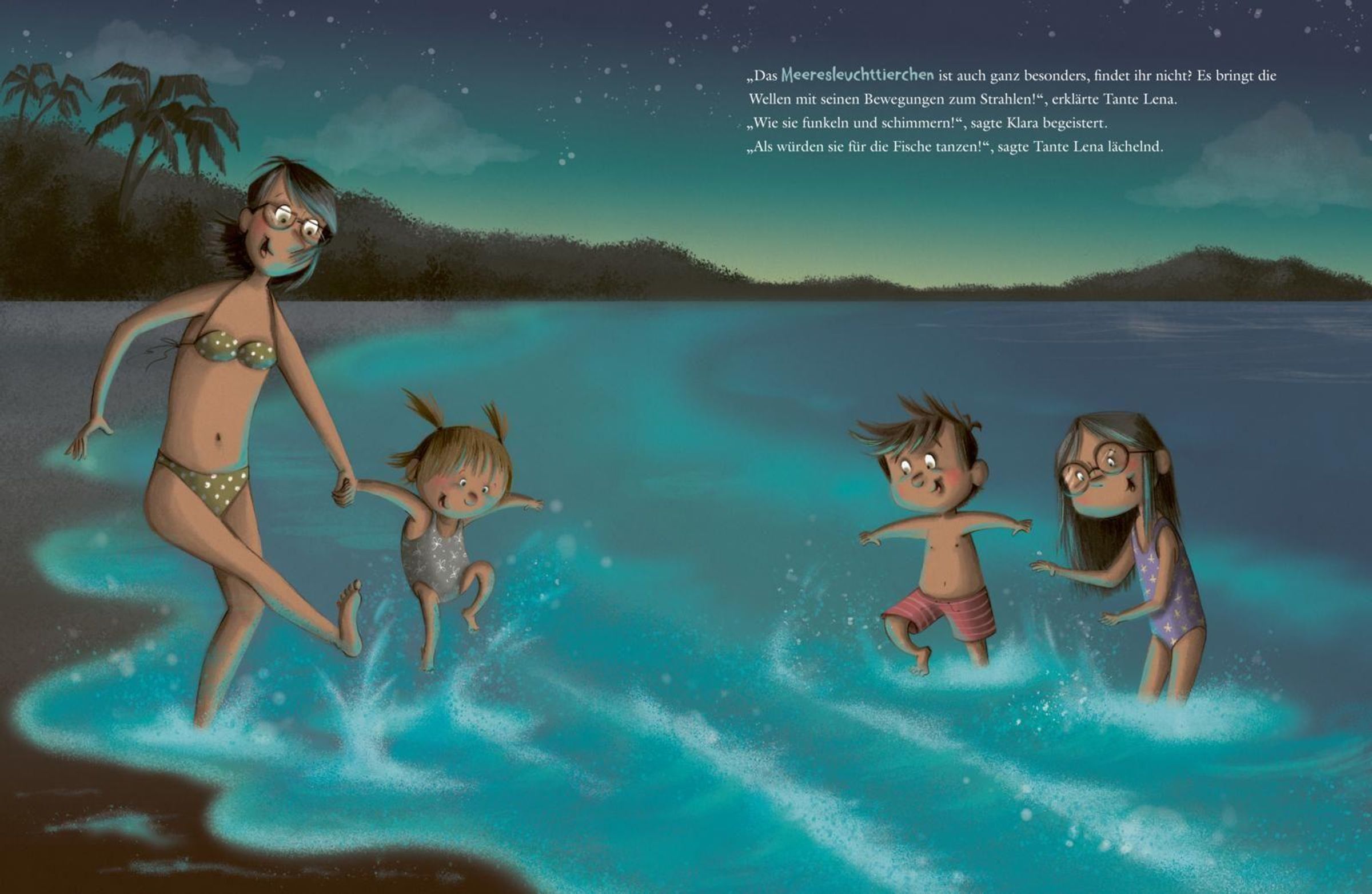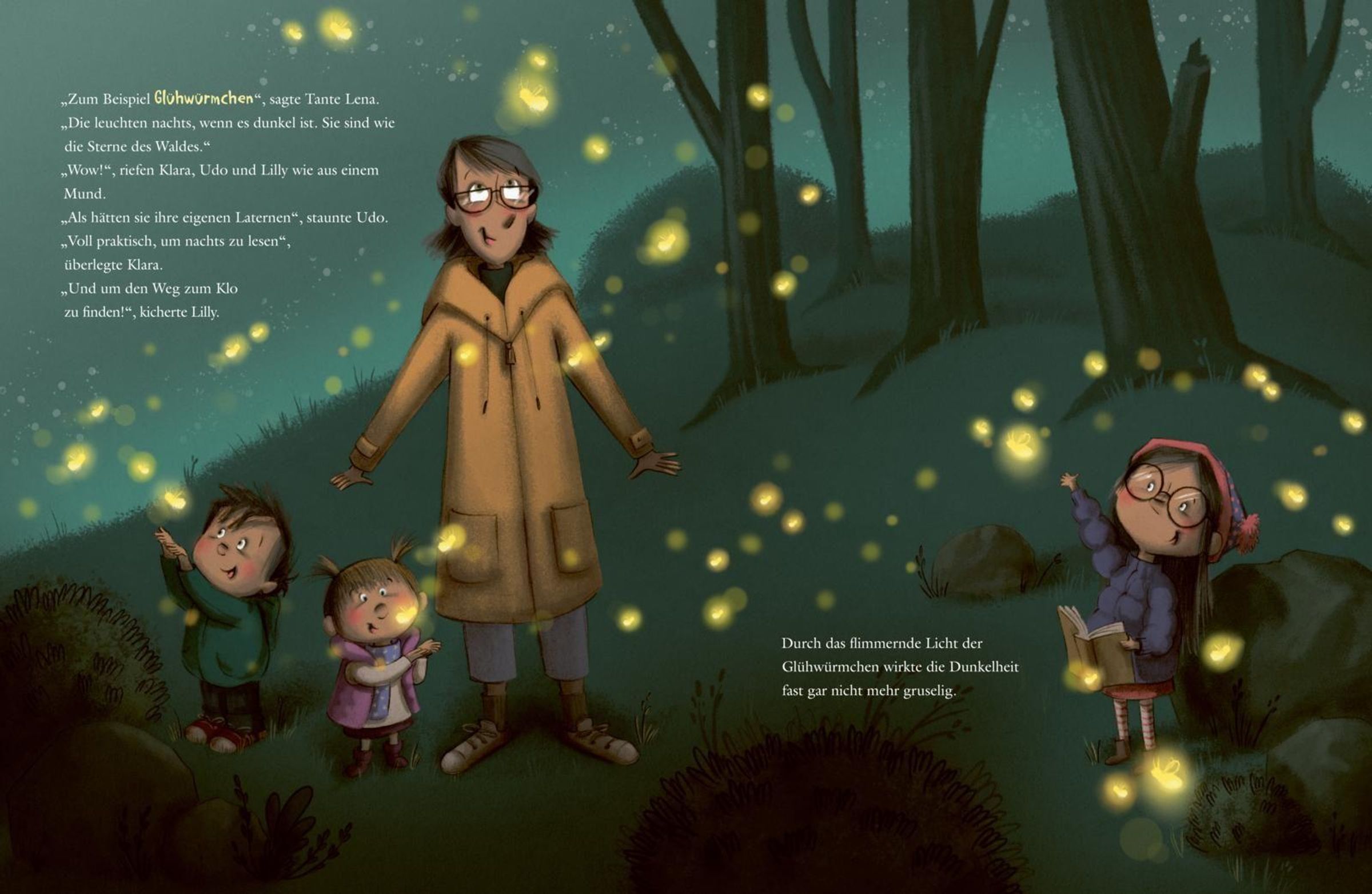 Wenn es nachts dunkel wird, kann es ganz schön unheimlich sein. Das finden die Geschwister Klara, Lilly und Udo jedenfalls, als sie bei einem Hütten-Wochenende mit ihrer Tante Lena hinter jedem dunklen Schatten ein Monster vermuten. Zunächst macht den Kindern die Dunkelheit Angst. Dabei brauchen sie sich nicht zu fürchten. Denn ihre Tante Lena nimmt die Geschwister mit auf eine Reise durch die leuchtenden Phänomene der Natur. Und die sind erst dann so wunderschön und beginnen zu leuchten, wenn es dunkel ist. Und bei diesen Wunderlichtern im Dunkeln braucht wohl niemand mehr ängstlich sein.