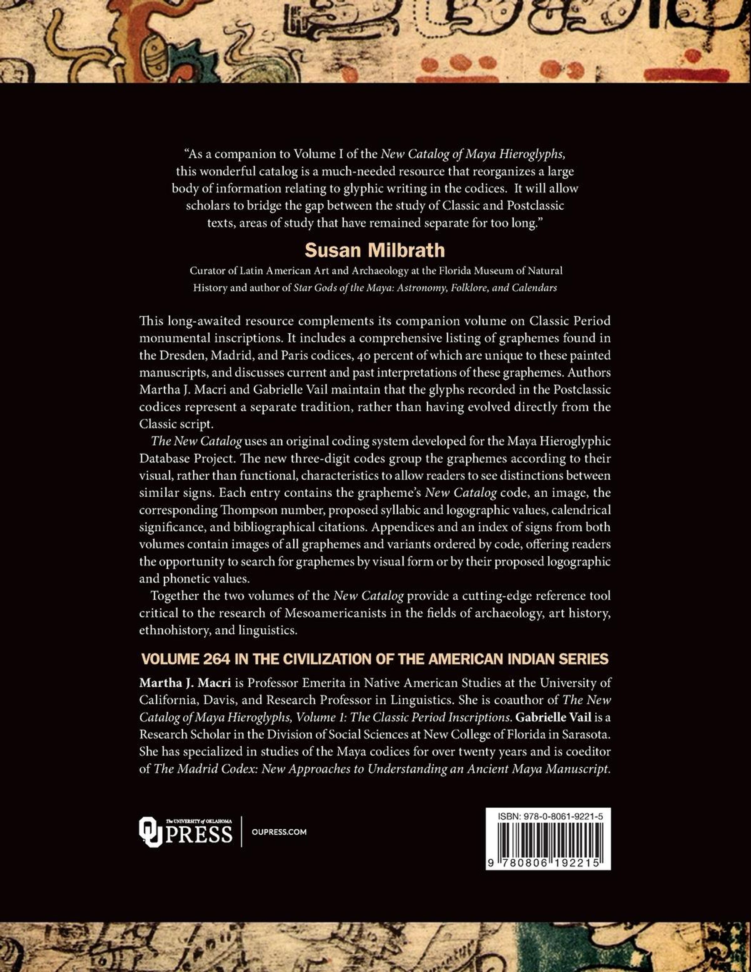 This long-awaited resource complements its companion volume on Classic Period monumental inscriptions. Authors Martha J. Macri and Gabrielle Vail provide a comprehensive listing of graphemes found in the Dresden, Madrid, and Paris codices, 40 percent of which are unique to these painted manuscripts, and discuss current and past interpretations of these graphemes. The New Catalog uses an original coding system developed for the Maya Hieroglyphic Database Project. The new three-digit codes group the graphemes according to their visual, rather than functional, characteristics to allow readers to see distinctions between similar signs. Each entry contains the grapheme's New Catalog code, an image, the corresponding Thompson number, proposed syllabic and logographic values, calendrical significance, and bibliographical citations. Appendices and an index of signs from both volumes contain images of all graphemes and variants ordered by code, allowing readers to search for graphemes by visual form or by their proposed logographic and phonetic values. Together the two volumes of the New Catalog represent the most significant updating of the sign lists for the Maya script proposed in half a century. They provide a cutting-edge reference tool critical to the research of Mesoamericanists in the fields of archaeology, art history, ethnohistory, and linguistics, and a valuable resource to scholars specializing in comparative studies of writing systems and related disciplines.
